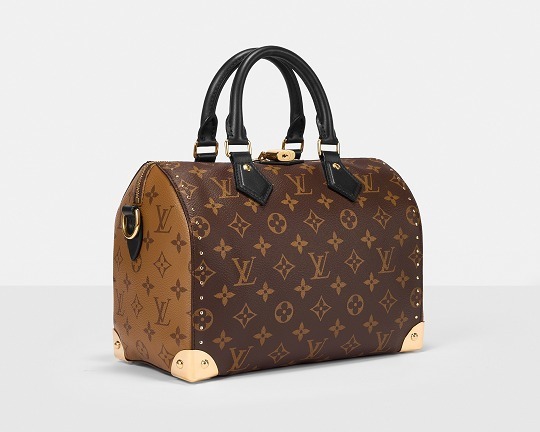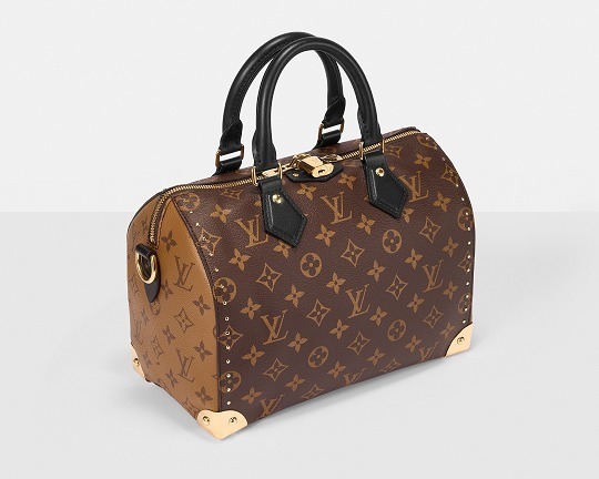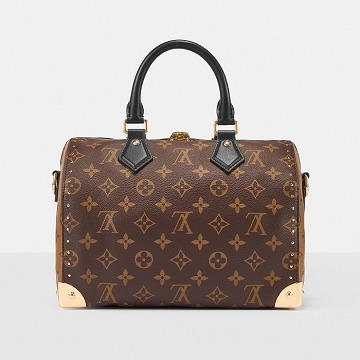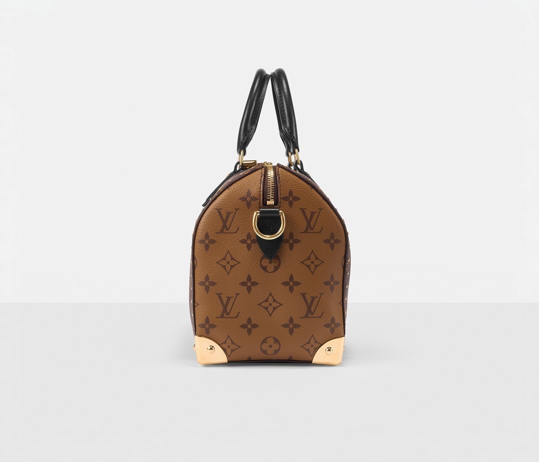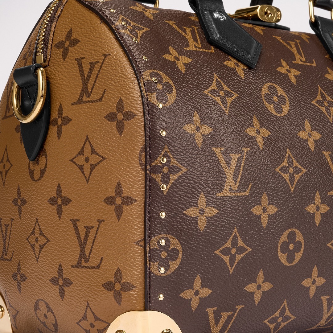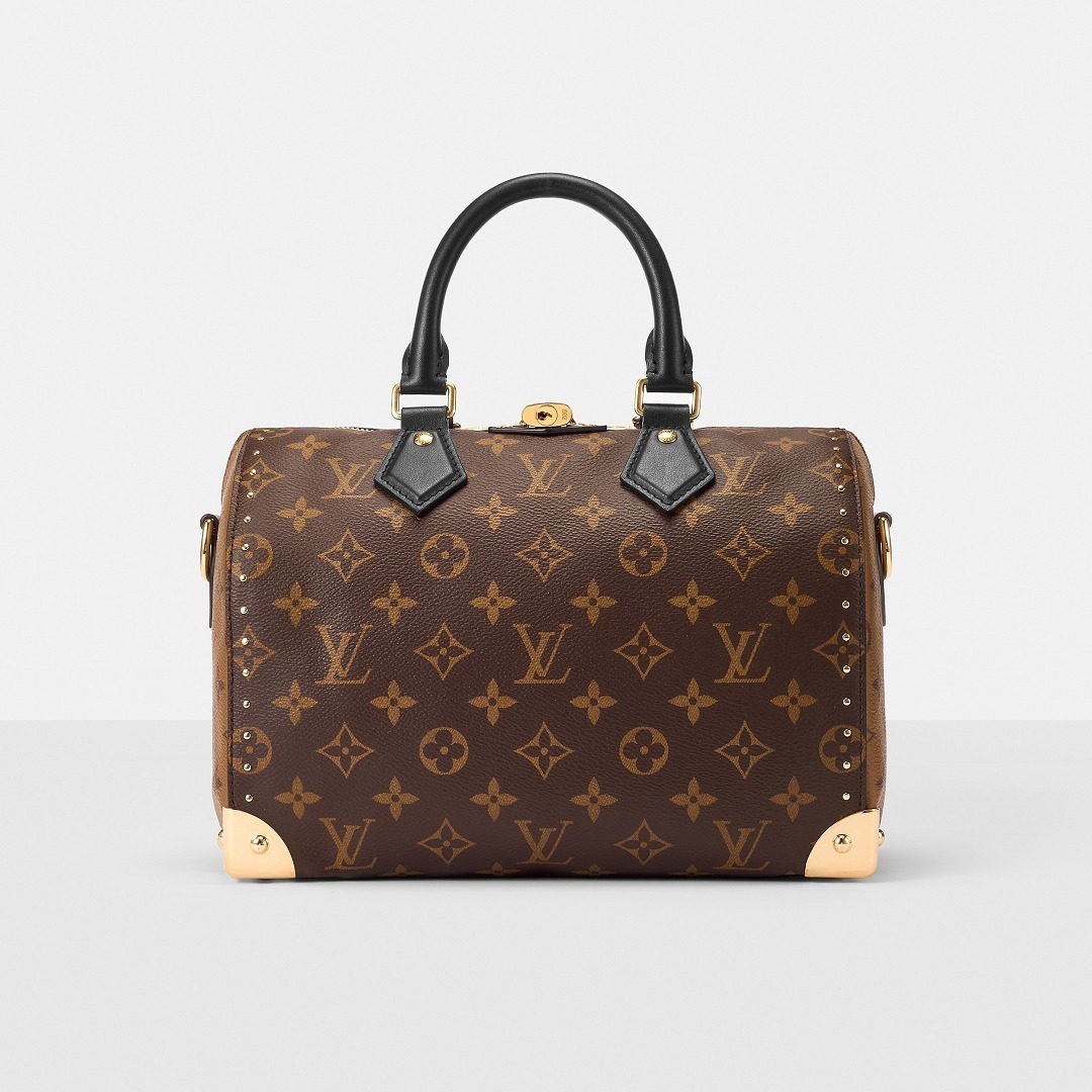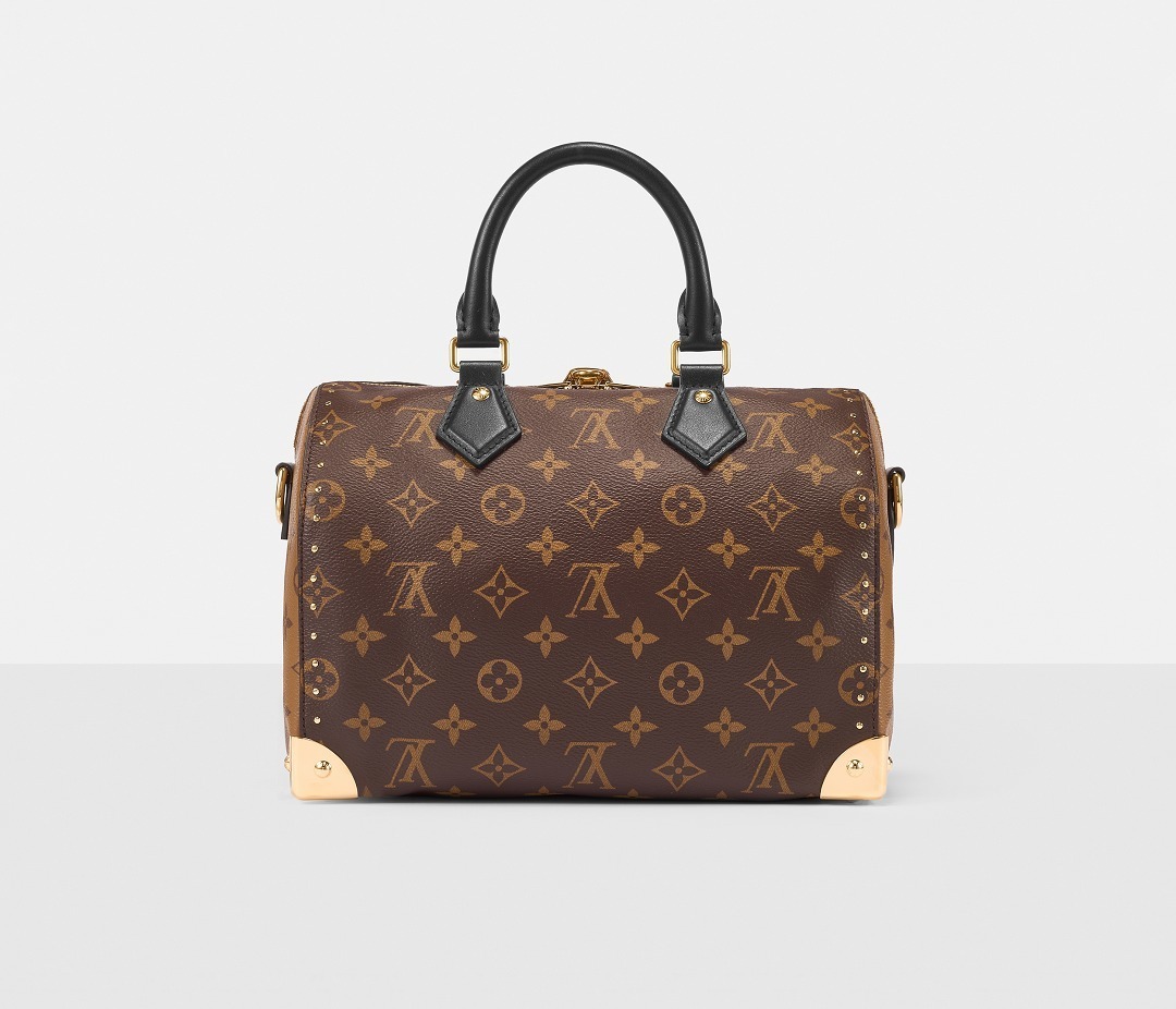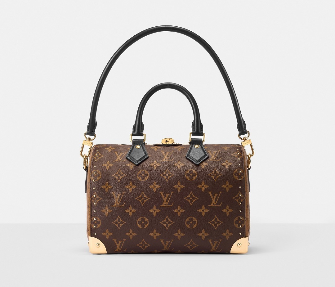 路易威登 Speedy Trunk 25 手袋巧妙融合 Speedy 手袋的实用波士顿包型和 Trunk 硬箱的金属包角设计,包包采用双色 Monogram 帆布塑造建筑般的轮廓,拱形手柄为包包注入优雅格调,展现古典美学与现代廓形的交汇。