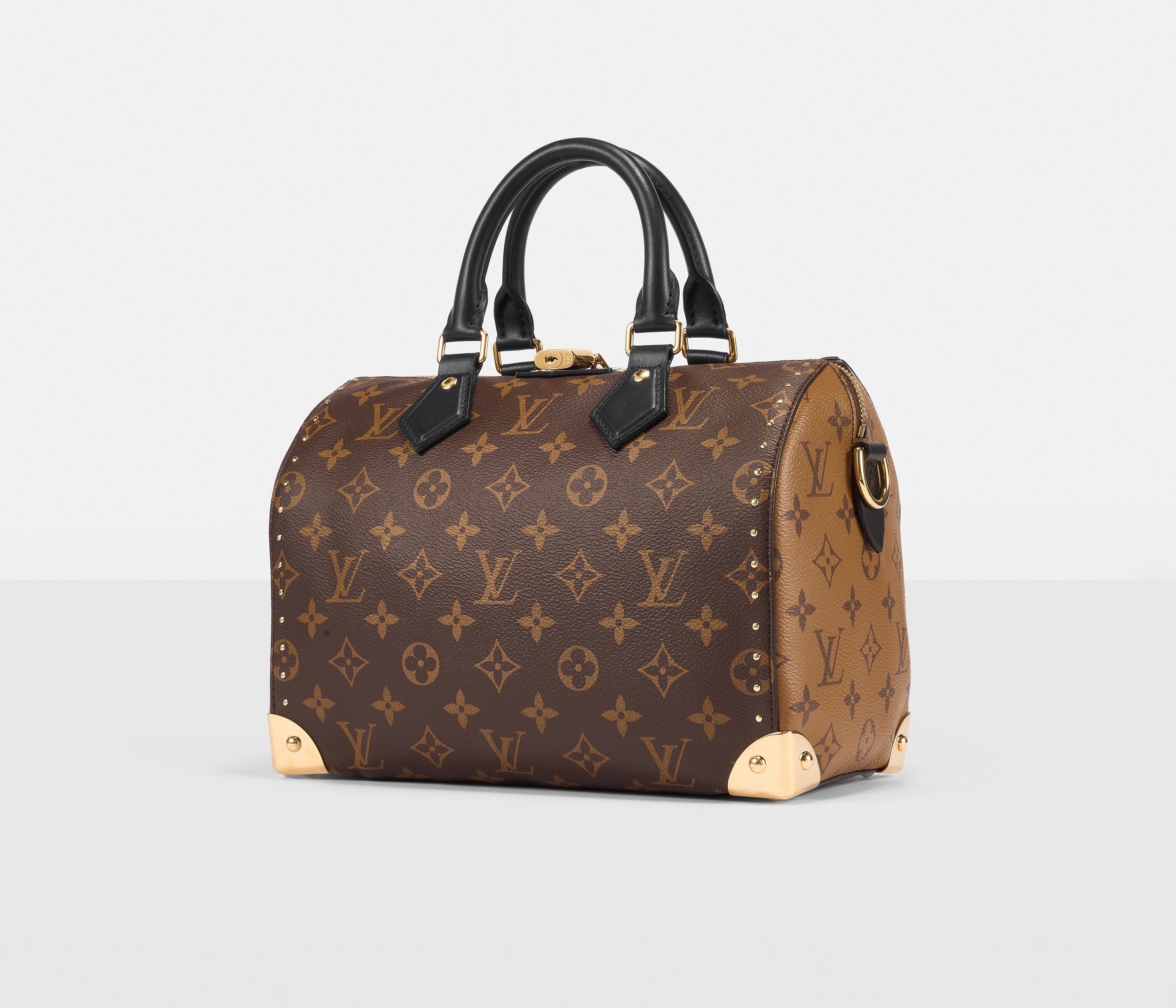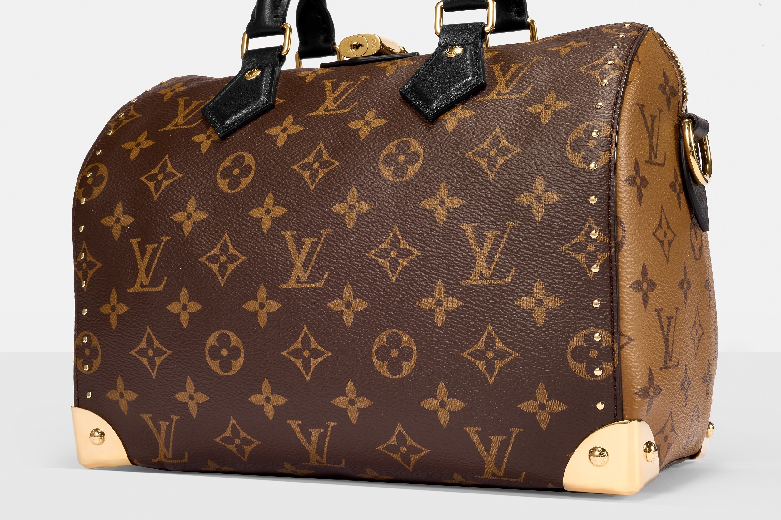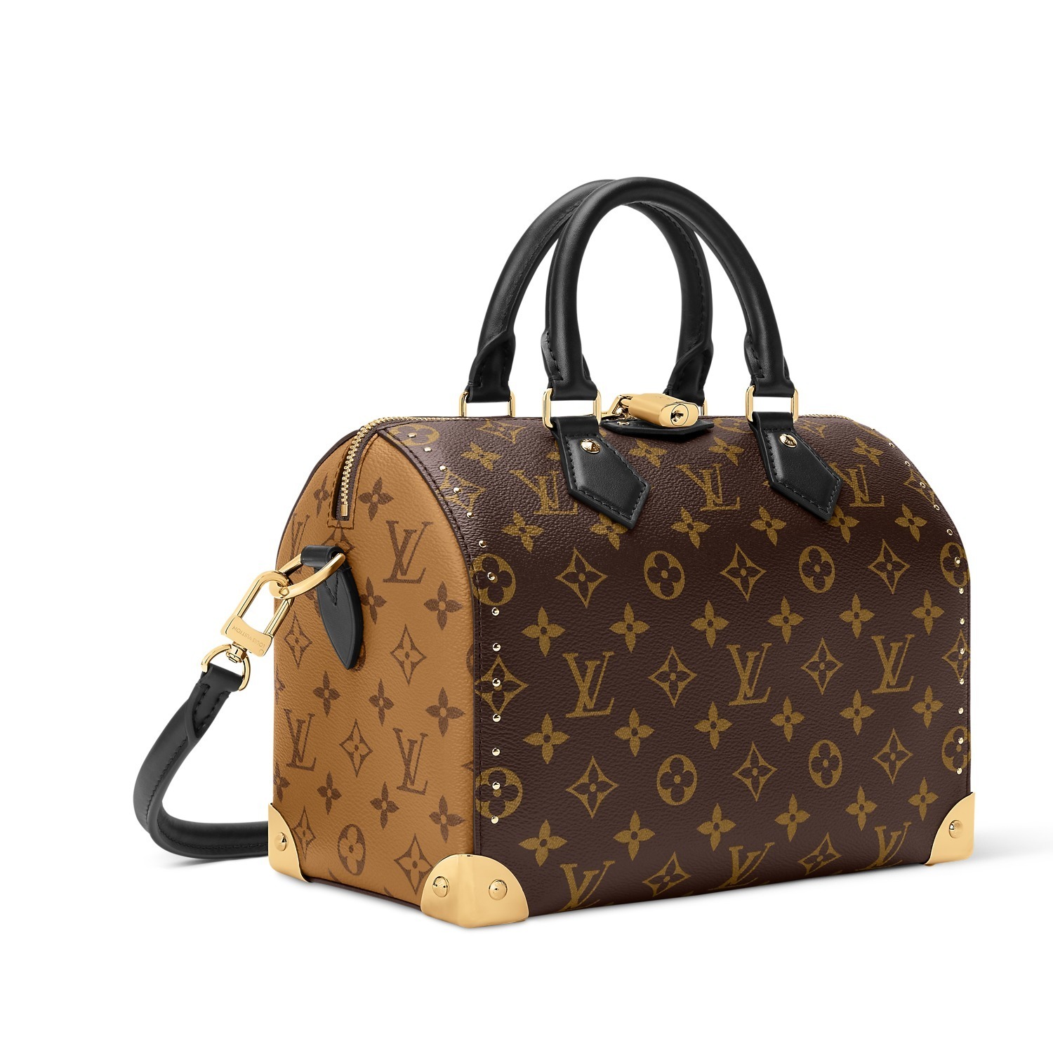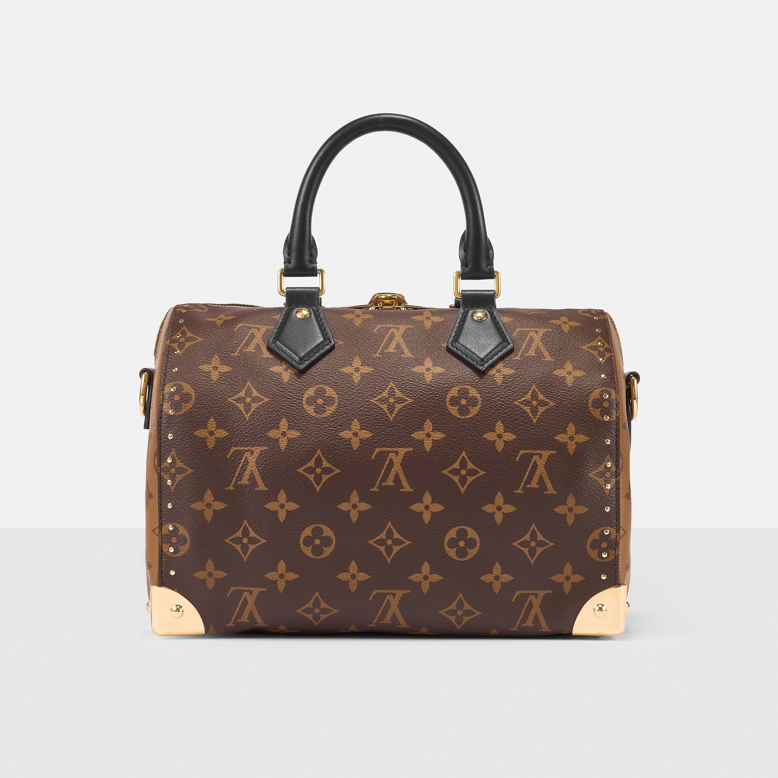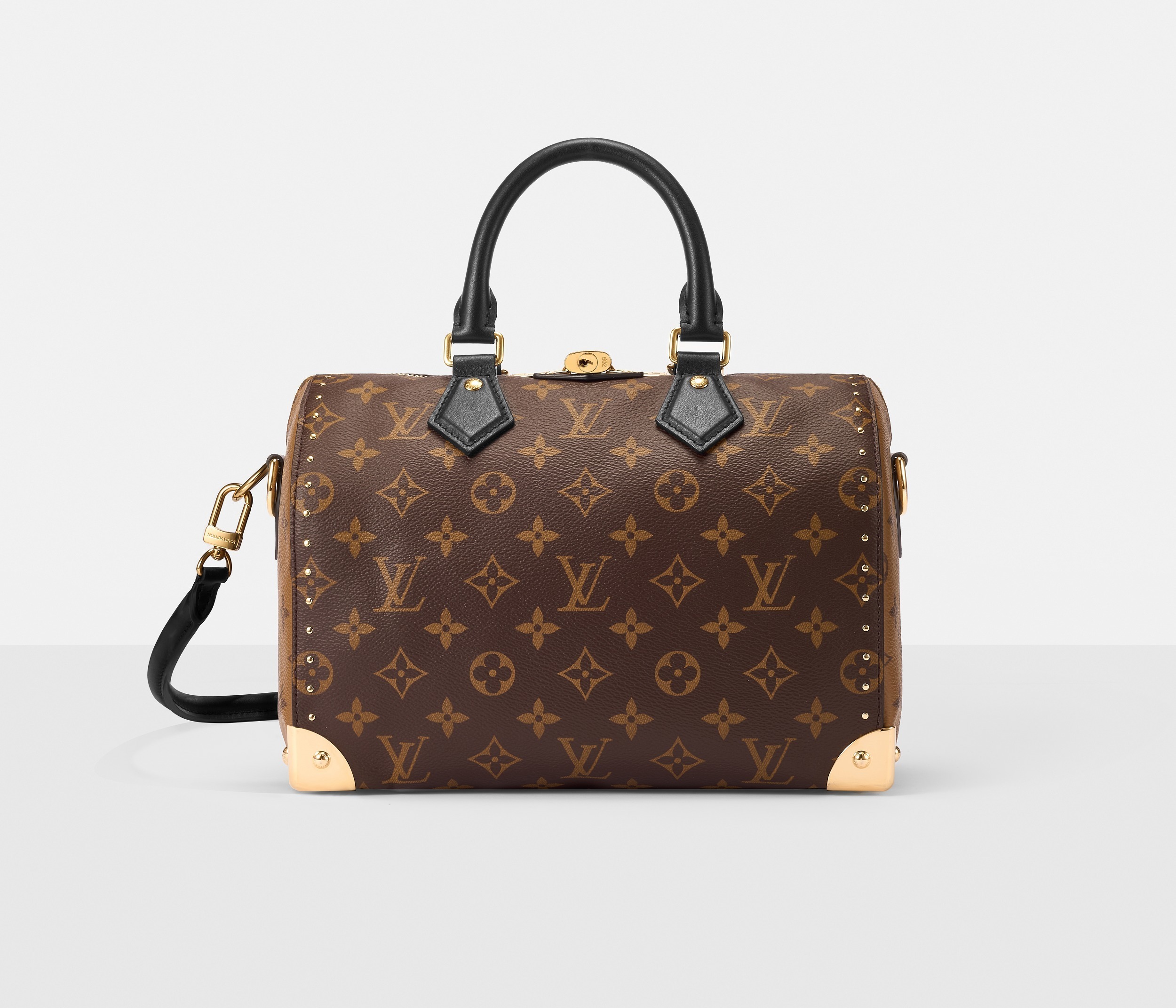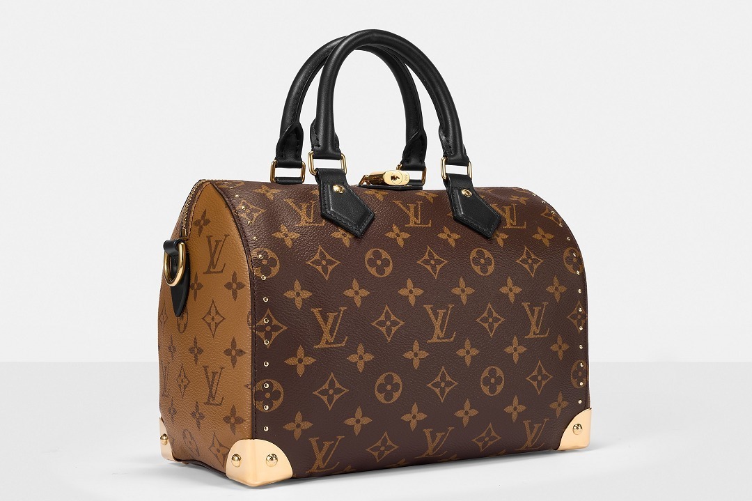 路易威登 Speedy Trunk 25 手袋巧妙融合 Speedy 手袋的实用波士顿包型和 Trunk 硬箱的金属包角设计,包包采用双色 Monogram 帆布塑造建筑般的轮廓,拱形手柄为包包注入优雅格调,展现古典美学与现代廓形的交汇。