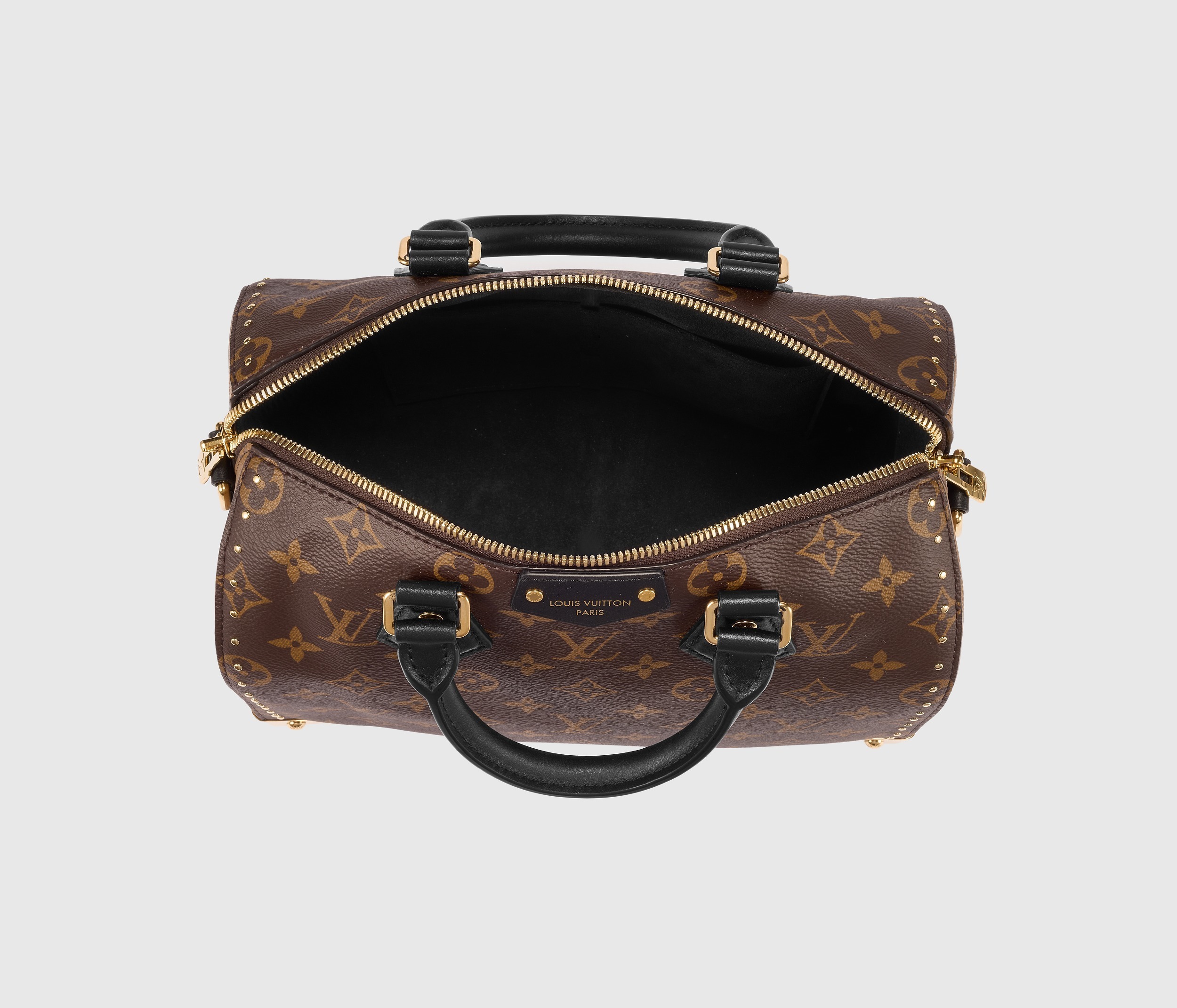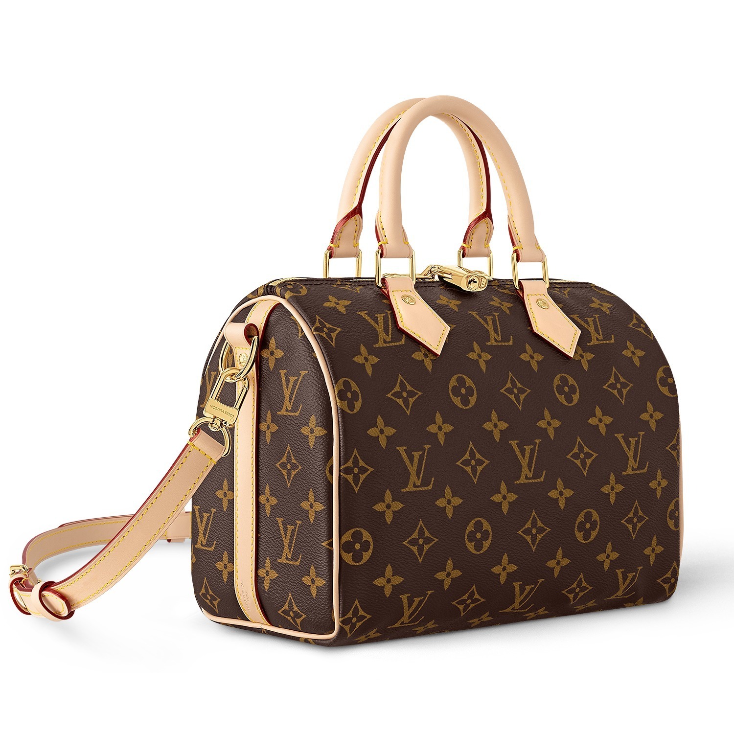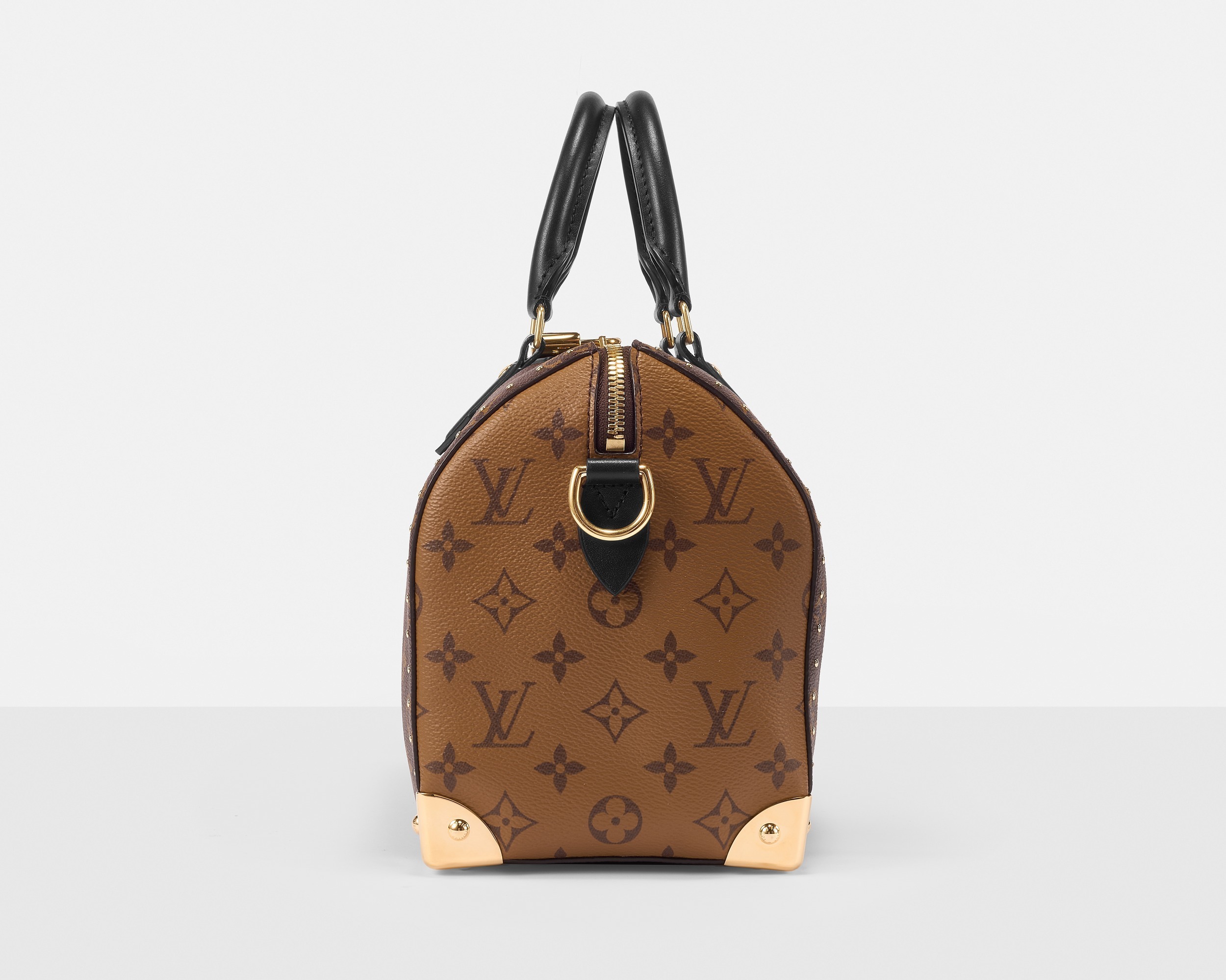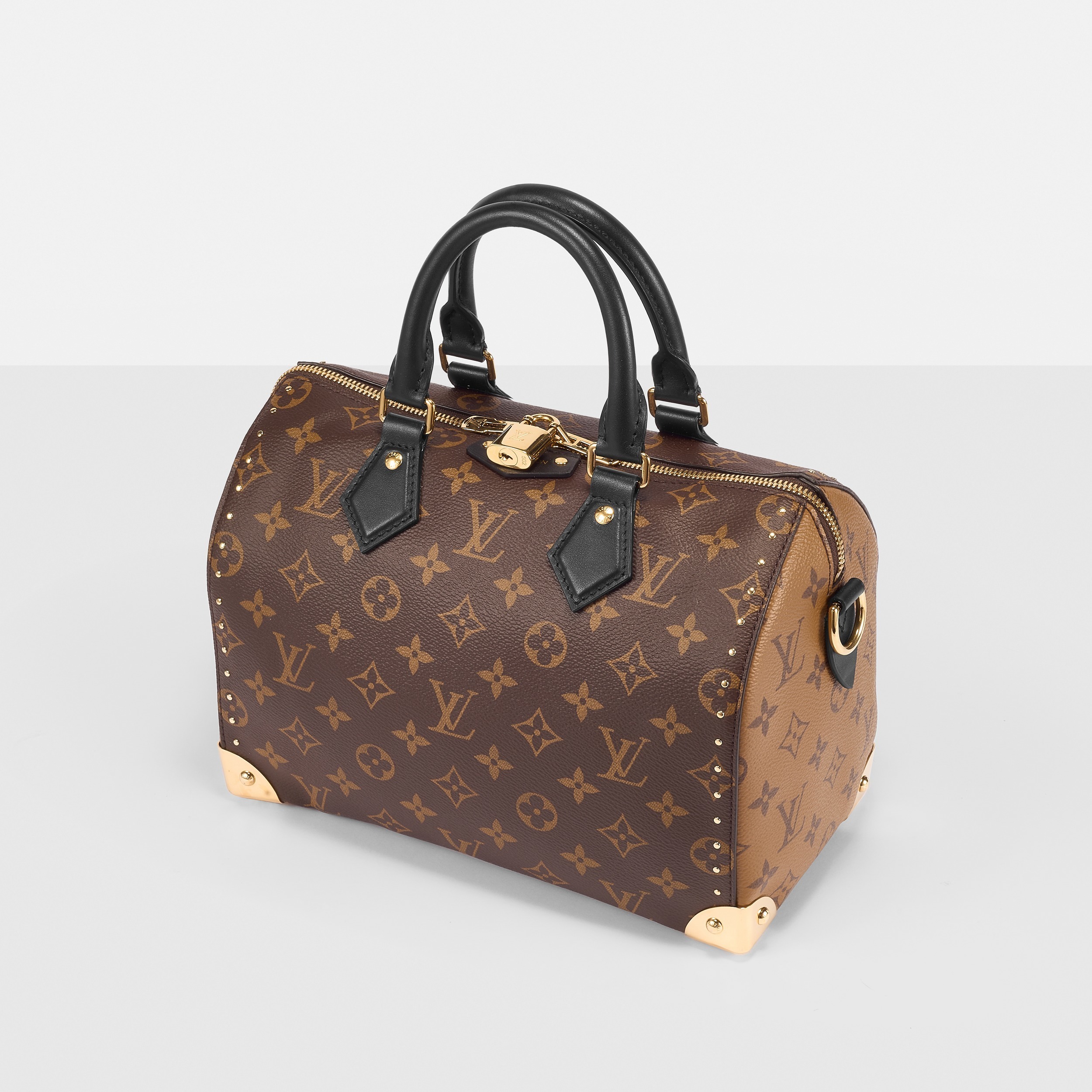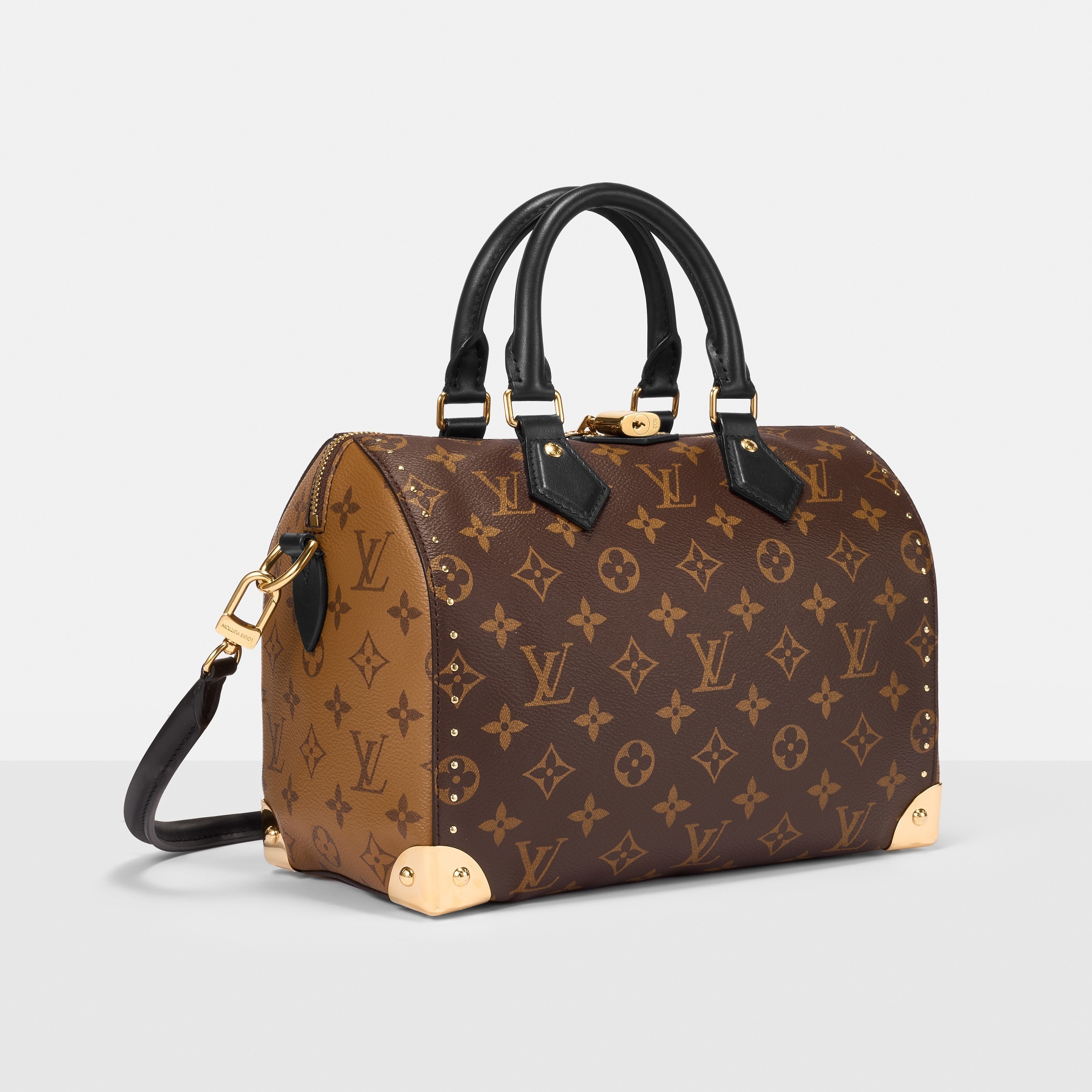 路易威登 Speedy Trunk 25 手袋巧妙融合 Speedy 手袋的实用波士顿包型和 Trunk 硬箱的金属包角设计,包包采用双色 Monogram 帆布塑造建筑般的轮廓,拱形手柄为包包注入优雅格调,展现古典美学与现代廓形的交汇。