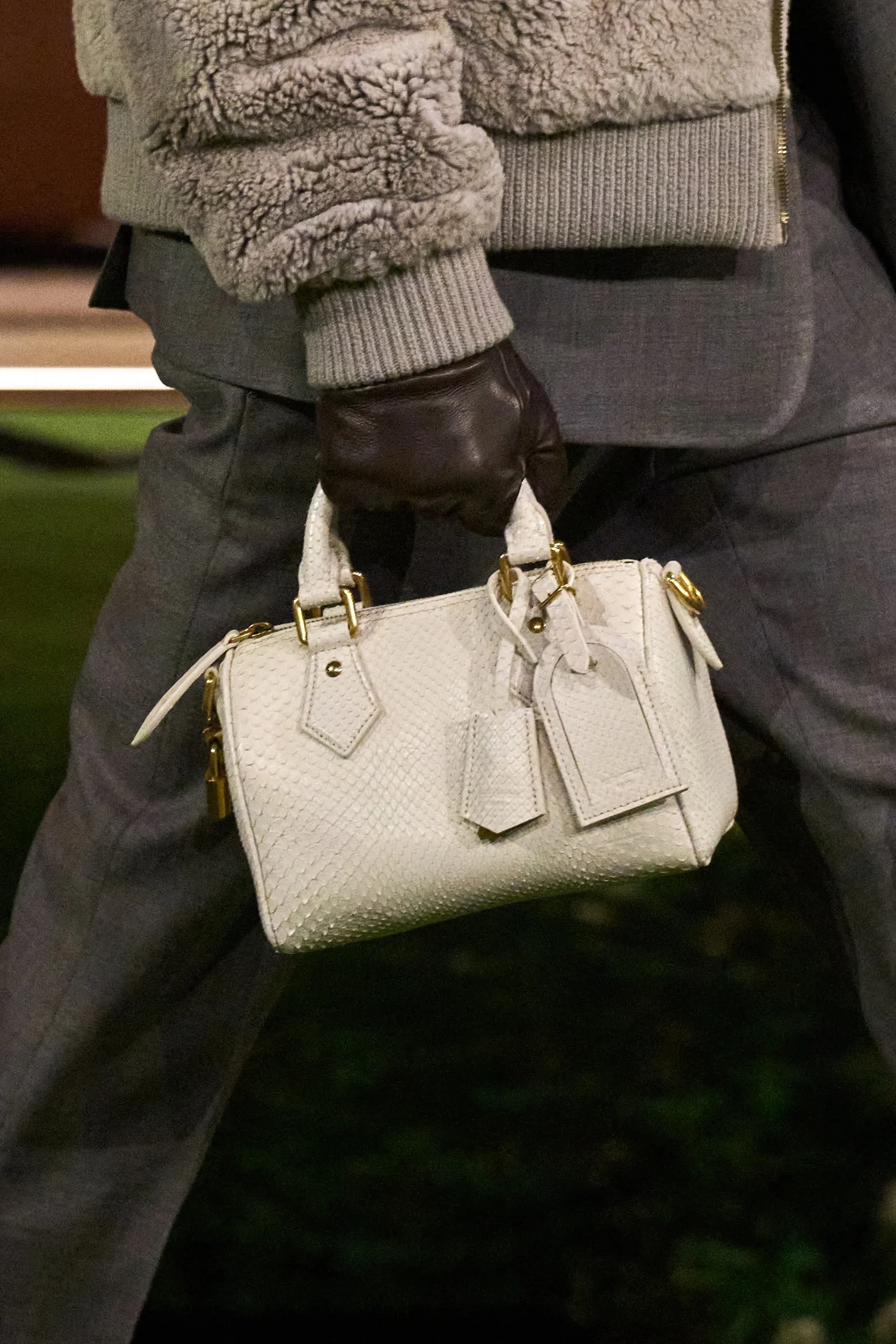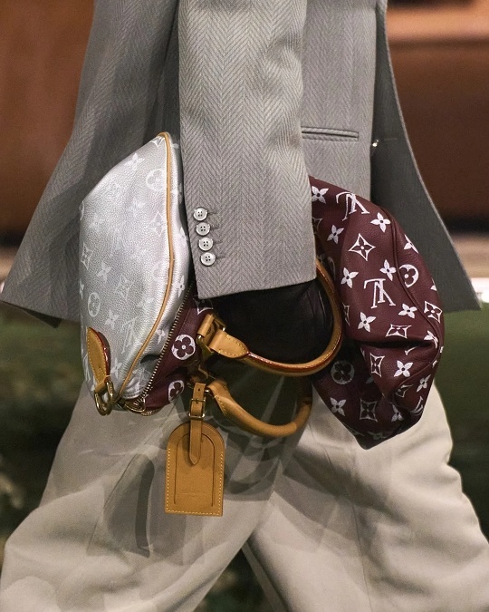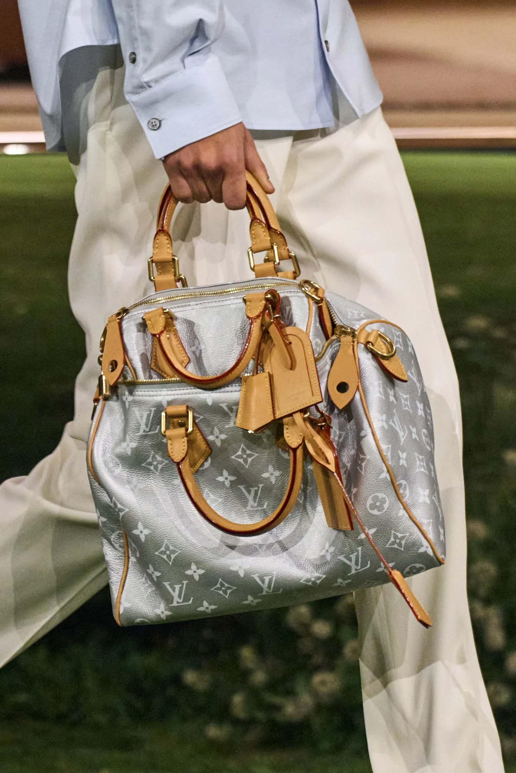 男士系列标志性 Speedy P9 手袋本季推出双面可翻转款式,一面采用苹果绿、无花果色、银色或云空蓝色 Buttersoft 皮革,另一面为纯色绗缝皮革,可拆卸金属手柄可灵活固定于任意一侧,提供25、30、40三种尺寸。