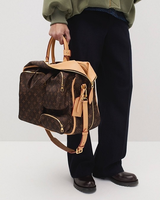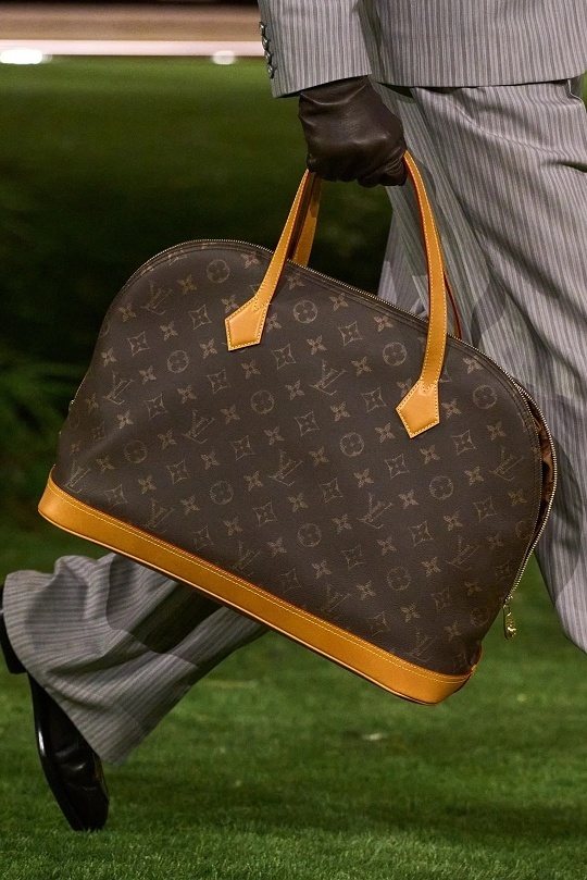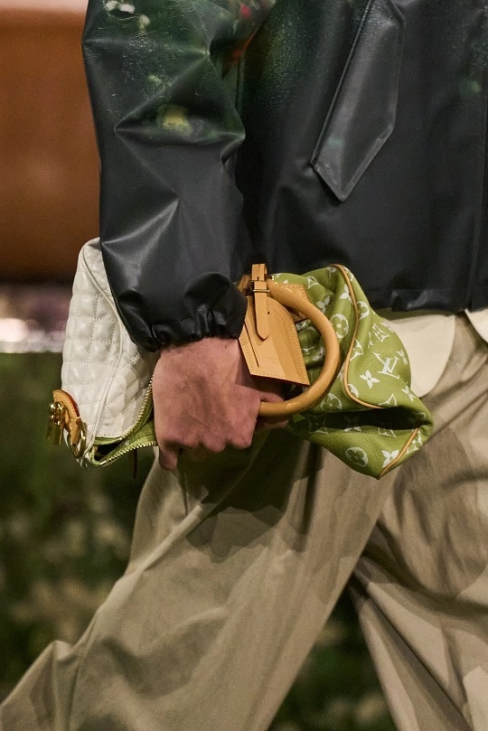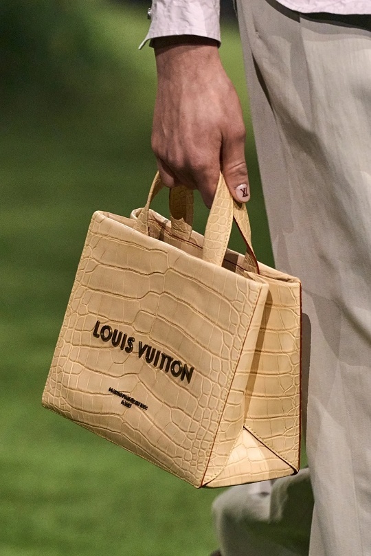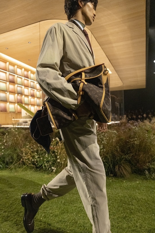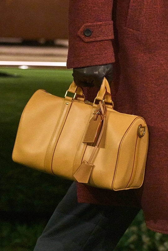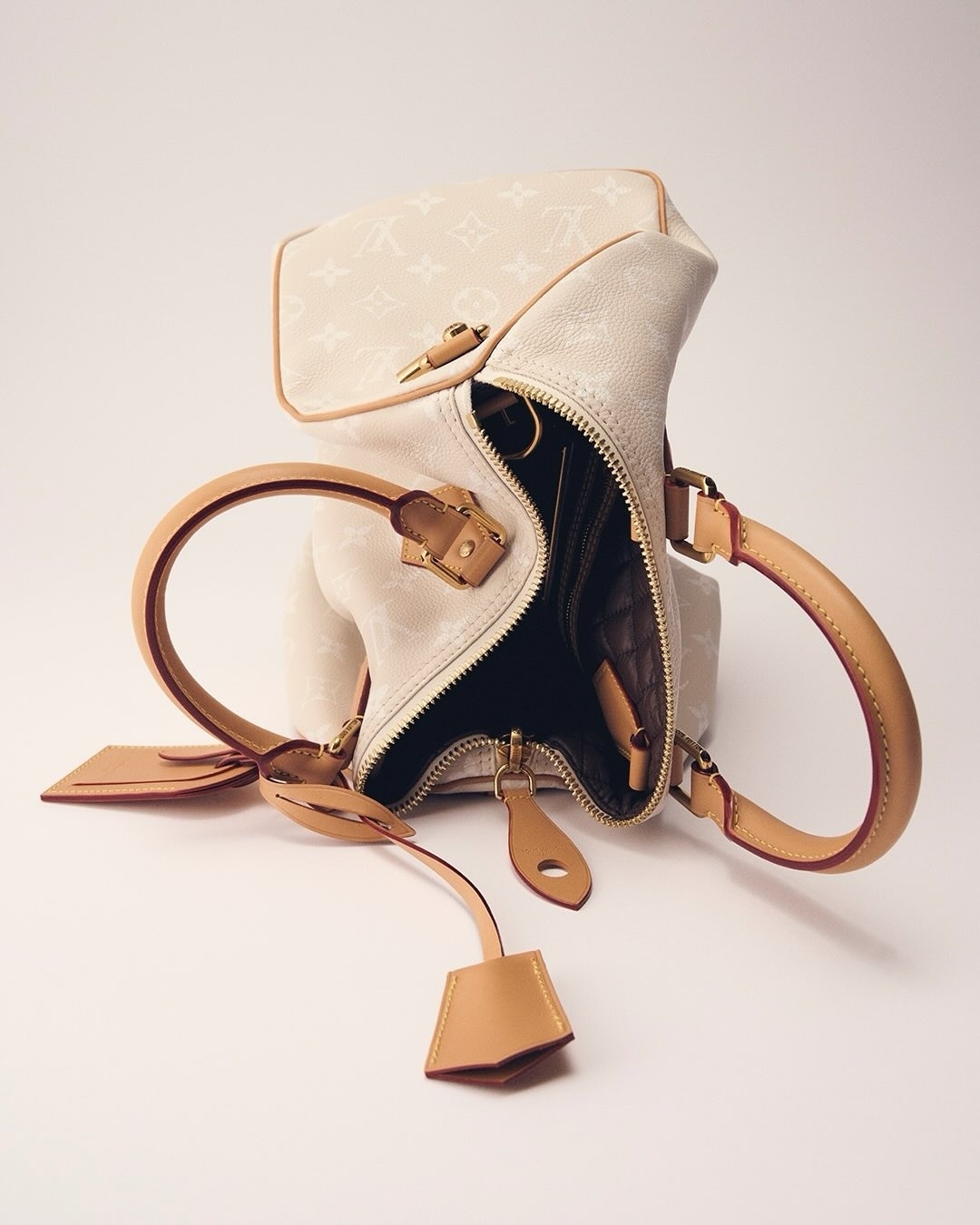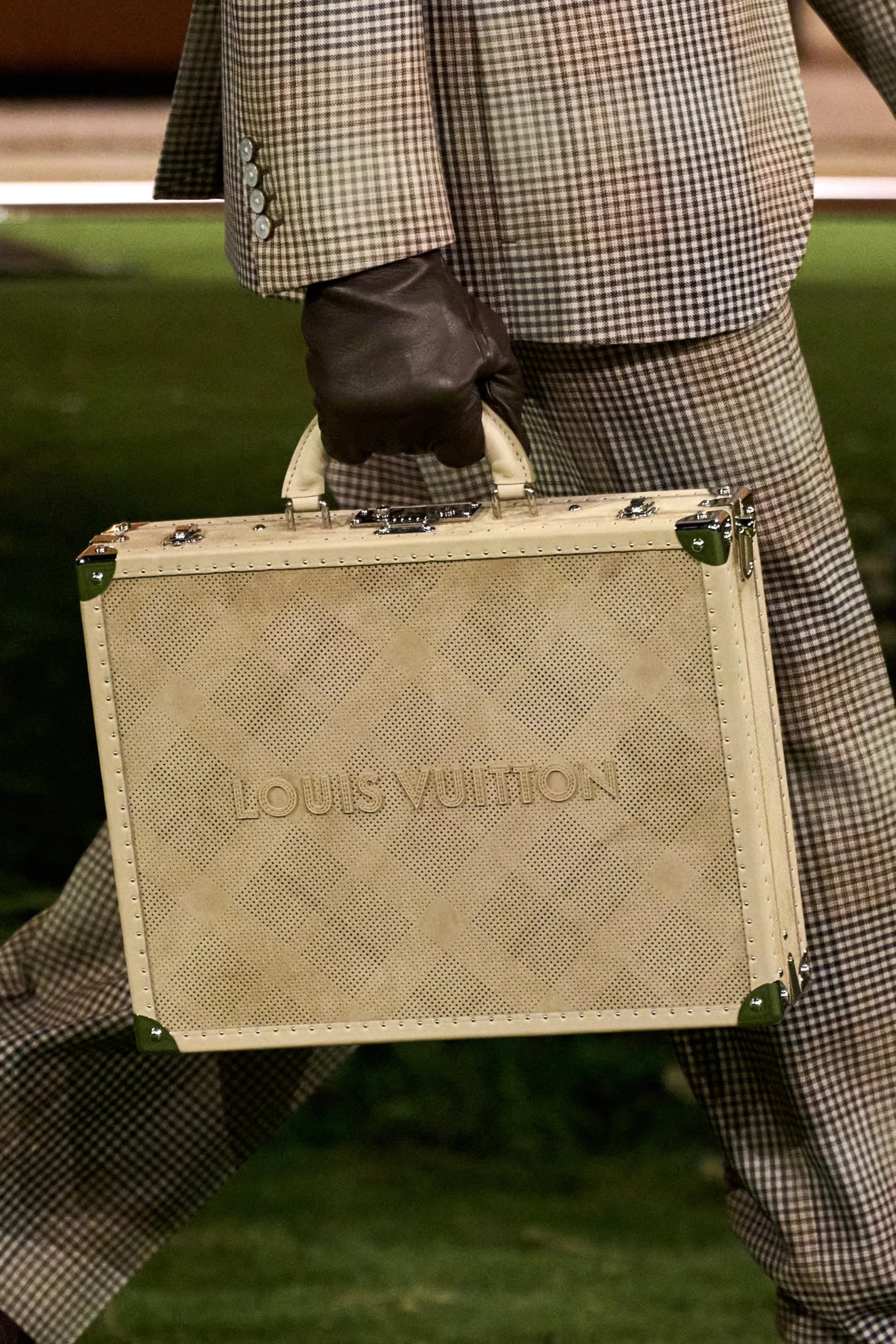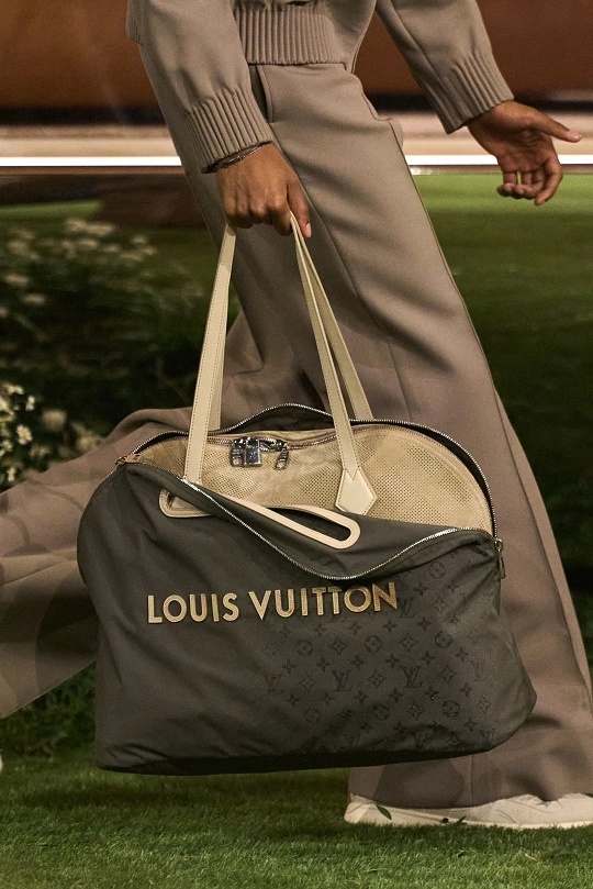 新款手提箱、Shopper Tote 手袋、Shoulder Alma 肩背包采用沙色 Malletier Veau Velours 皮革打造,通过镂孔工艺在柔软的小牛皮绒面上营造出格纹错视效果,秀场上还为包包配置了可拆卸尼龙雨衣。