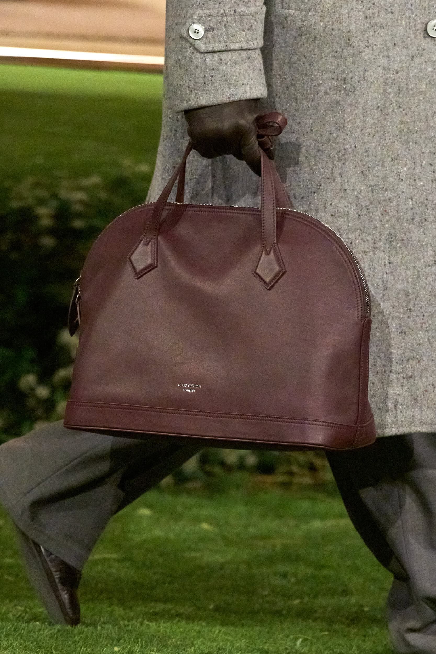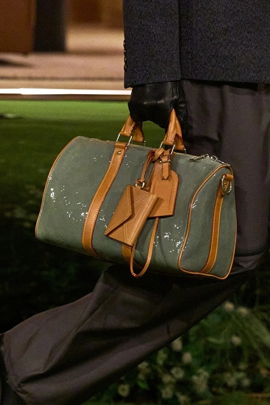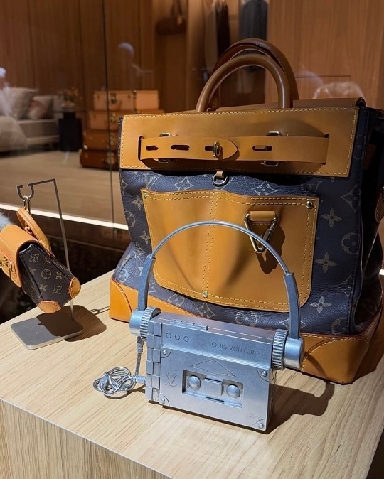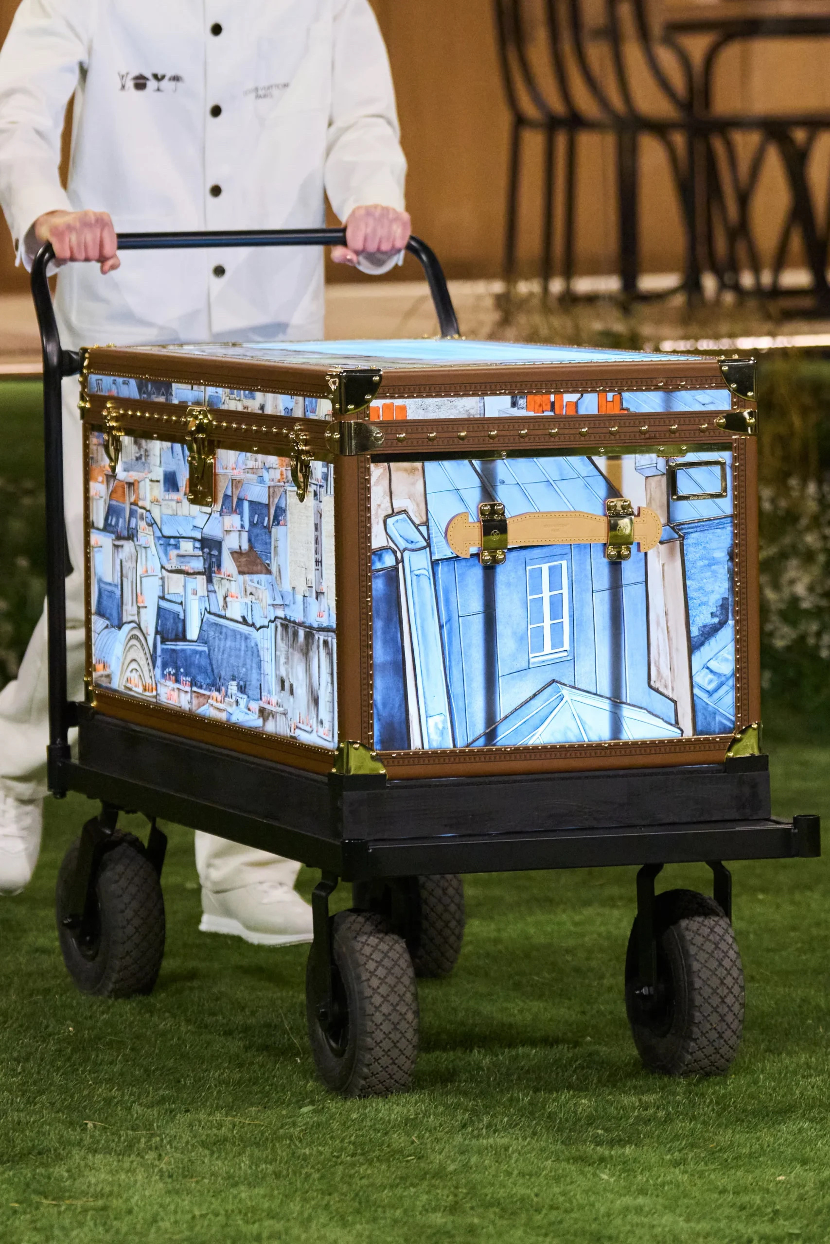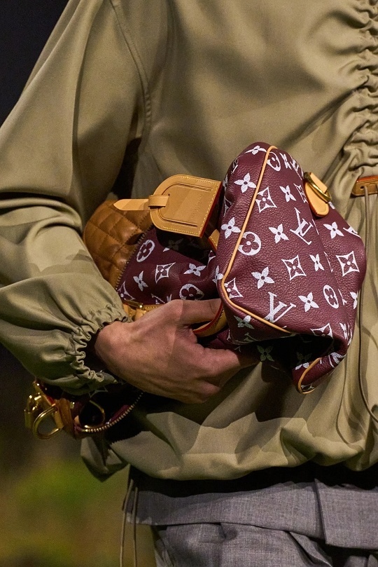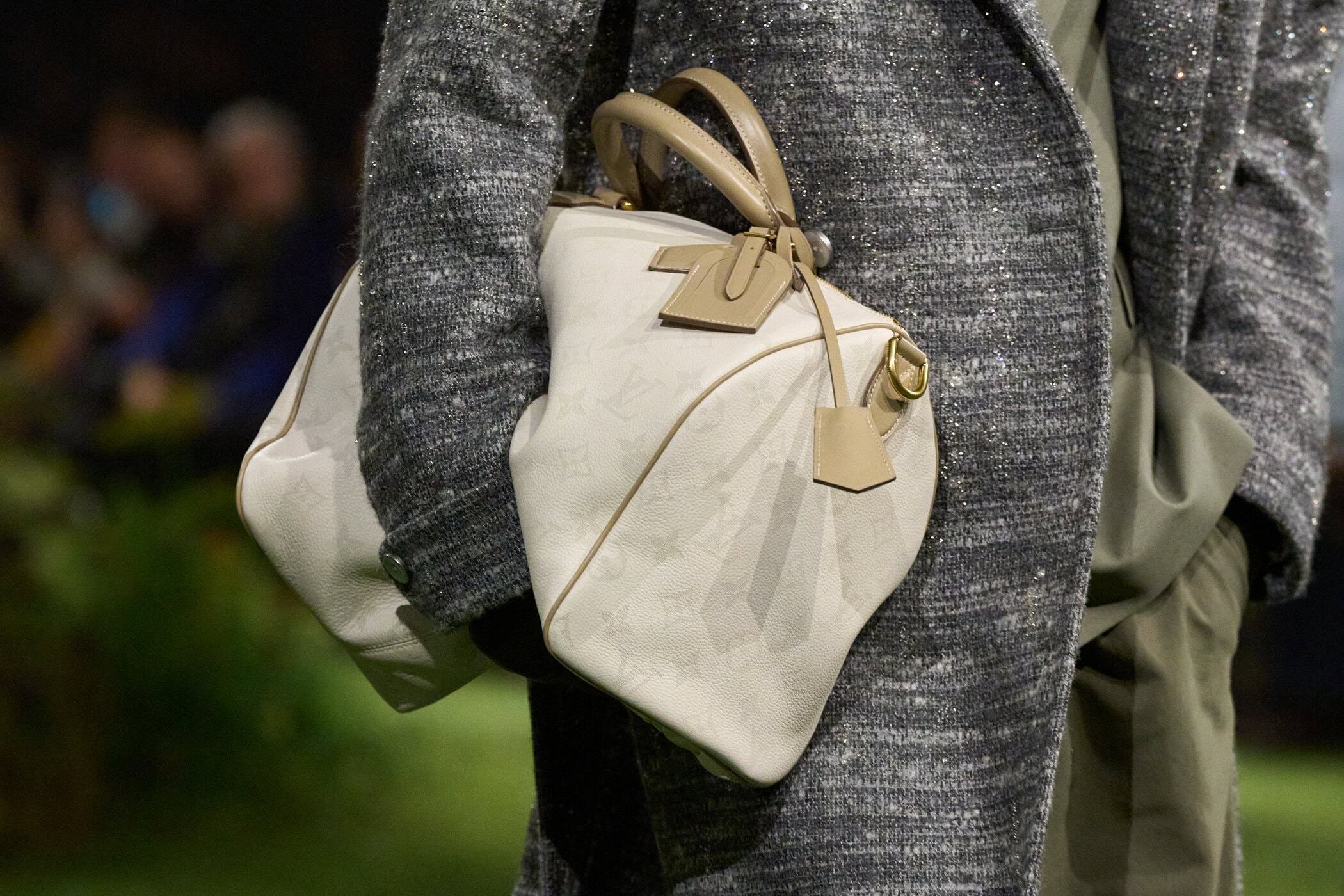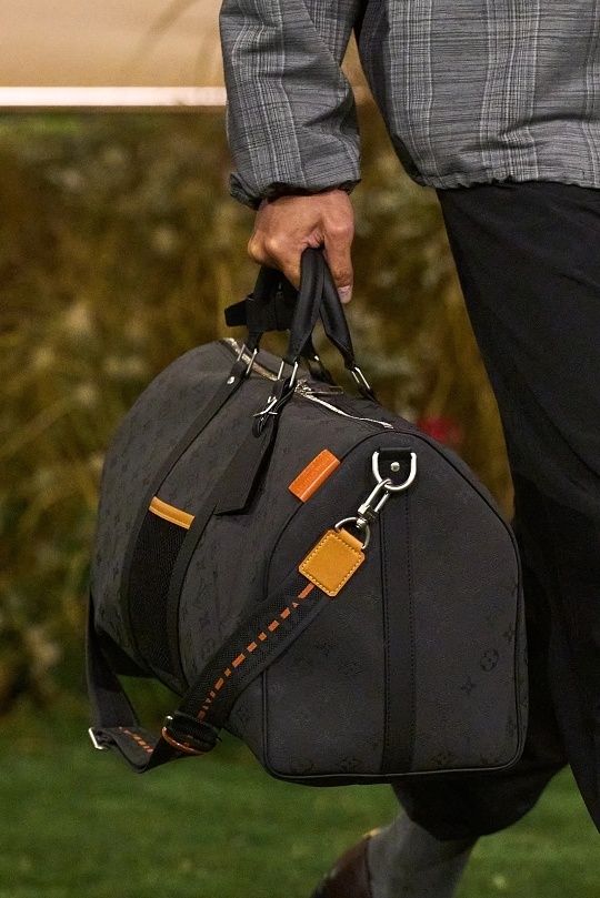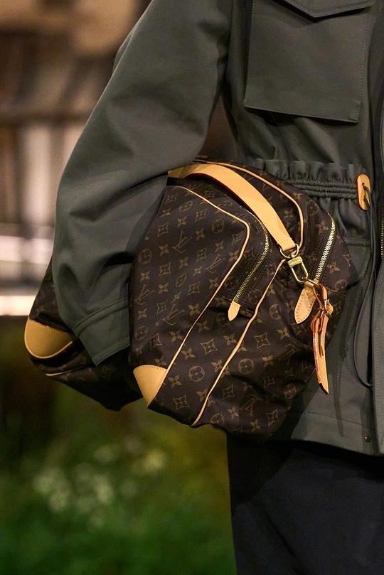 新款手提箱、Shopper Tote 手袋、Shoulder Alma 肩背包采用沙色 Malletier Veau Velours 皮革打造,通过镂孔工艺在柔软的小牛皮绒面上营造出格纹错视效果,秀场上还为包包配置了可拆卸尼龙雨衣。