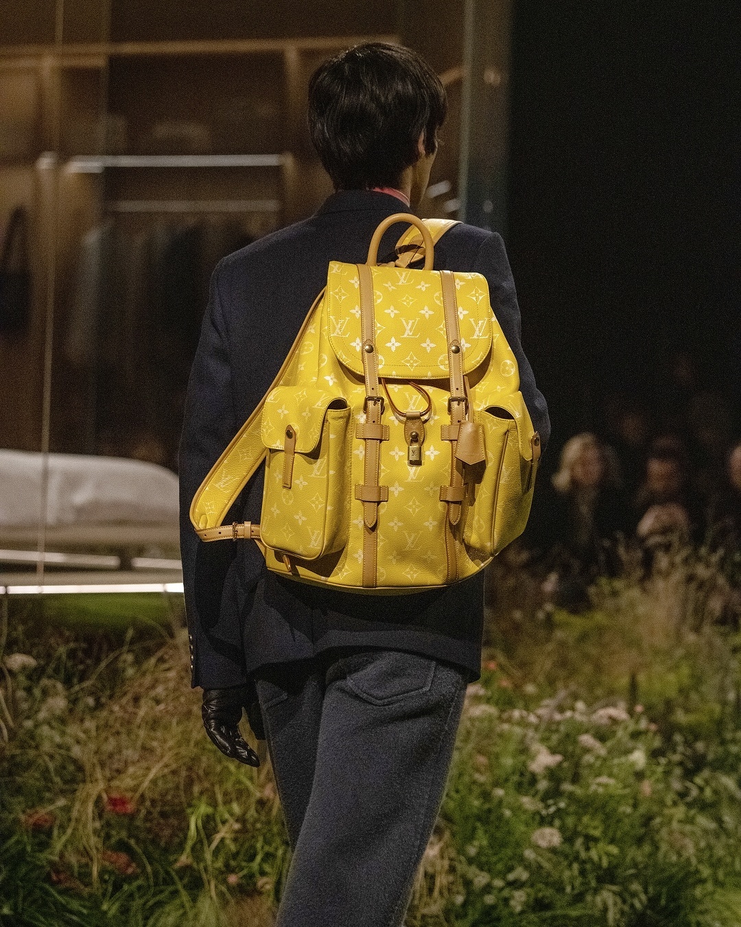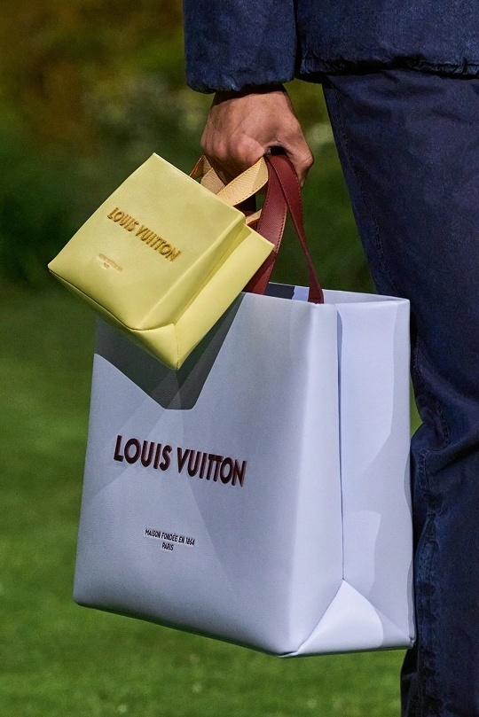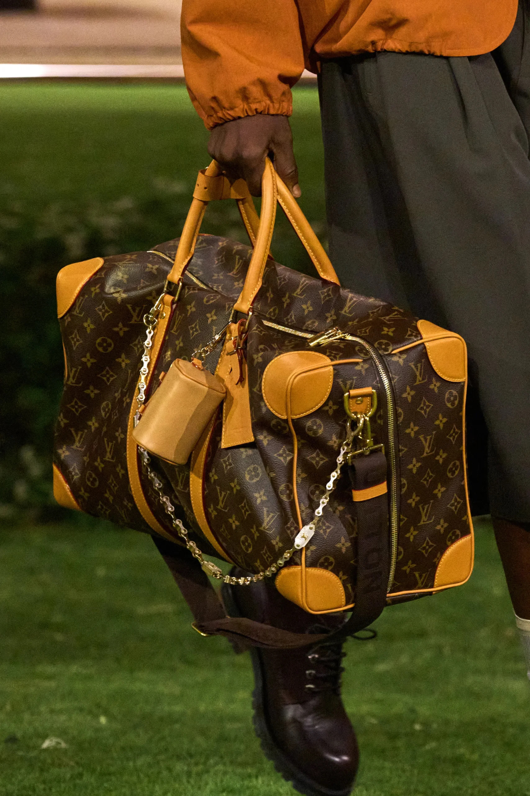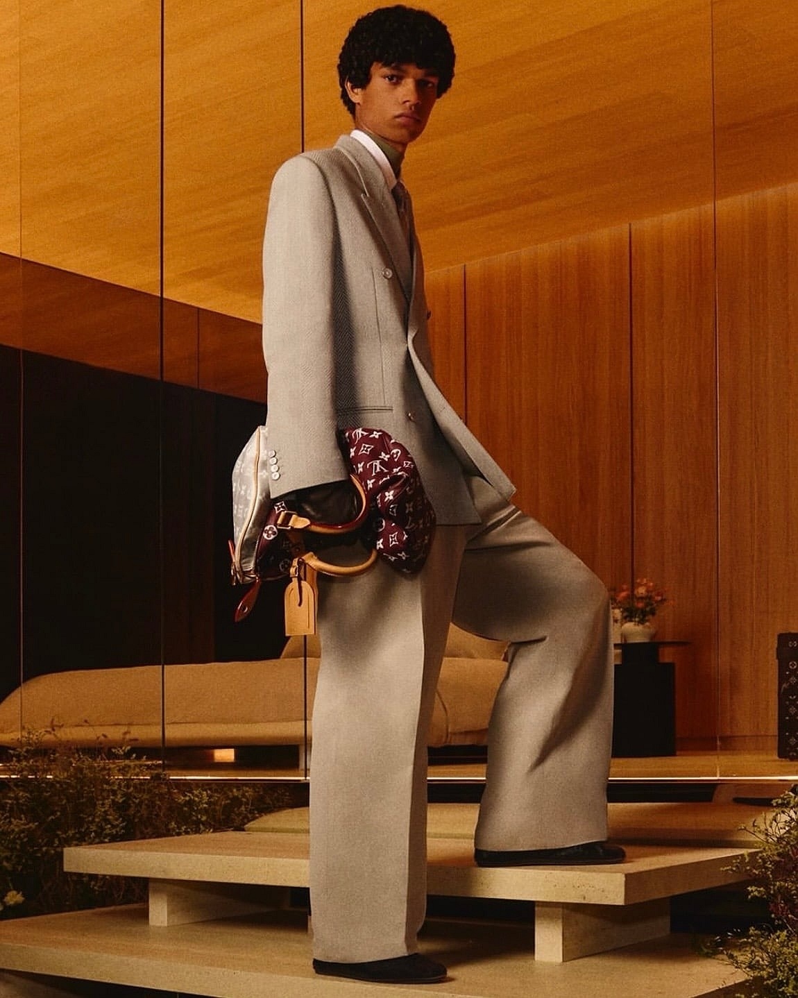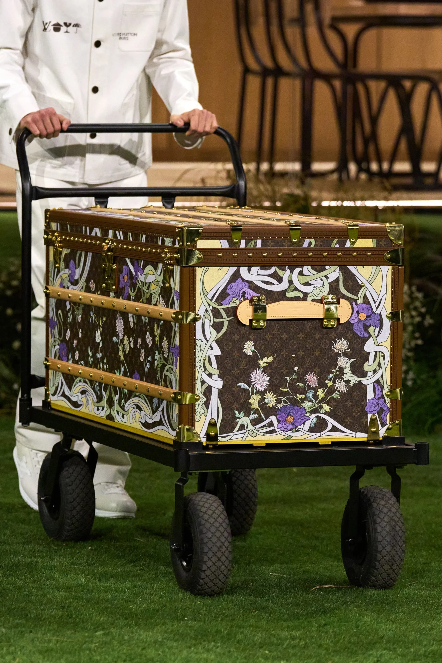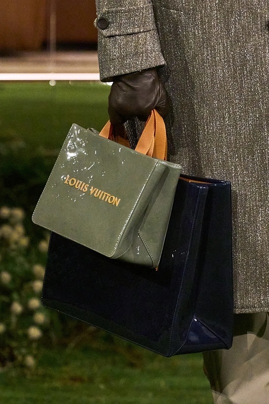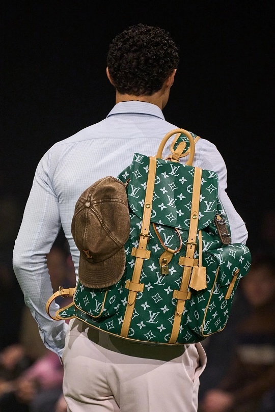 新款手提箱、Shopper Tote 手袋、Shoulder Alma 肩背包采用沙色 Malletier Veau Velours 皮革打造,通过镂孔工艺在柔软的小牛皮绒面上营造出格纹错视效果,秀场上还为包包配置了可拆卸尼龙雨衣。