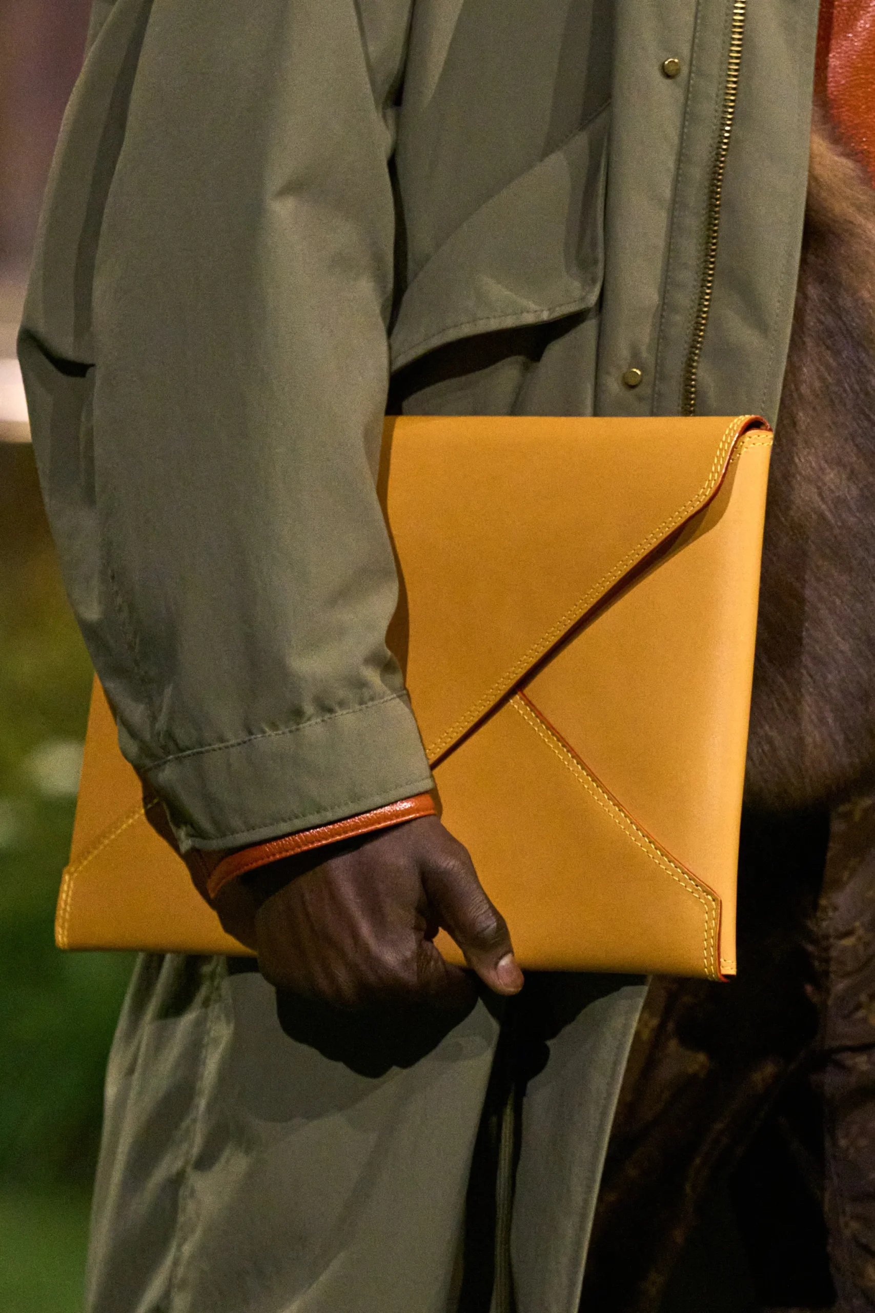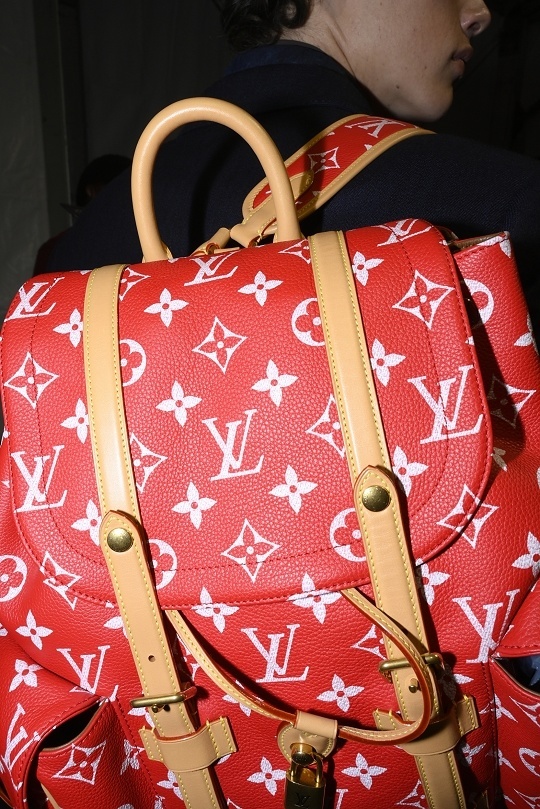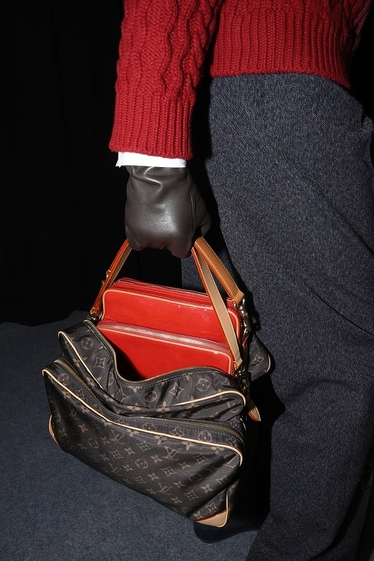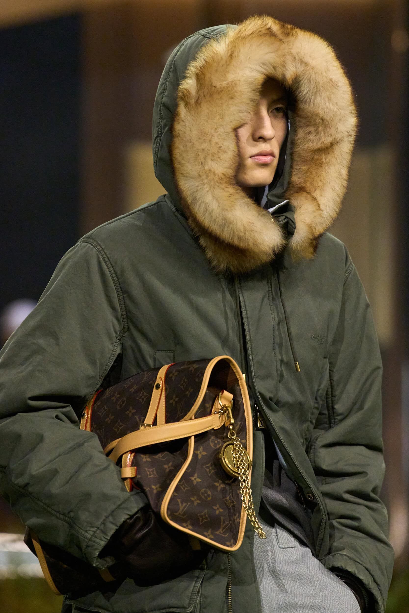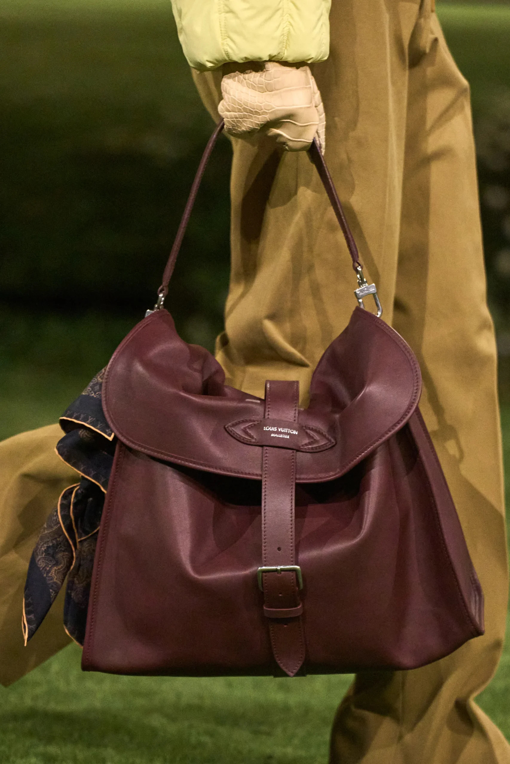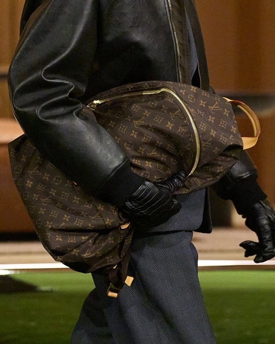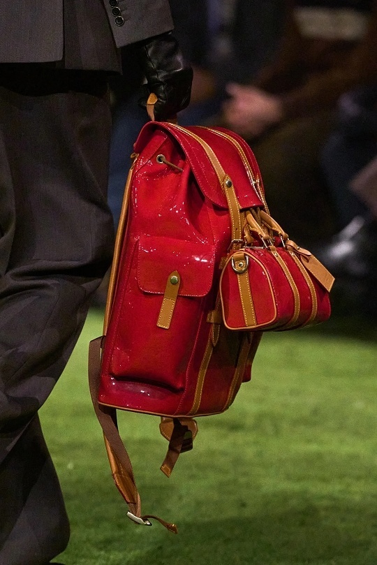 新款手提箱、Shopper Tote 手袋、Shoulder Alma 肩背包采用沙色 Malletier Veau Velours 皮革打造,通过镂孔工艺在柔软的小牛皮绒面上营造出格纹错视效果,秀场上还为包包配置了可拆卸尼龙雨衣。