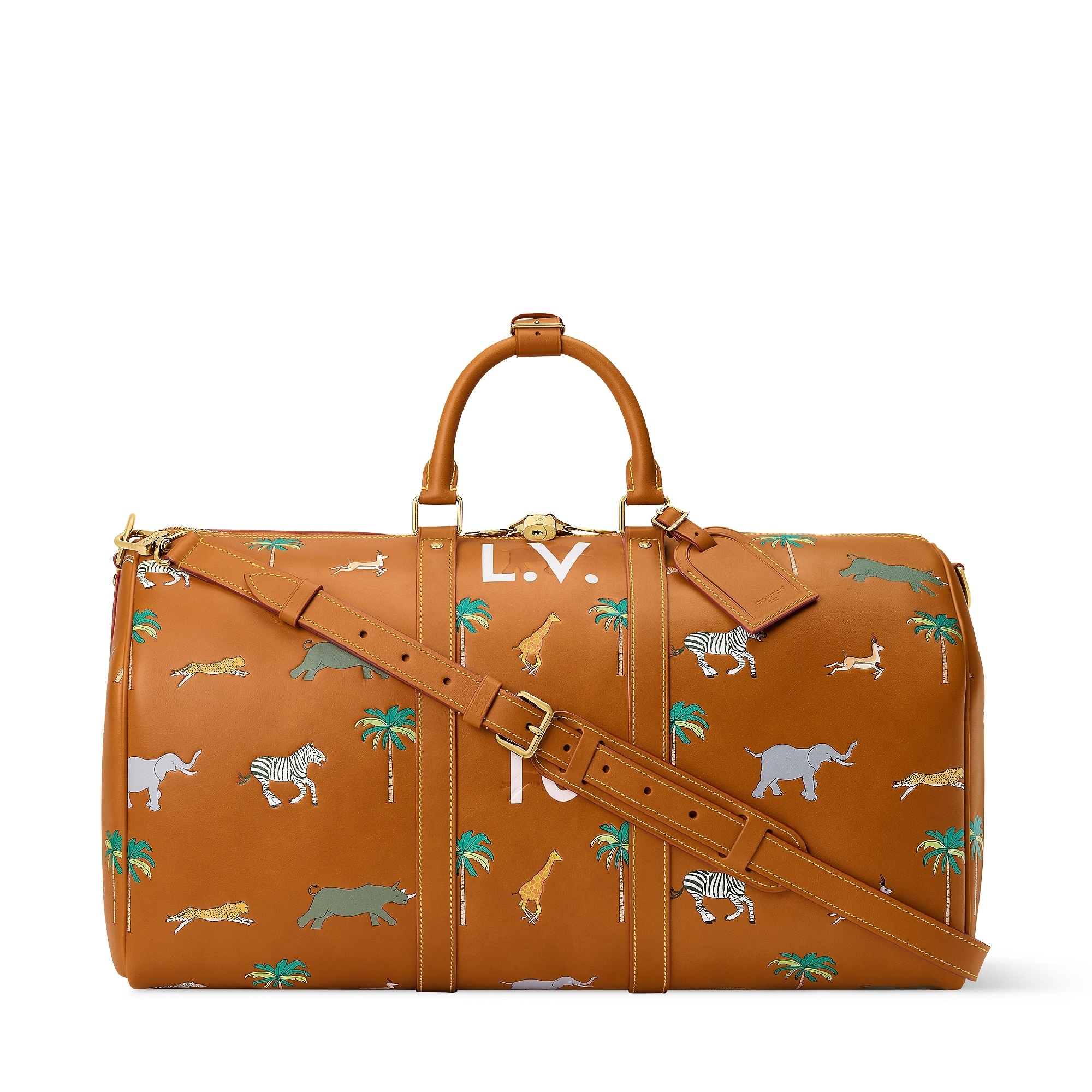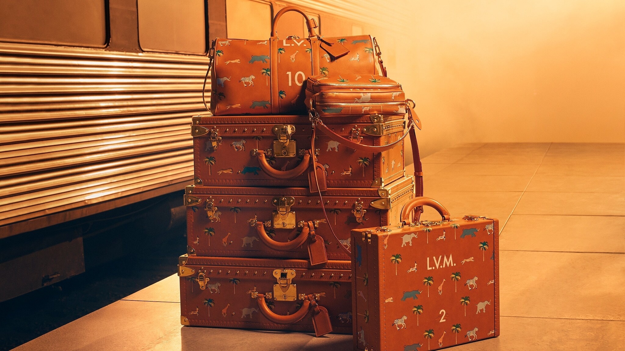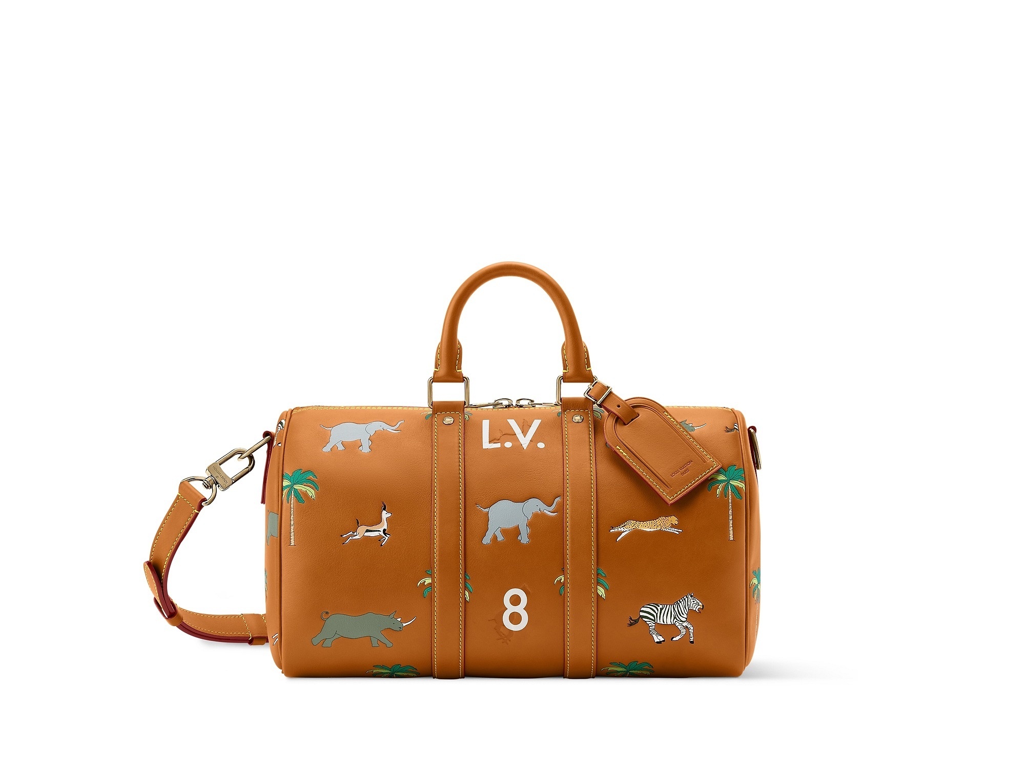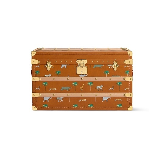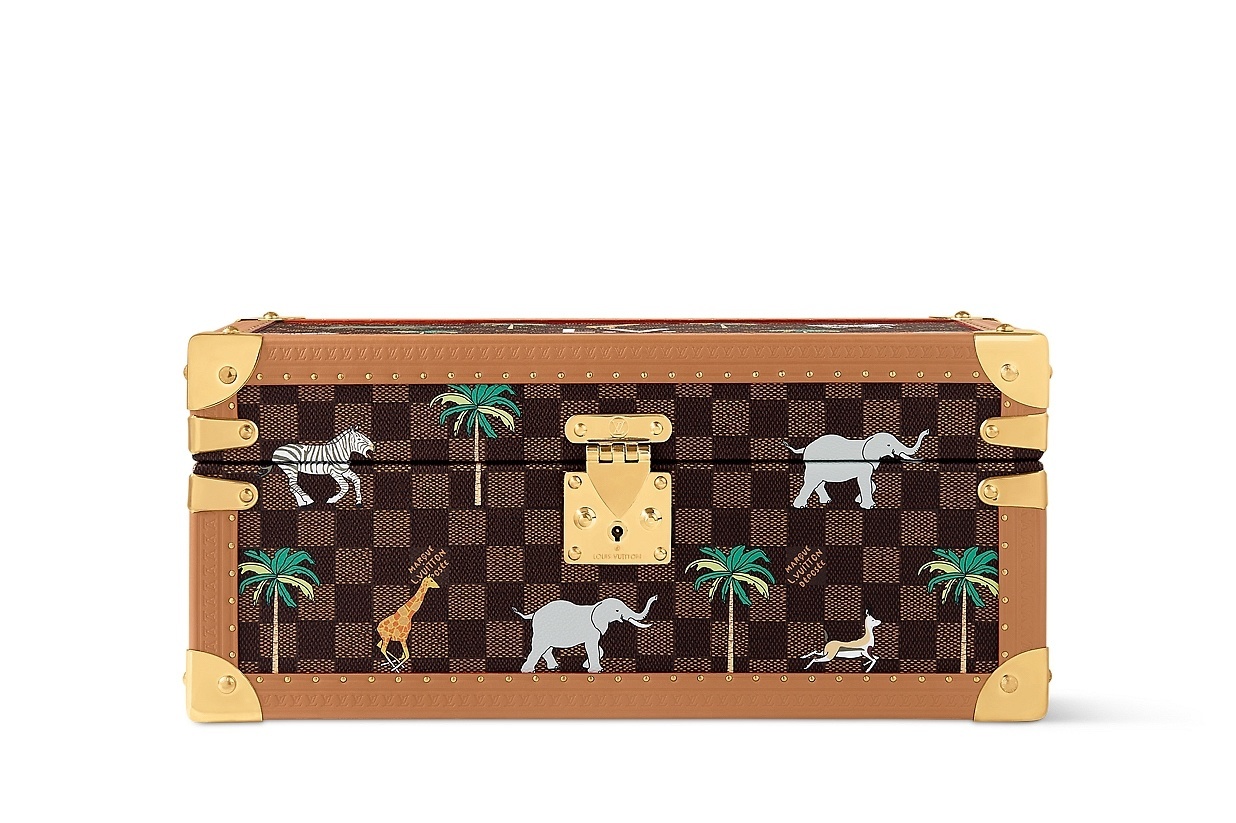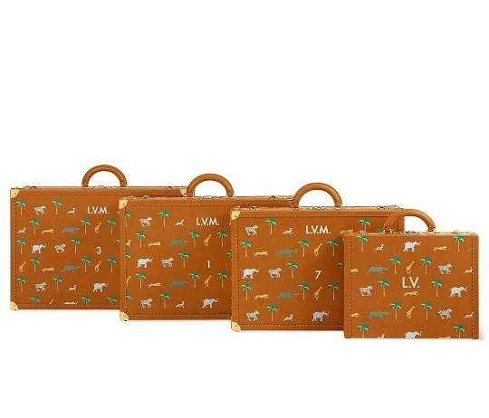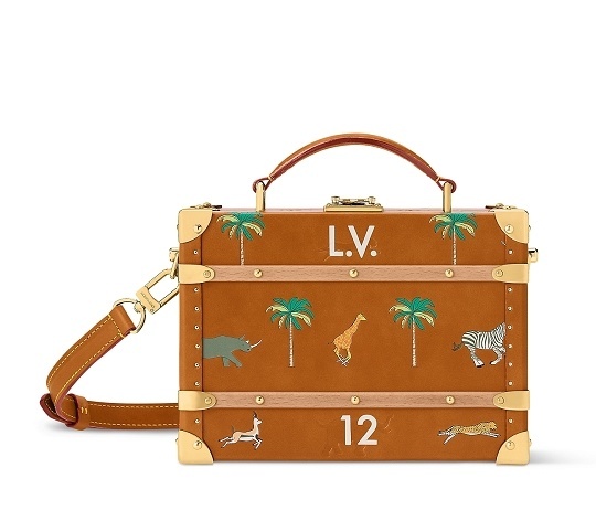 LV x The Darjeeling Limited 联名系列包袋再现路易威登为2007年经典电影《穿越大吉岭》设计的印花图案,通过印凹和丝网印刷工艺将猎豹、大象、瞪羚、长颈鹿、犀牛、斑马、棕榈树等生活于各大洲的动植物呈现于包袋之上。沙色半植鞣皮革系列推出 Nil 邮差包、Keepall 35 手袋、Sac Plat 托特包、Handle Trunk 便携式硬箱等单品,搭配 LV Blason 椰壳纤维织物内衬和联名系列烫金皮标,可定制专属首字母图案。