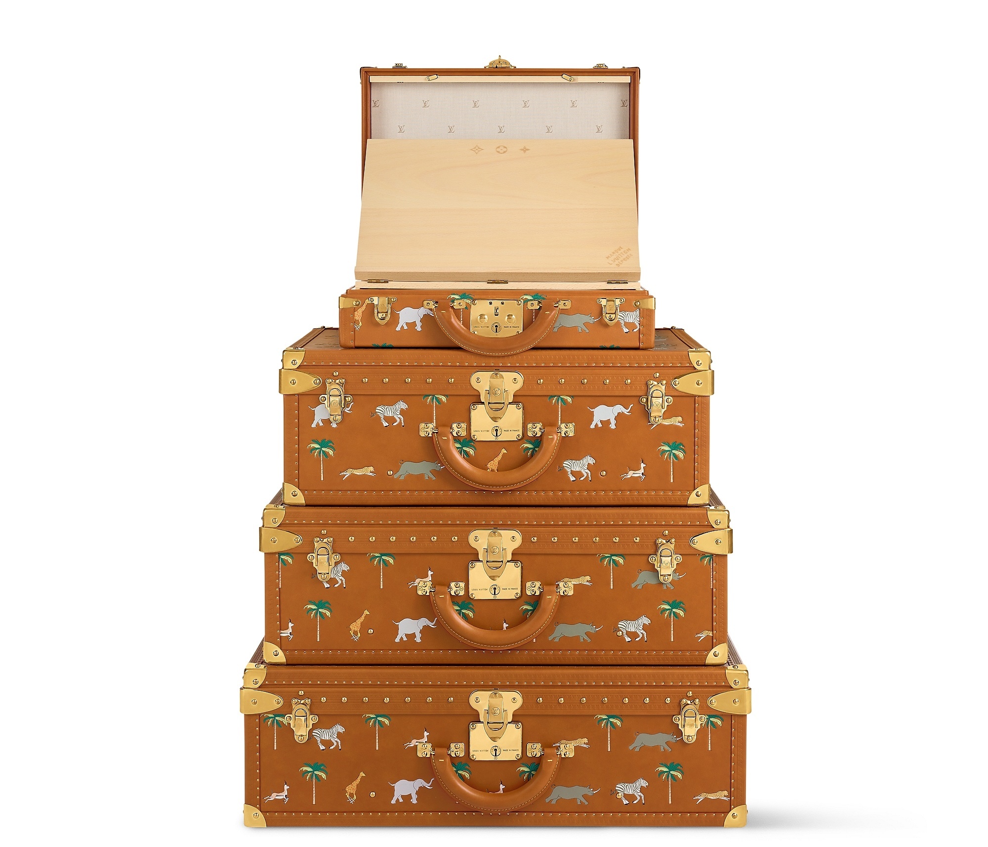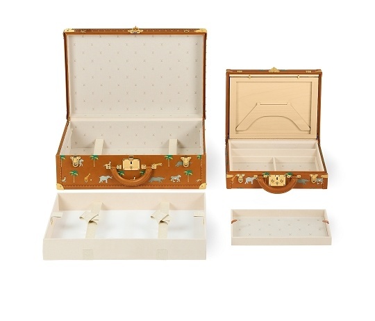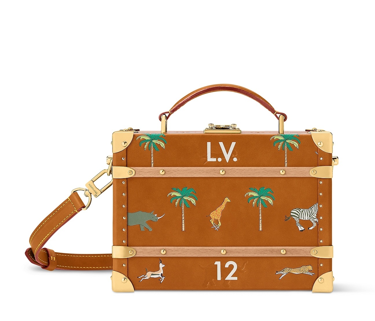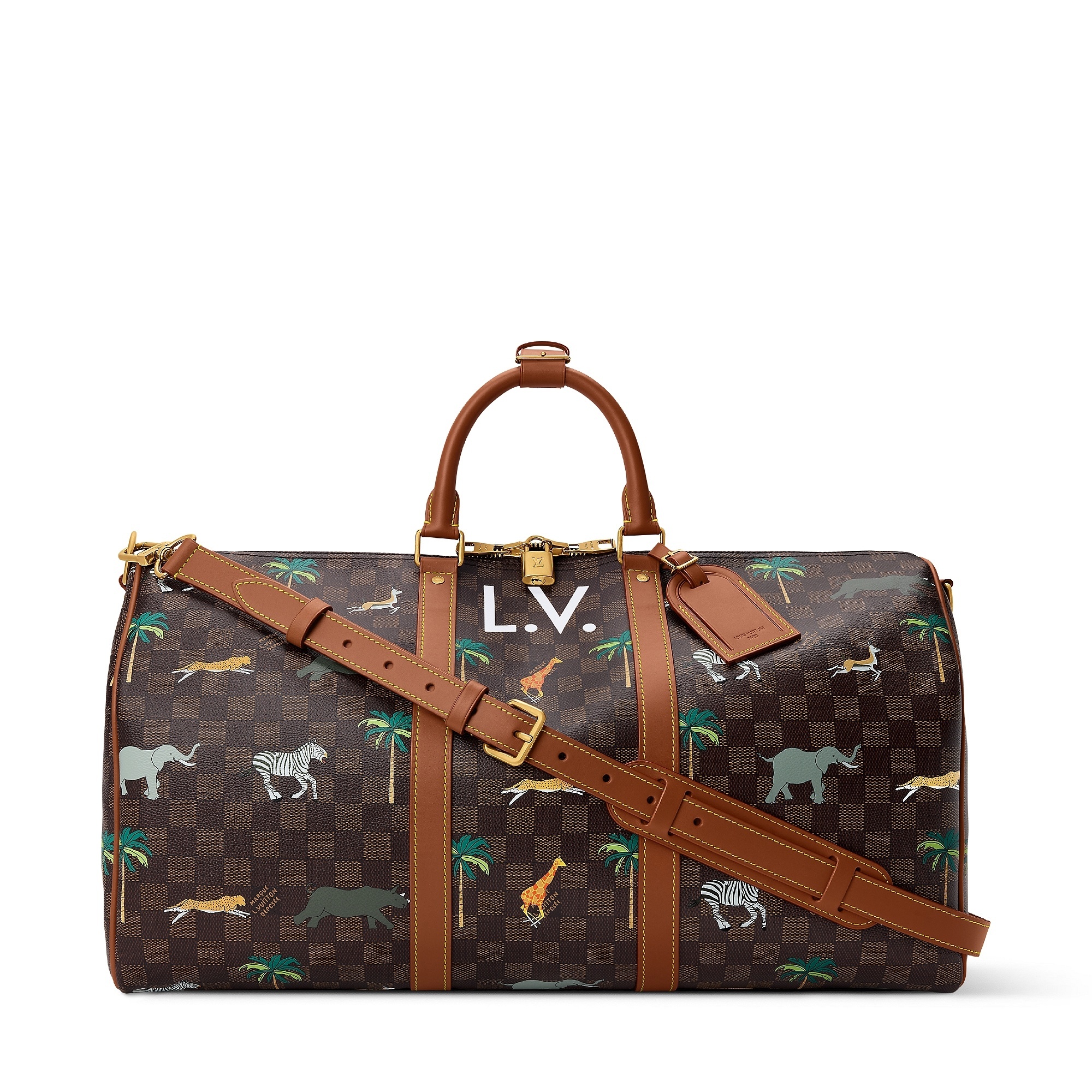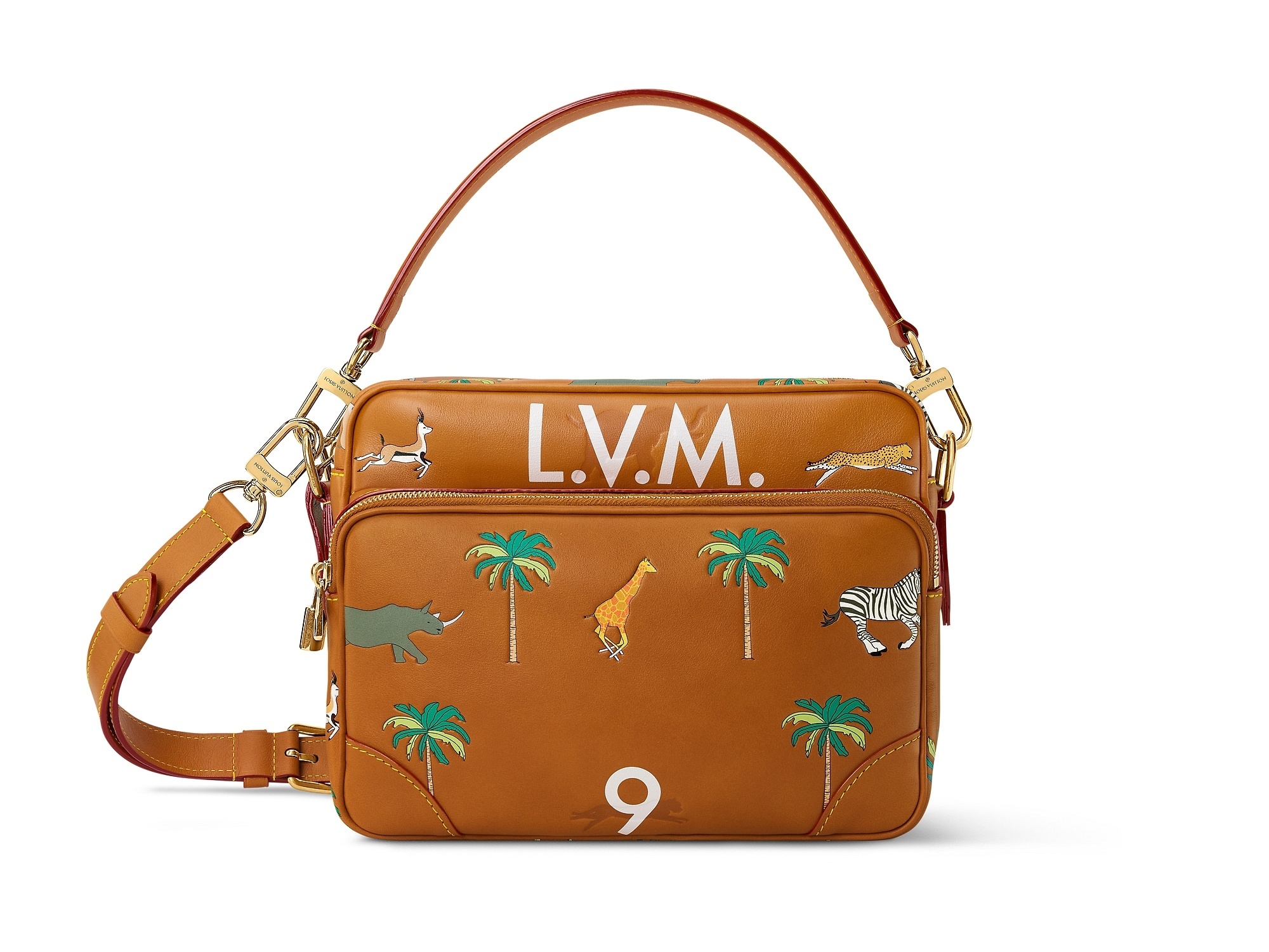 LV x The Darjeeling Limited 联名系列包袋再现路易威登为2007年经典电影《穿越大吉岭》设计的印花图案,通过印凹和丝网印刷工艺将猎豹、大象、瞪羚、长颈鹿、犀牛、斑马、棕榈树等生活于各大洲的动植物呈现于包袋之上。沙色半植鞣皮革系列推出 Nil 邮差包、Keepall 35 手袋、Sac Plat 托特包、Handle Trunk 便携式硬箱等单品,搭配 LV Blason 椰壳纤维织物内衬和联名系列烫金皮标,可定制专属首字母图案。