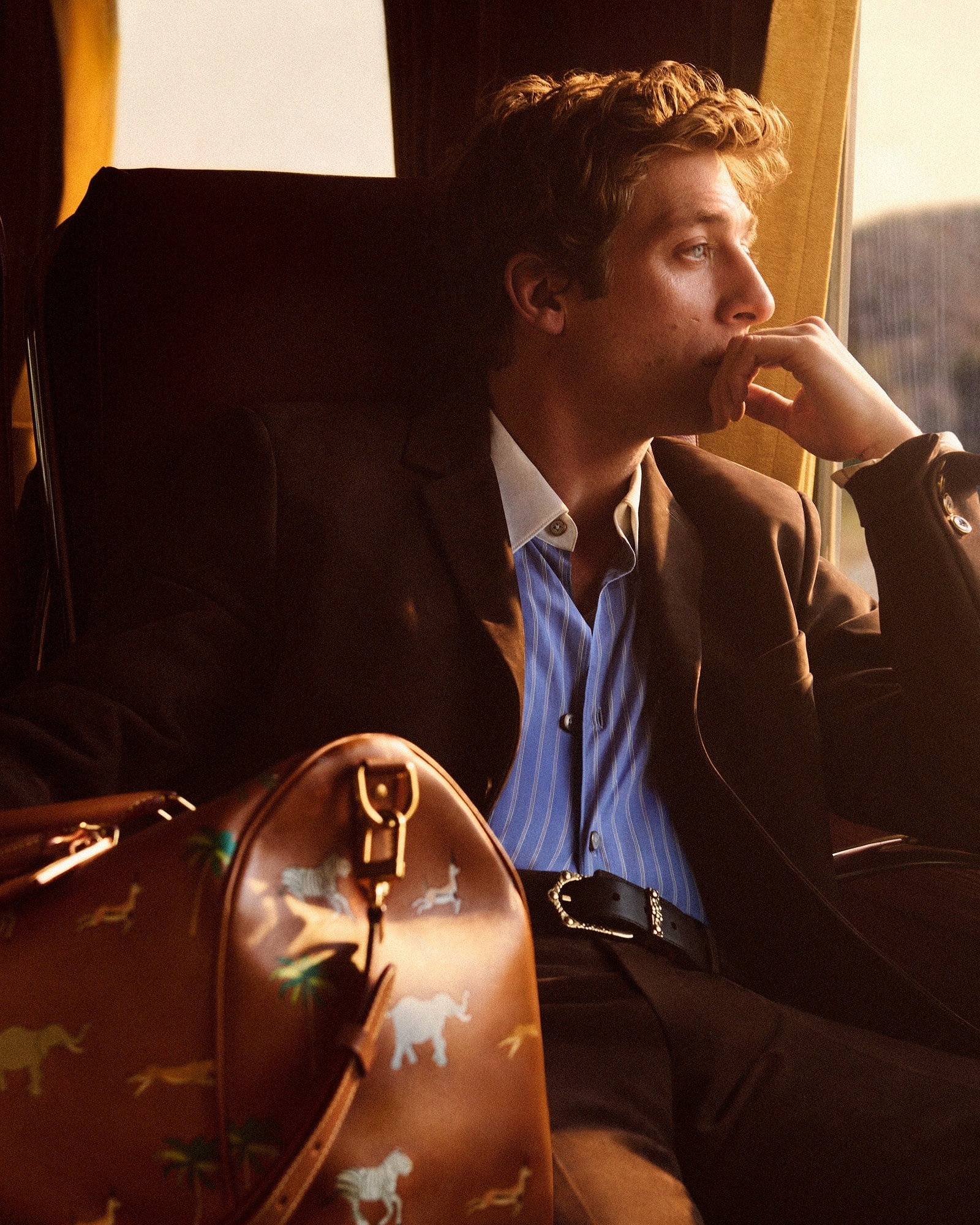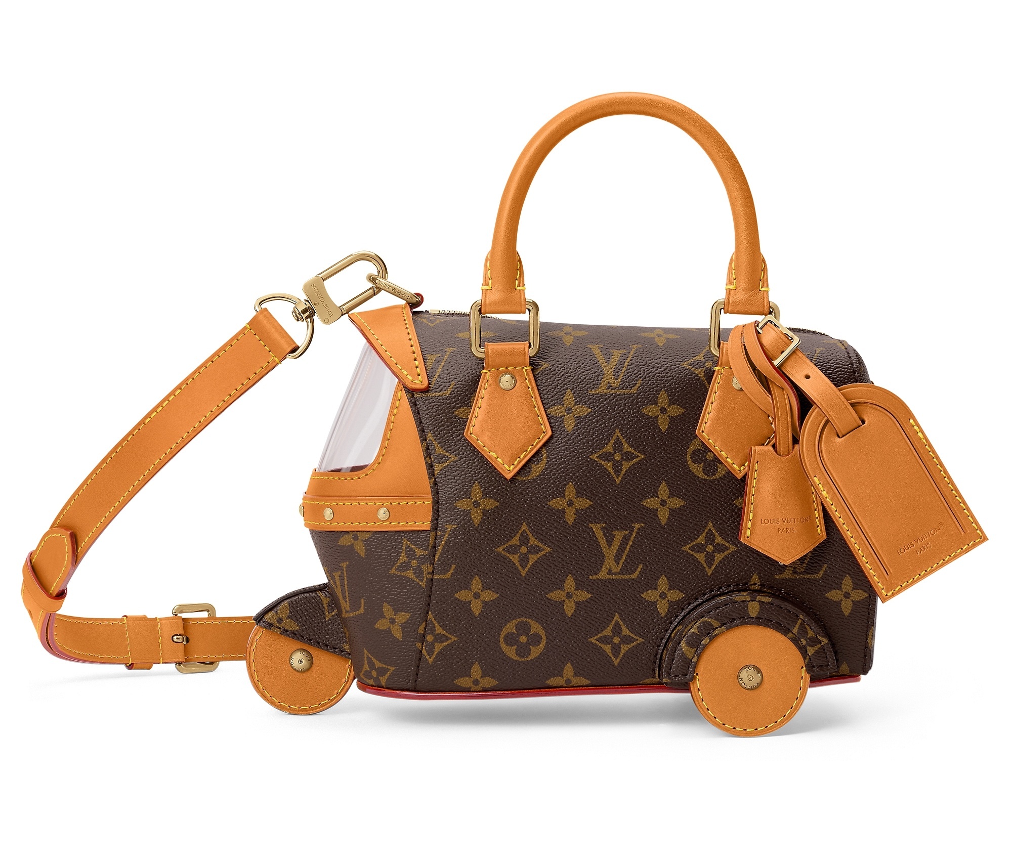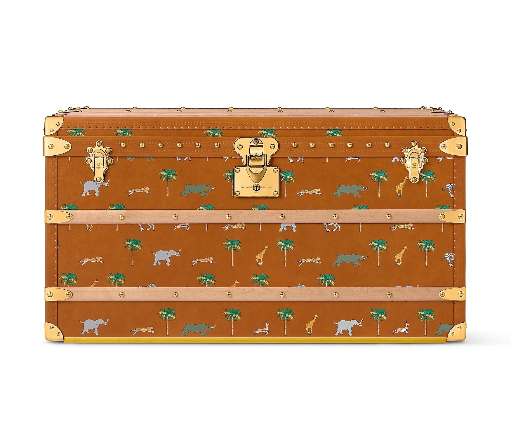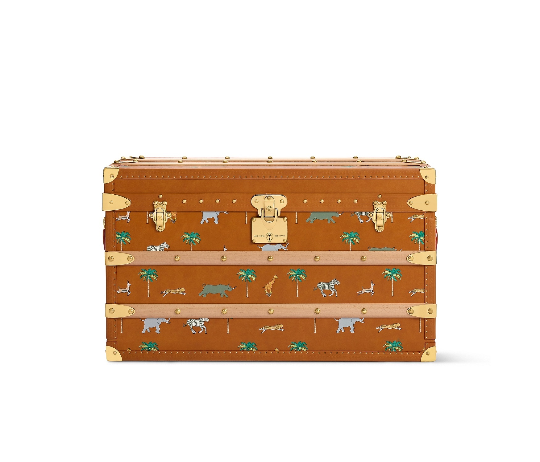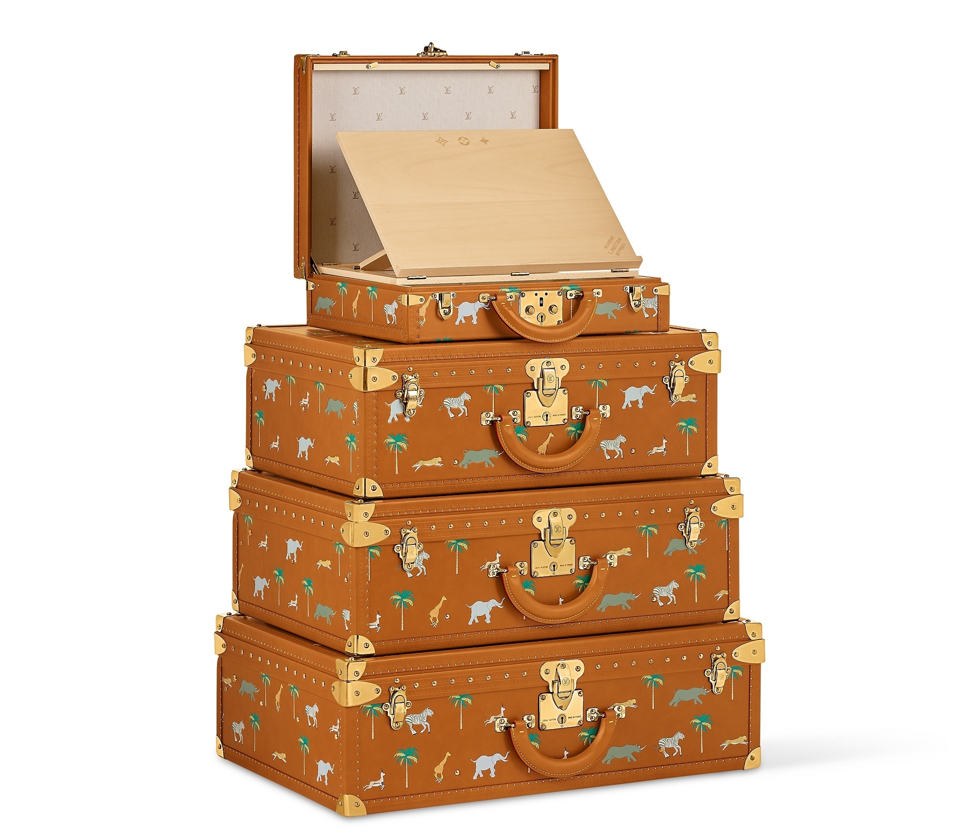 LV x The Darjeeling Limited 联名系列包袋再现路易威登为2007年经典电影《穿越大吉岭》设计的印花图案,通过印凹和丝网印刷工艺将猎豹、大象、瞪羚、长颈鹿、犀牛、斑马、棕榈树等生活于各大洲的动植物呈现于包袋之上。沙色半植鞣皮革系列推出 Nil 邮差包、Keepall 35 手袋、Sac Plat 托特包、Handle Trunk 便携式硬箱等单品,搭配 LV Blason 椰壳纤维织物内衬和联名系列烫金皮标,可定制专属首字母图案。