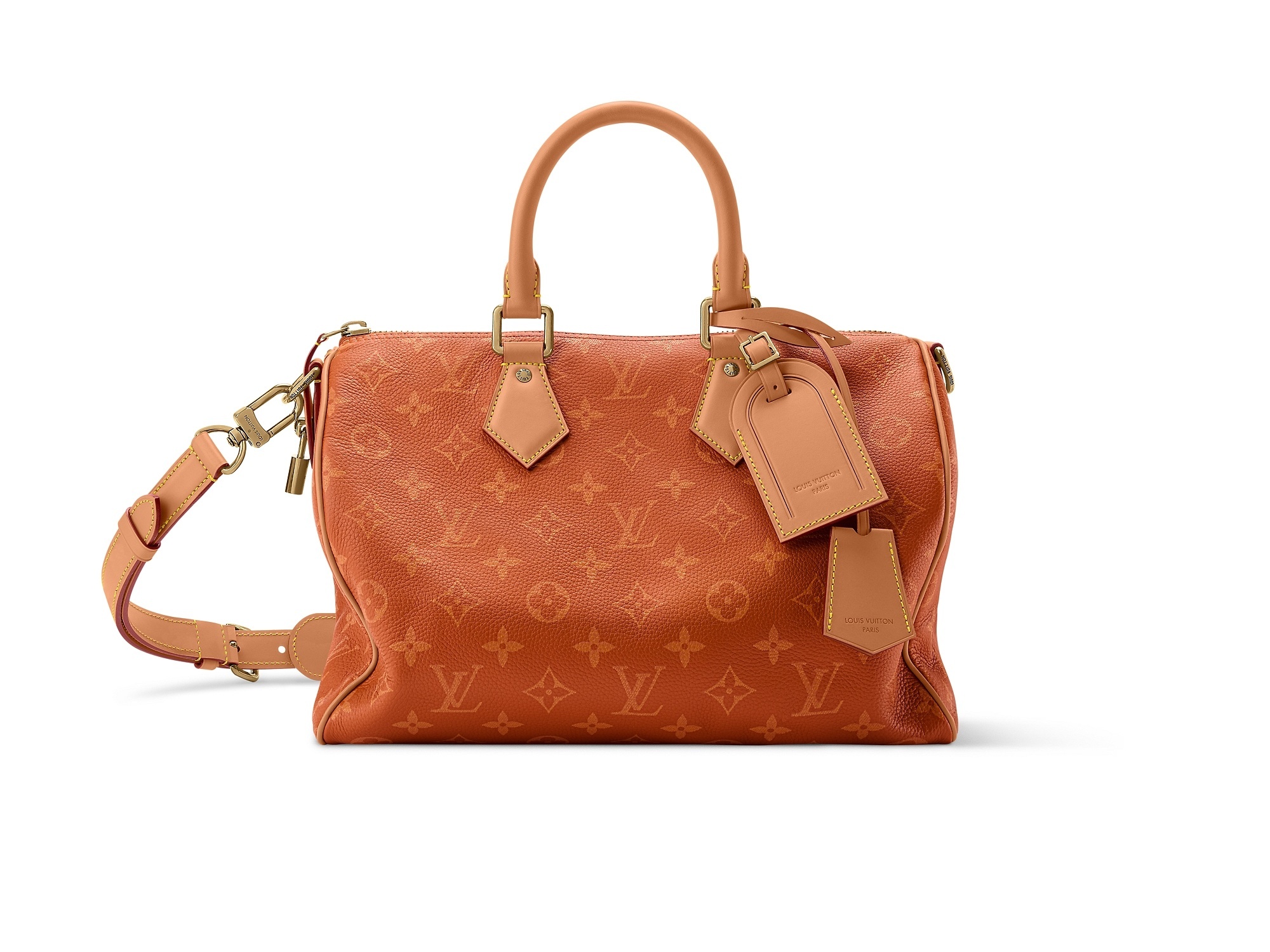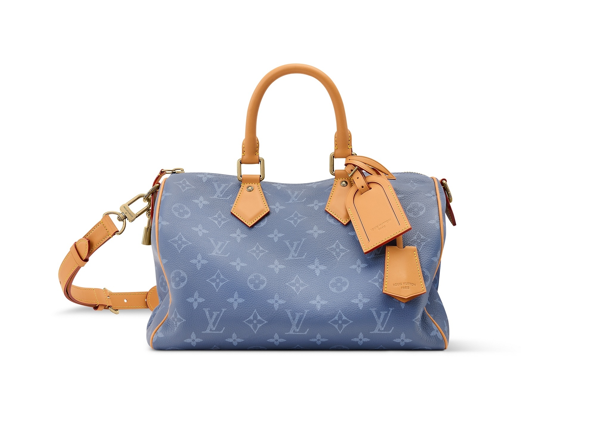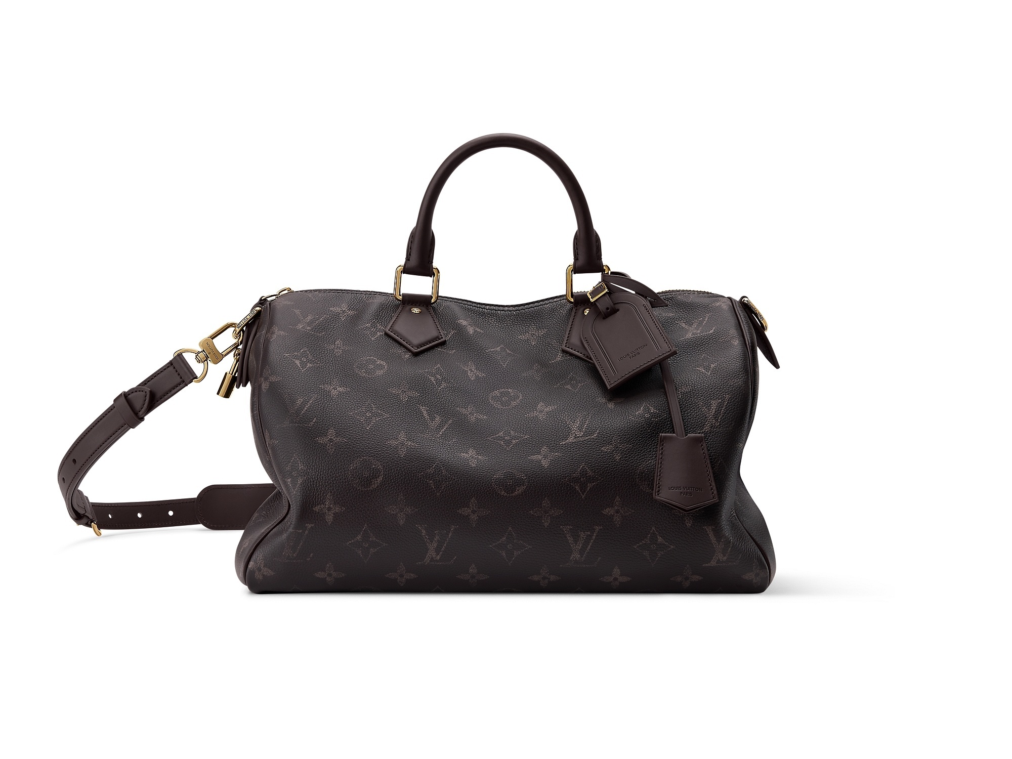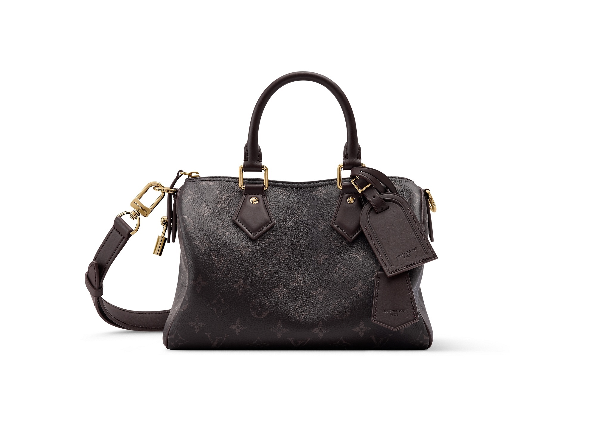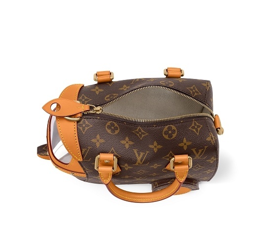 另一组 Speedy P9 手袋以柔软牛皮革搭配低饱和的洗褪效果 Monogram 印花,慵懒线条更显克制却不失锋芒,内衬选用羊皮革材质,配有同款可拆卸收纳包,内部点缀专属 P9 铭牌。