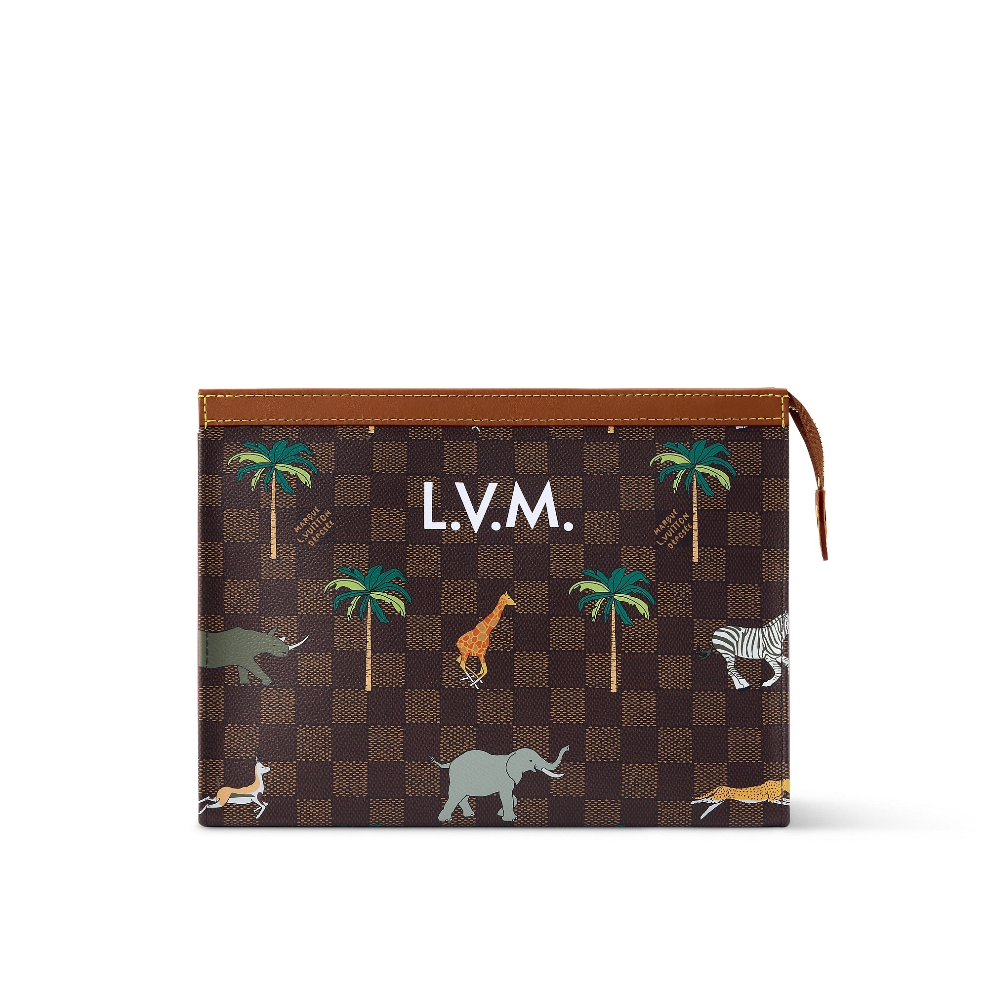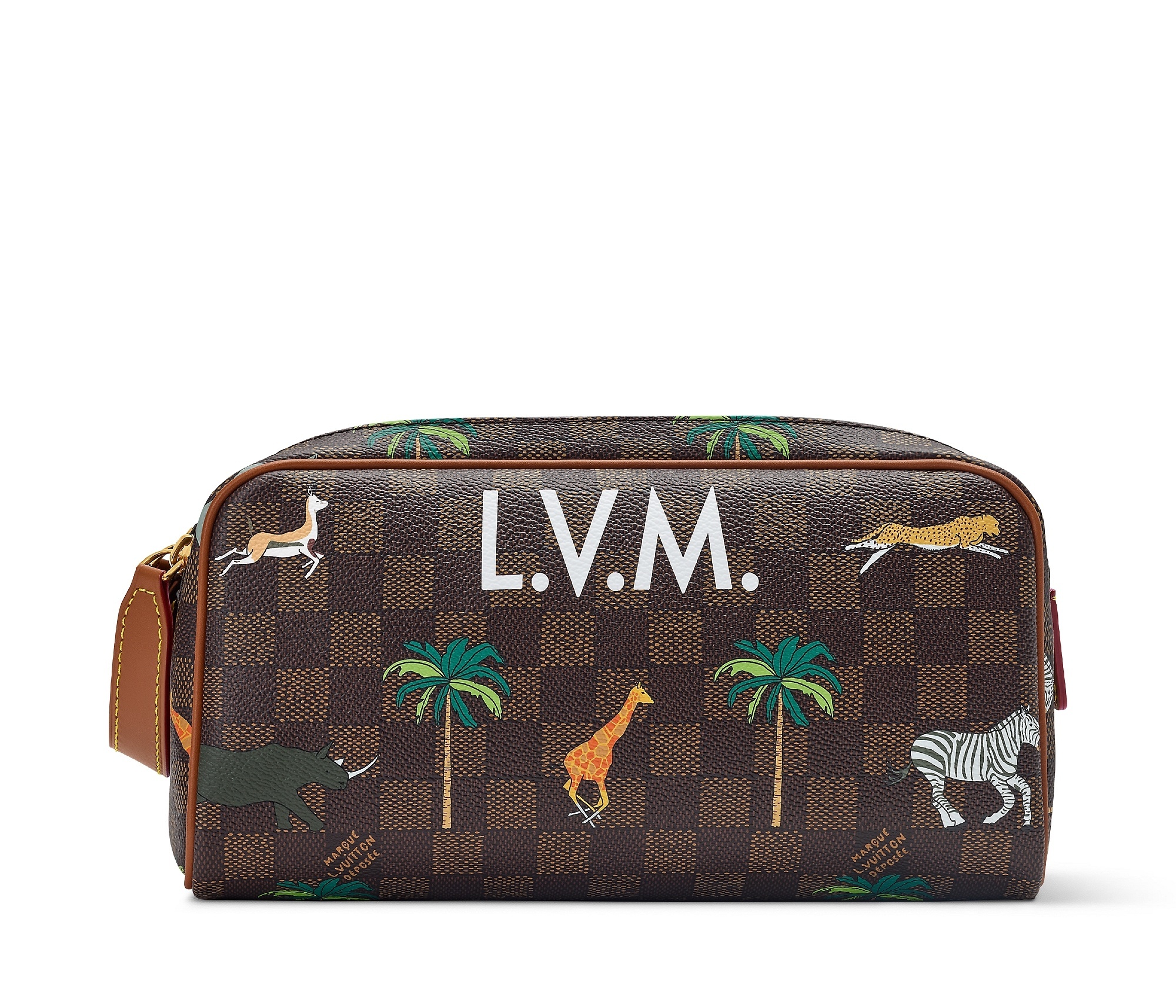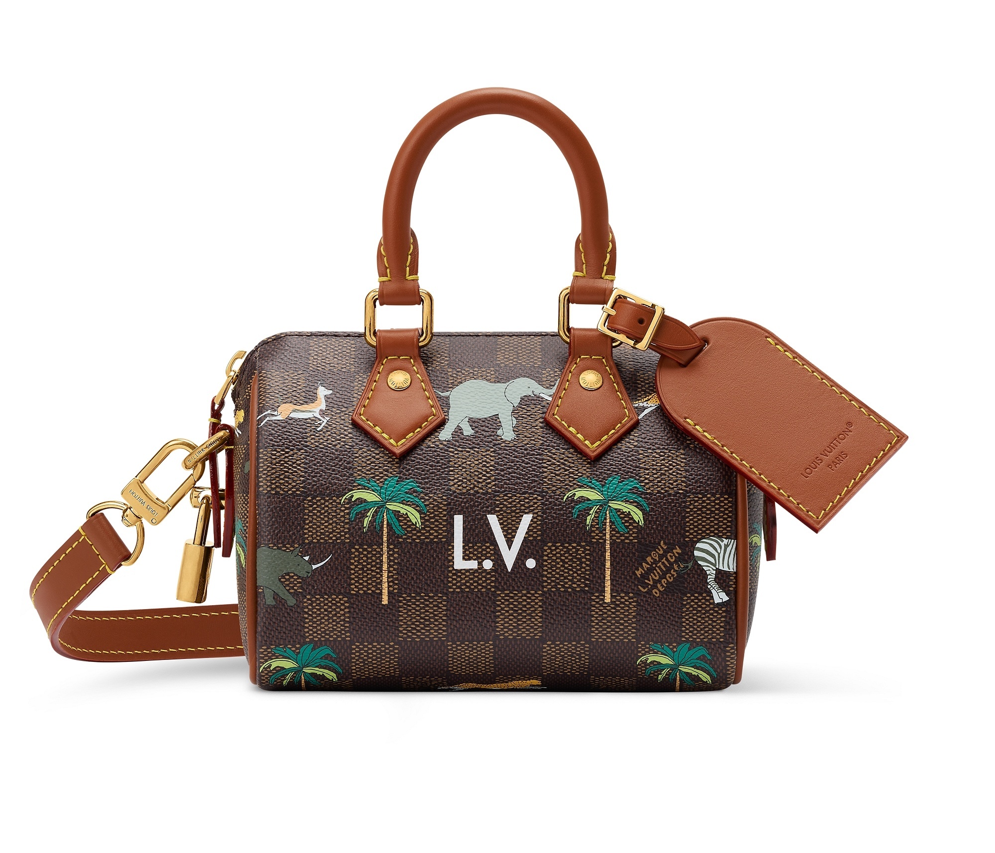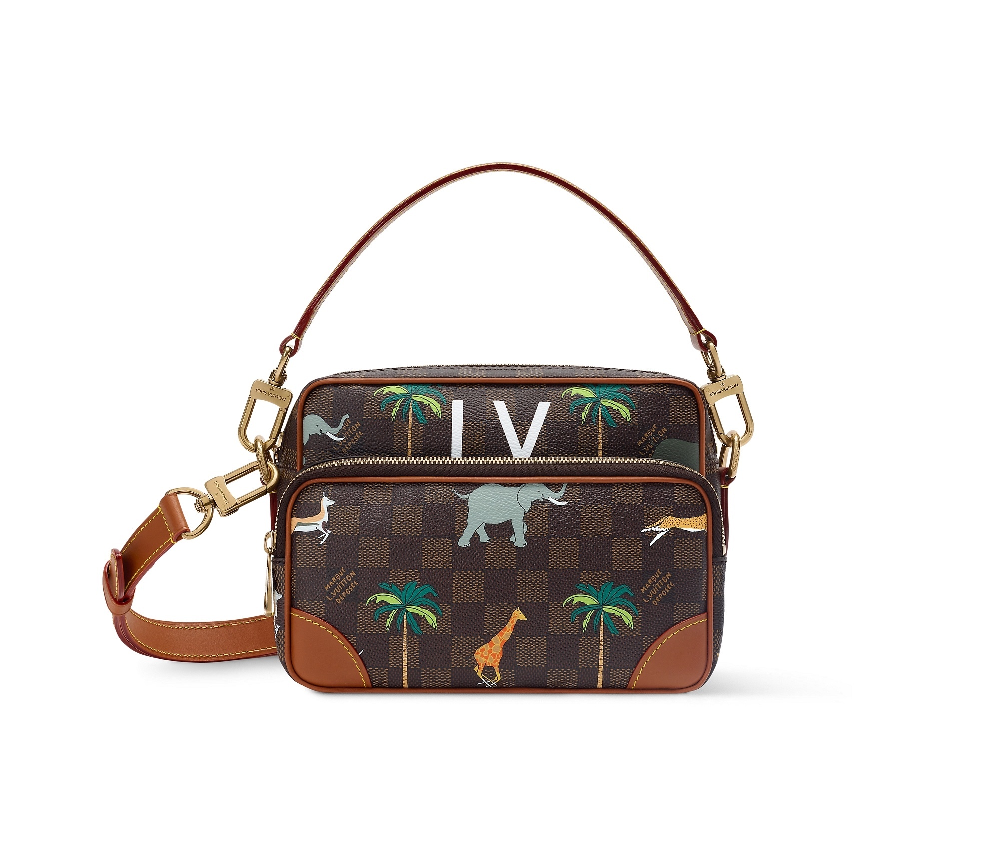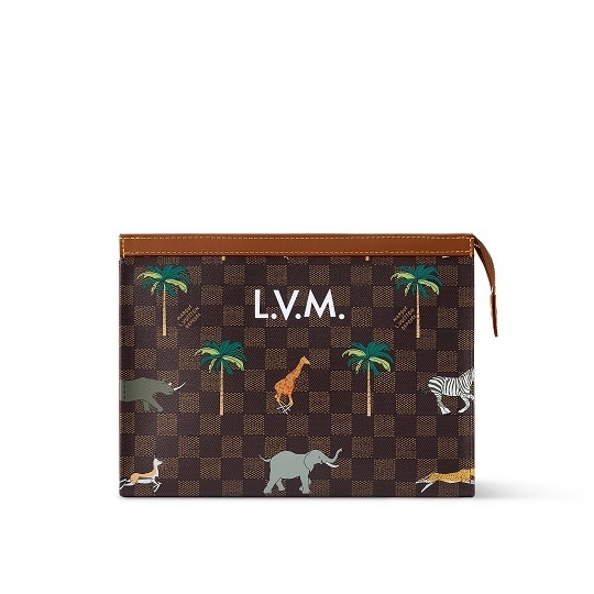 另一组包包采用 Damier Heritage 棋盘格帆布为背景,搭配野生动物穿梭于棕榈树间的印花图案和深棕色牛皮革饰边,充满辨识度的 L.V. 字母标识呼应电影中原版硬箱设计。推出 Speedy 18 和 25 手袋、Christopher 双肩包、Keepall 50 旅行袋、护照套、素描本、卡包等丰富单品,满足日常出行和差旅等各种场景需求。特别款 Pop Corn 爆米花盥洗袋采用 Damier 棋盘格纹牛皮革制作而成,趣味致意电影文化。