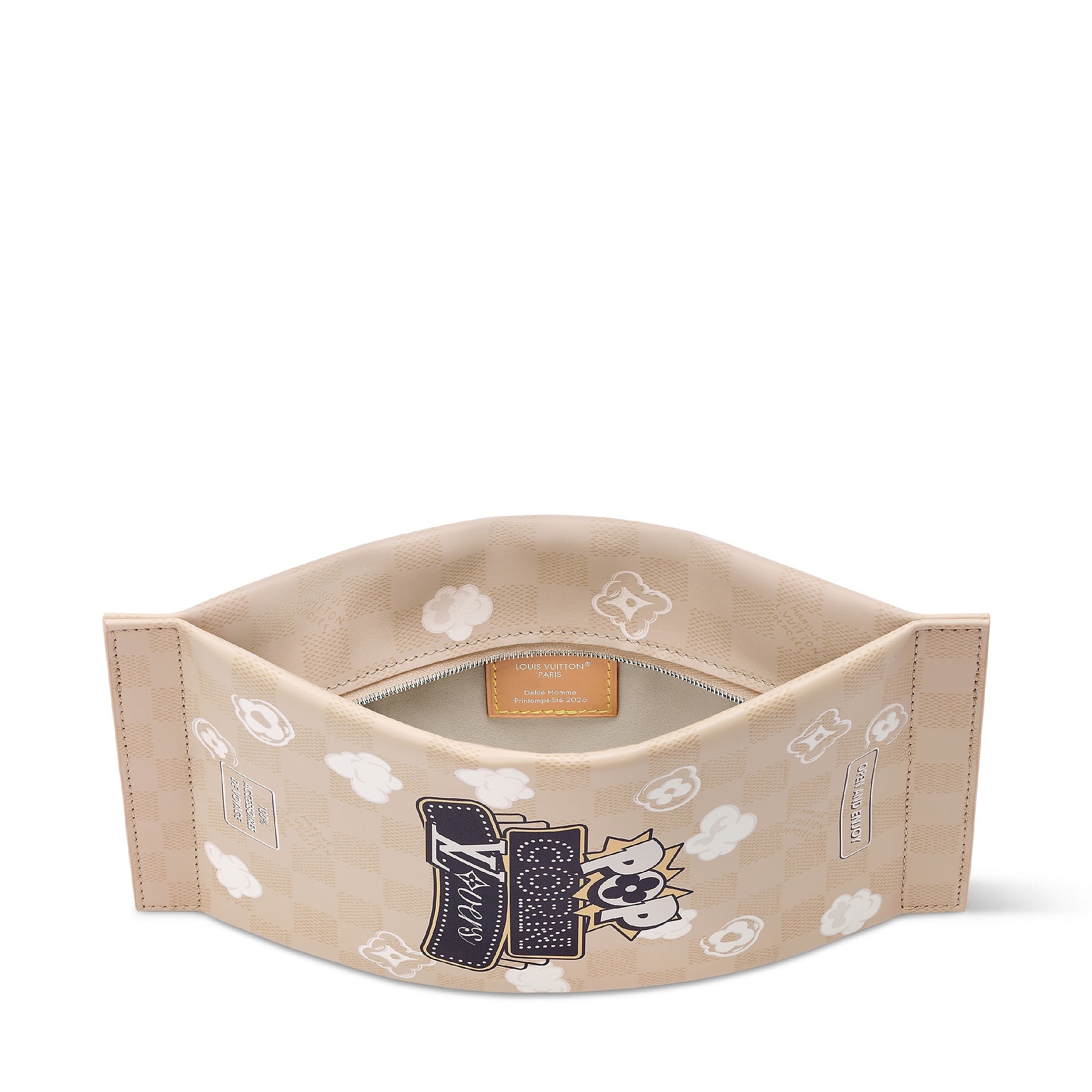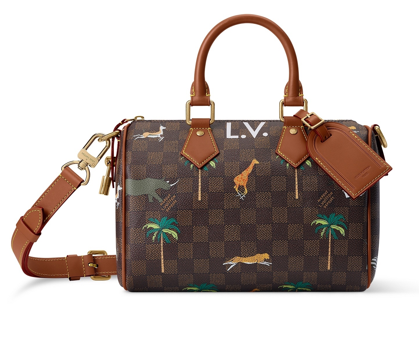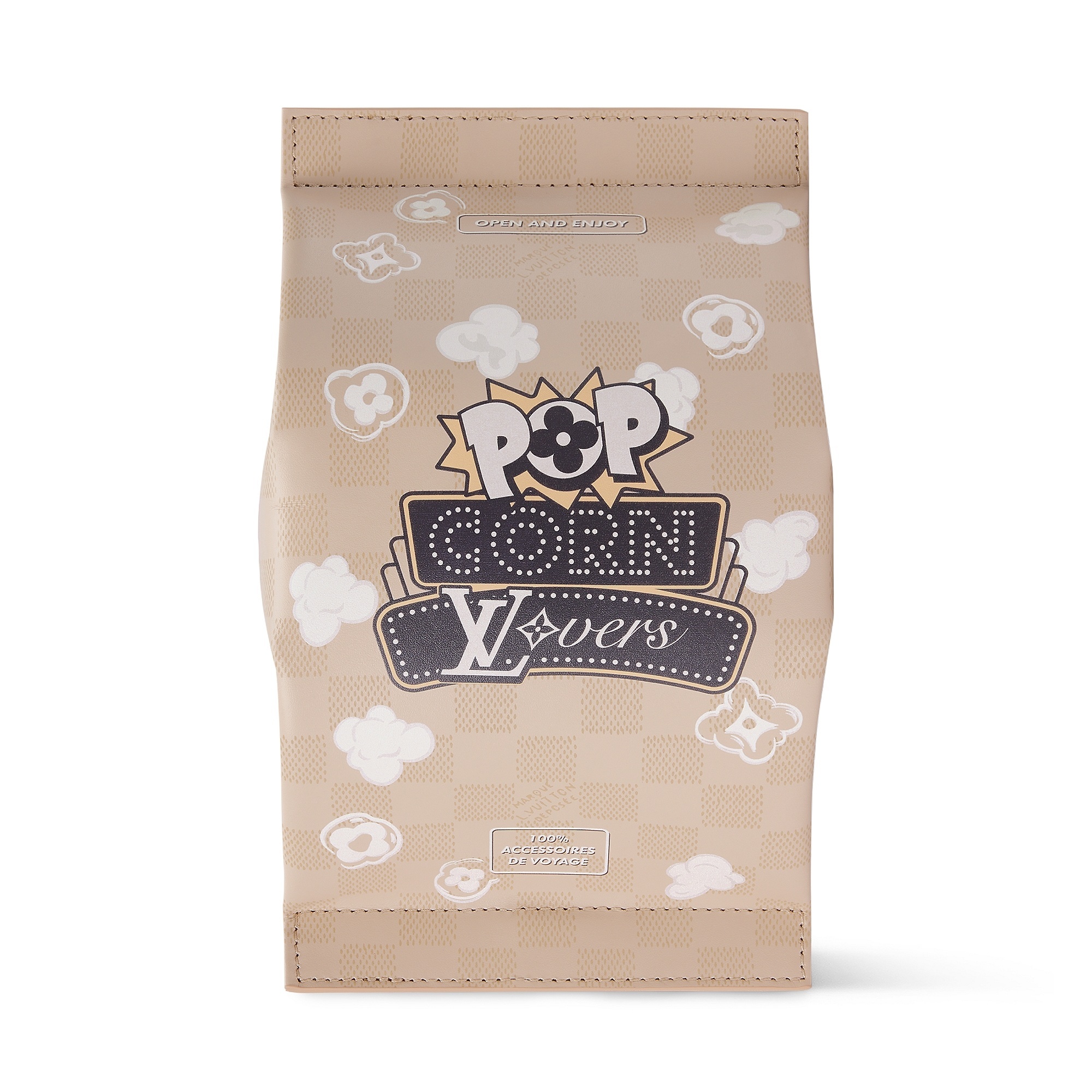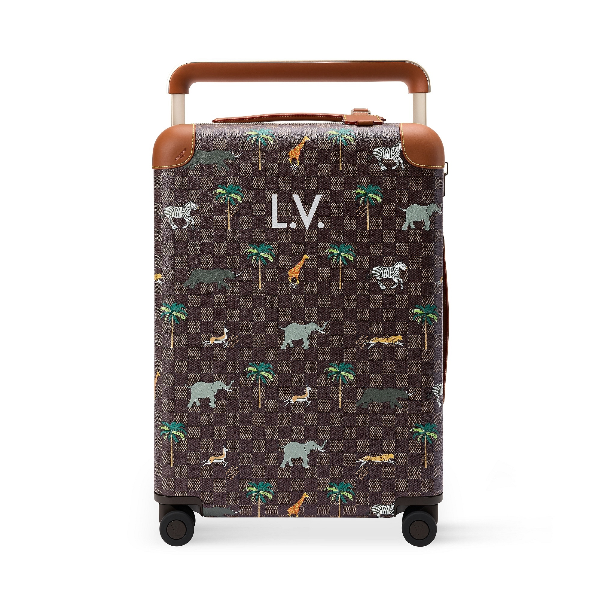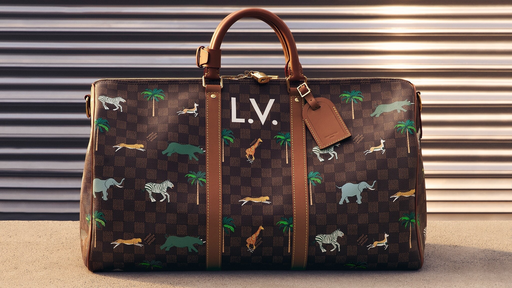 另一组包包采用 Damier Heritage 棋盘格帆布为背景,搭配野生动物穿梭于棕榈树间的印花图案和深棕色牛皮革饰边,充满辨识度的 L.V. 字母标识呼应电影中原版硬箱设计。推出 Speedy 18 和 25 手袋、Christopher 双肩包、Keepall 50 旅行袋、护照套、素描本、卡包等丰富单品,满足日常出行和差旅等各种场景需求。特别款 Pop Corn 爆米花盥洗袋采用 Damier 棋盘格纹牛皮革制作而成,趣味致意电影文化。