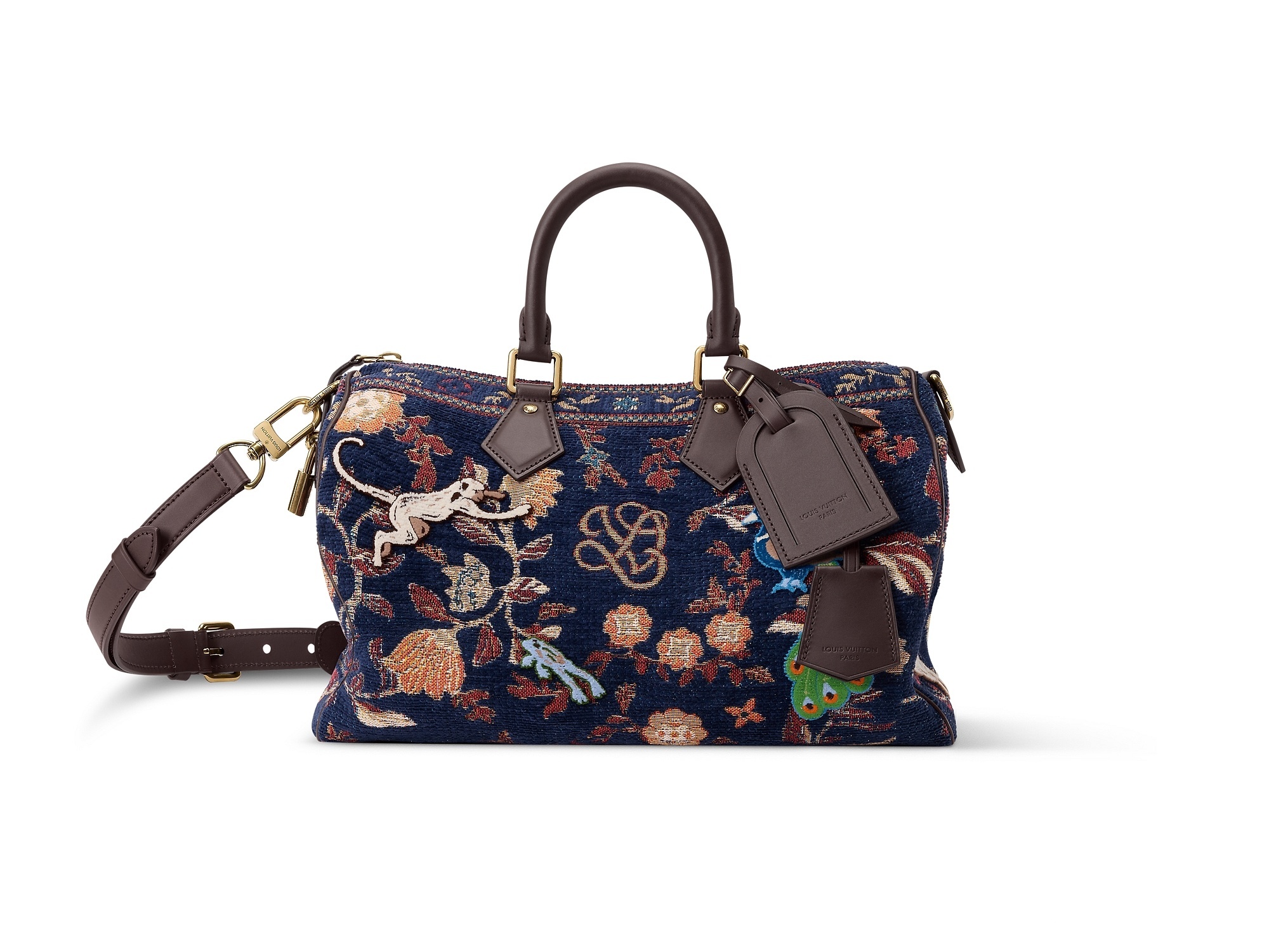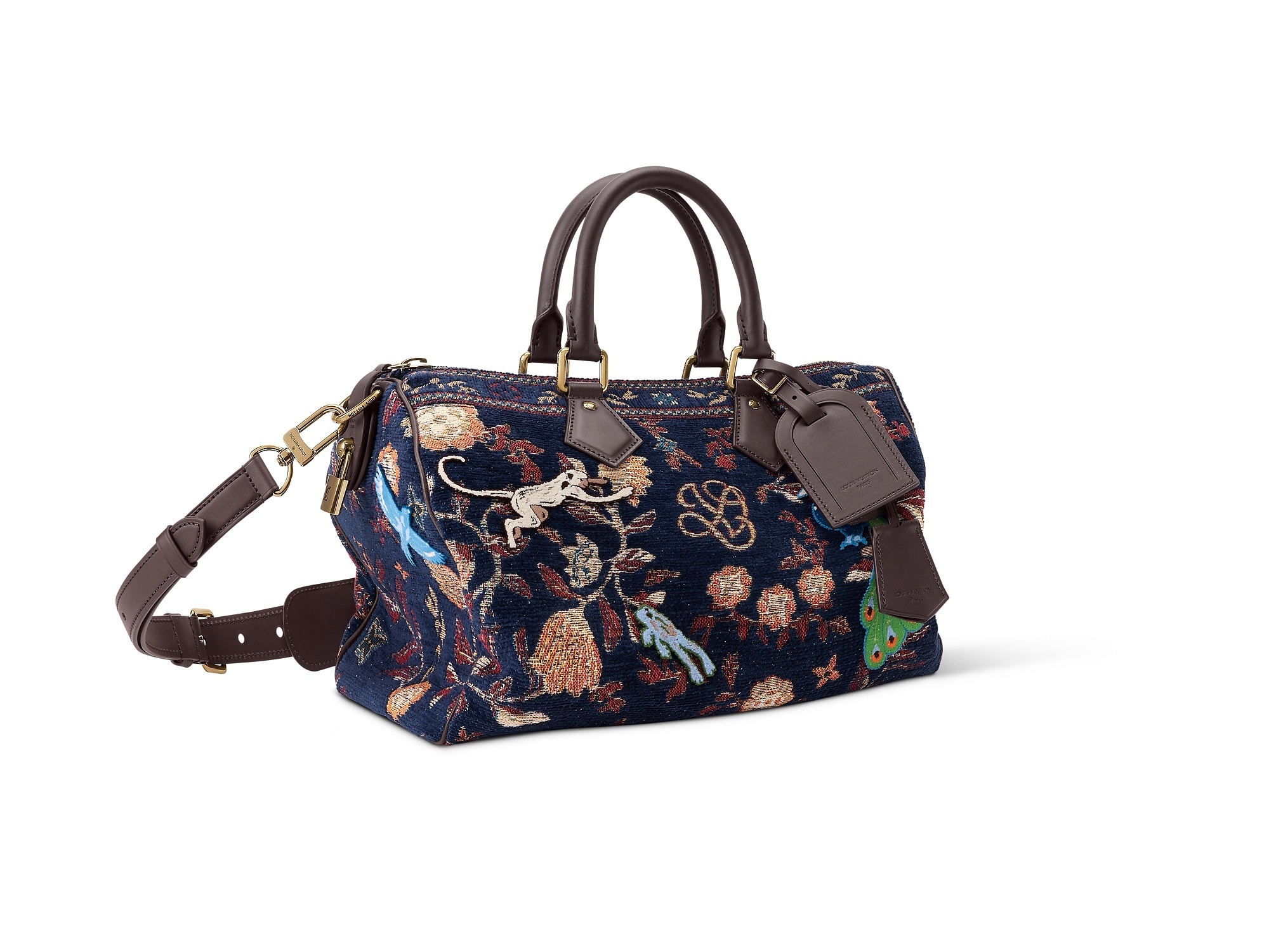 这只 Speedy P9 30 手袋采用提花针织工艺在包身呈现织锦般的「生命之树」动植物图腾,立体簇绒质感的动植物印花和 Monogram 图案巧妙交织,深邃皮革元素点睛饰边、顶部手柄和名牌,令灵动设计更添雅致。