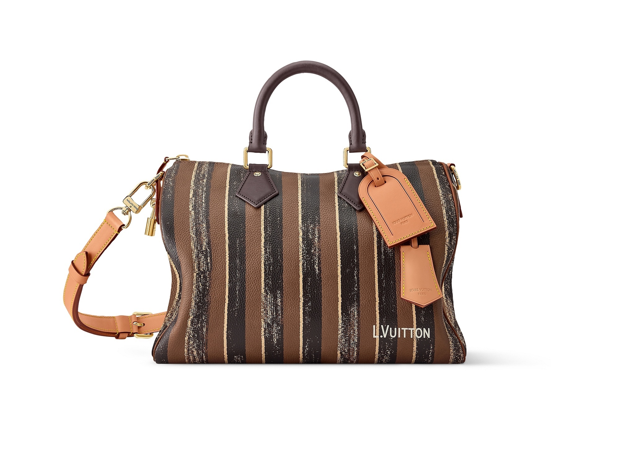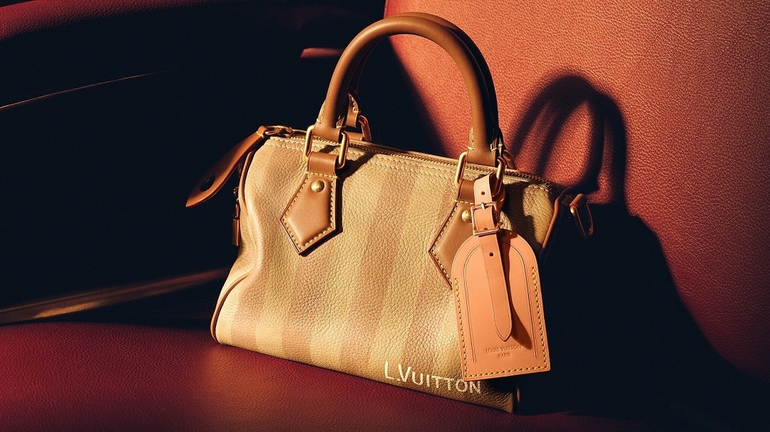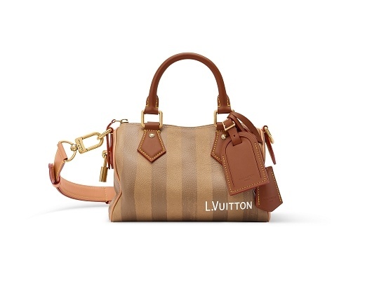 条纹印花款 Speedy P9 手袋回溯19世纪末路易威登硬箱的经典 Rayee 条纹图案,并受到印度板球服饰启发,在柔软皮质上呈现褪色效果条纹图案,犹如旅程和时间侵蚀后留下的印记。
