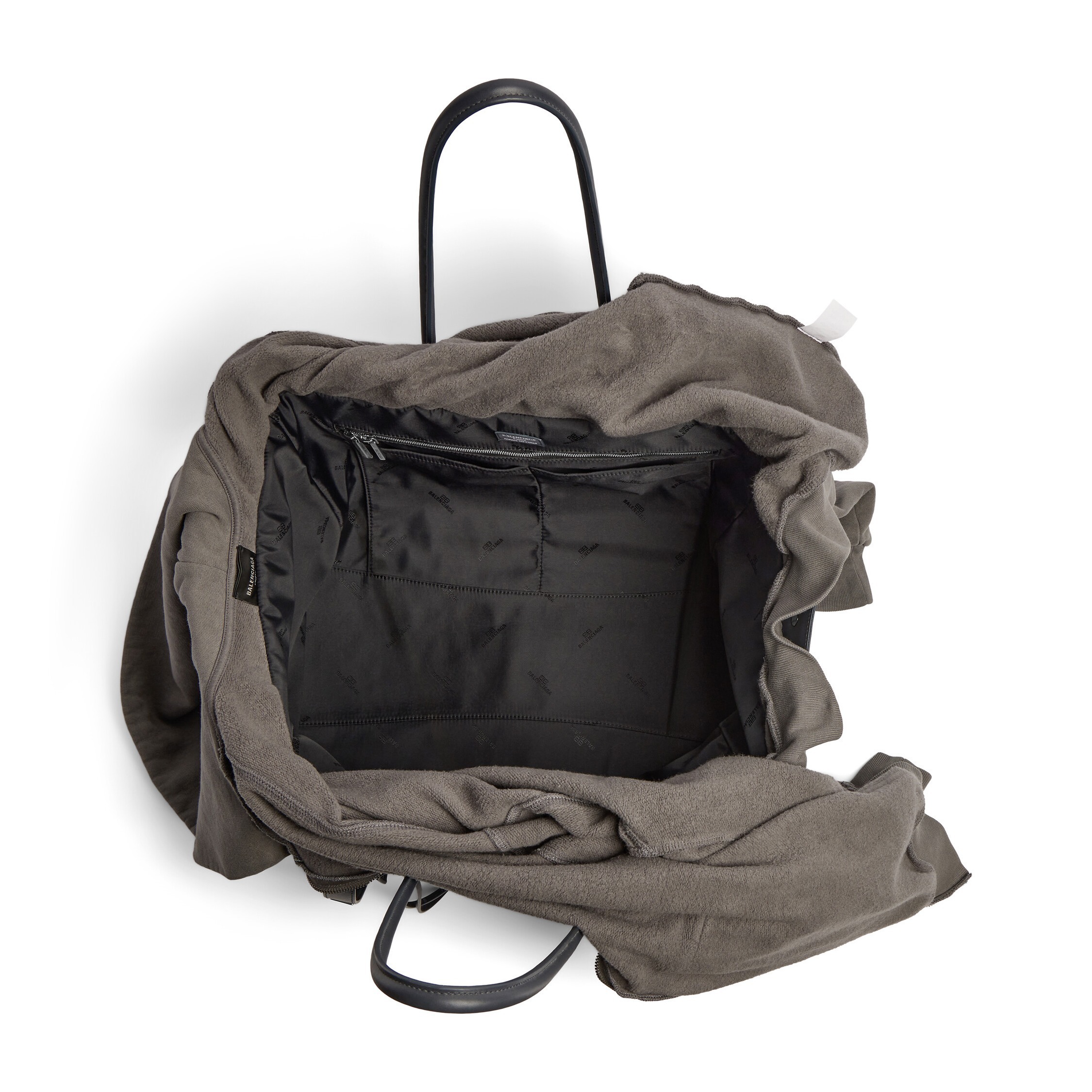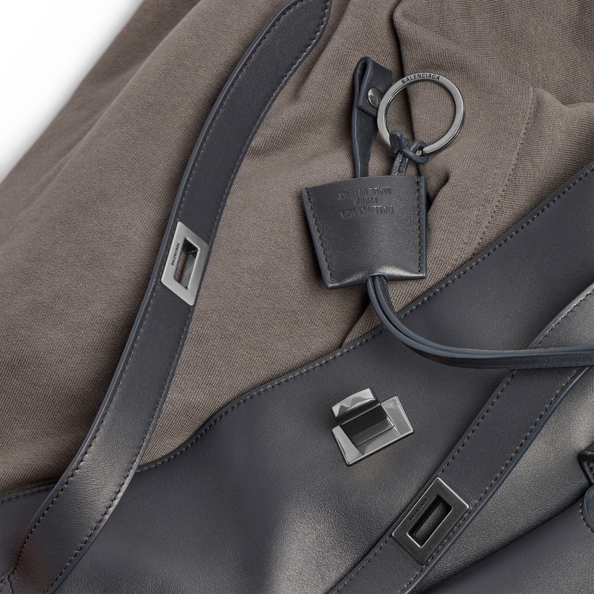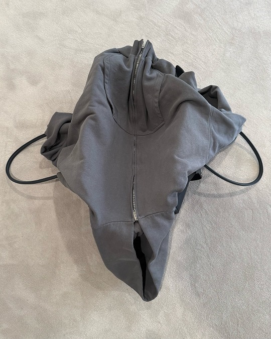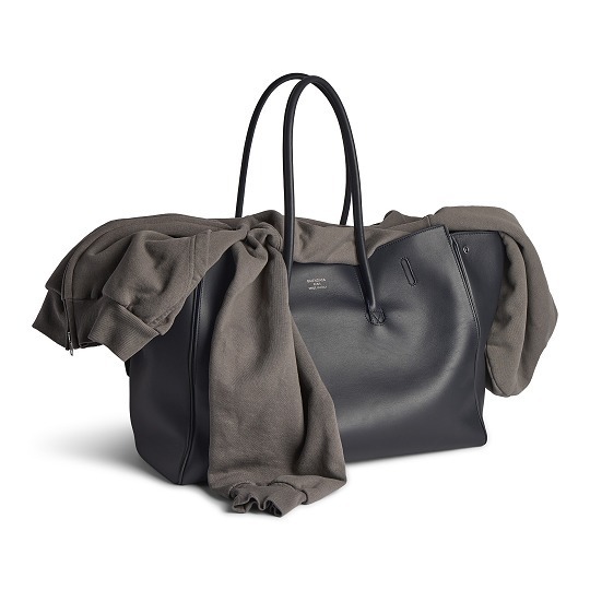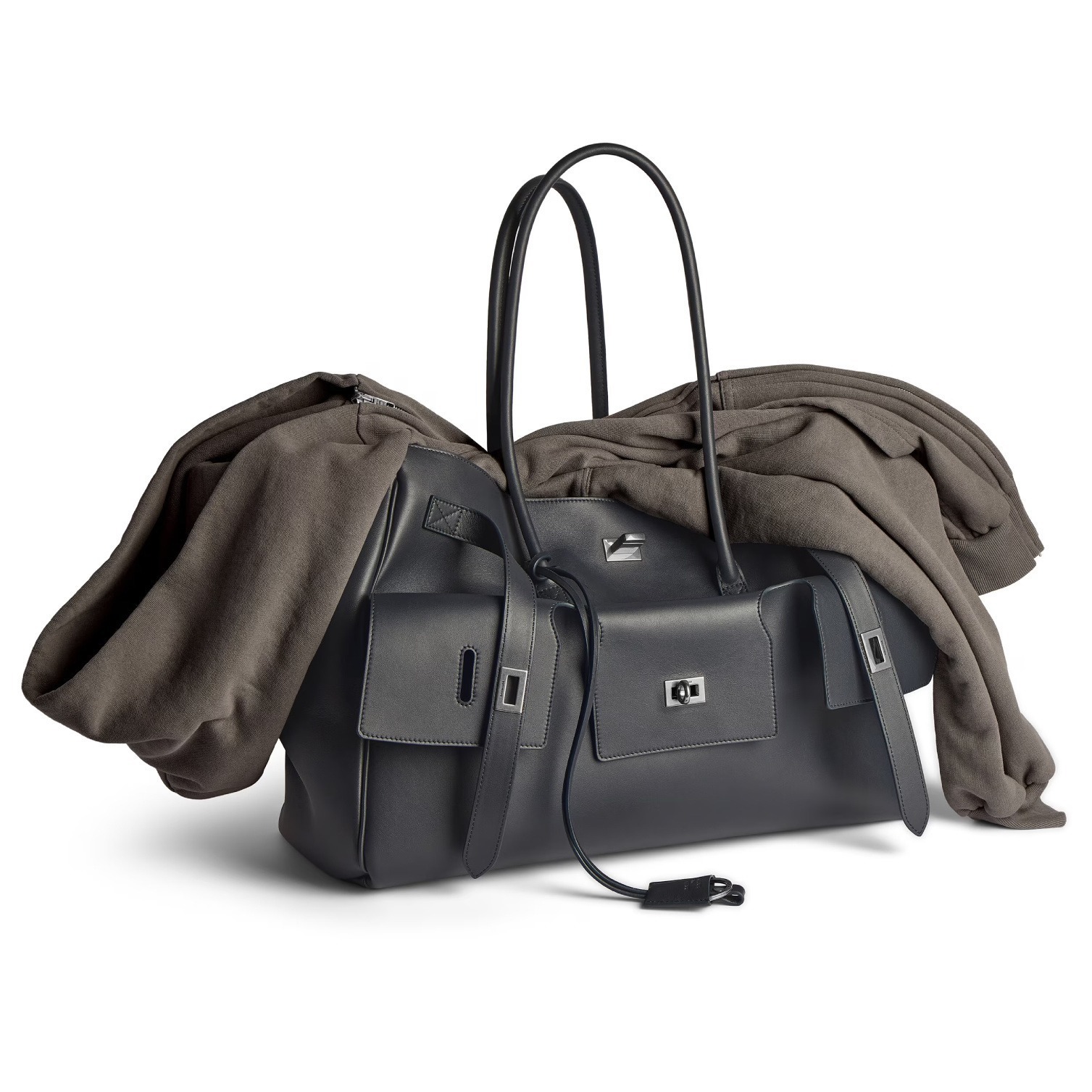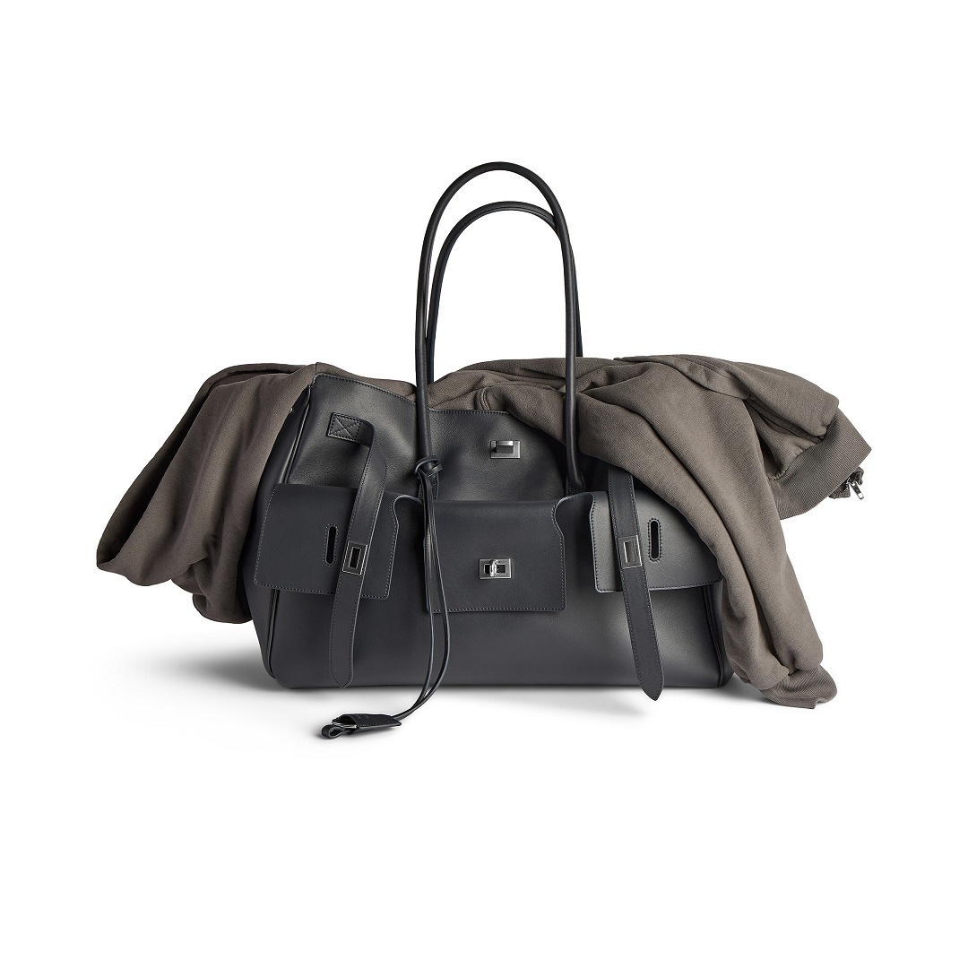 BALENCIAGA Subway Bel Air Carry All 手袋来自品牌夏季25秀场,Demna 以地铁乘客将衣服随手塞进包里的场景为灵感启发,直接把一件灰色连帽卫衣固定在了 Bel Air 手袋的顶部,卫衣的拉链巧妙化作包包的开口,帽子和袖子则随意耷拉在两侧,「假两件」的设计呈现叛逆玩味的街头风格。