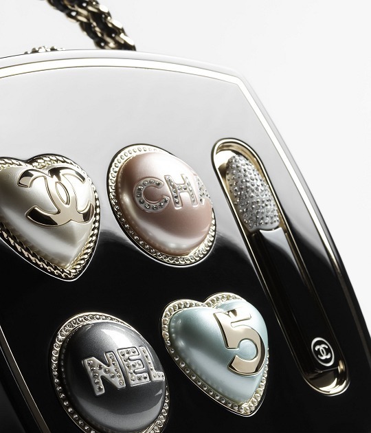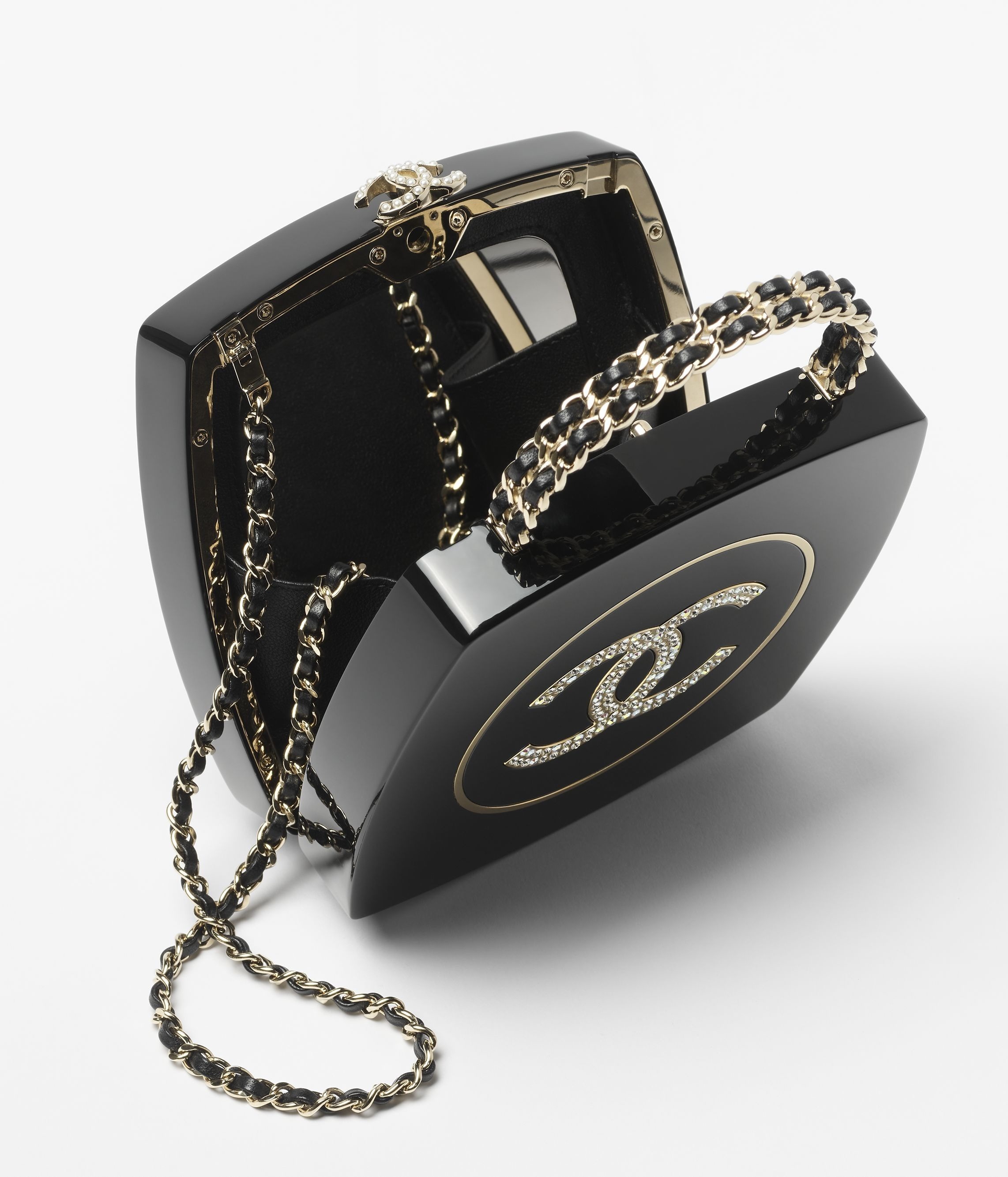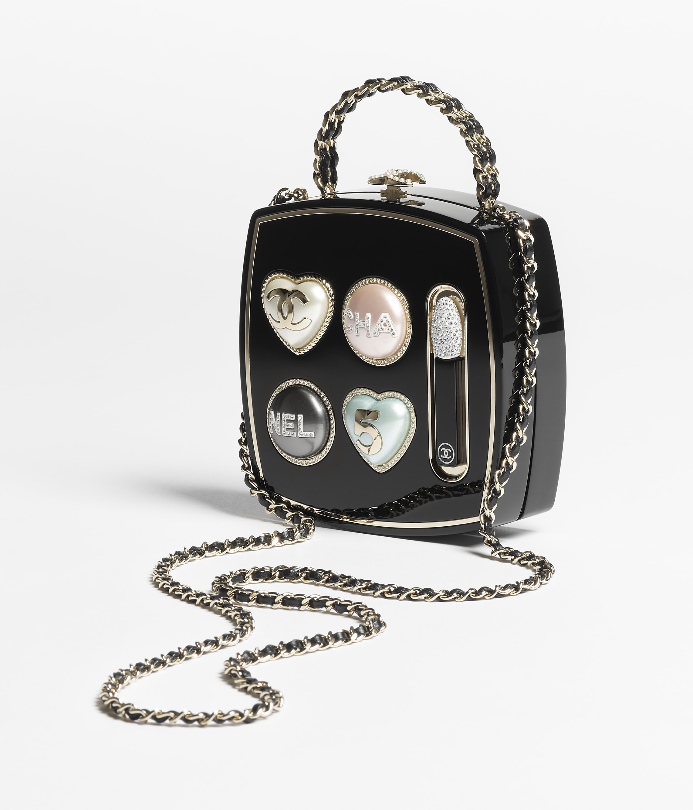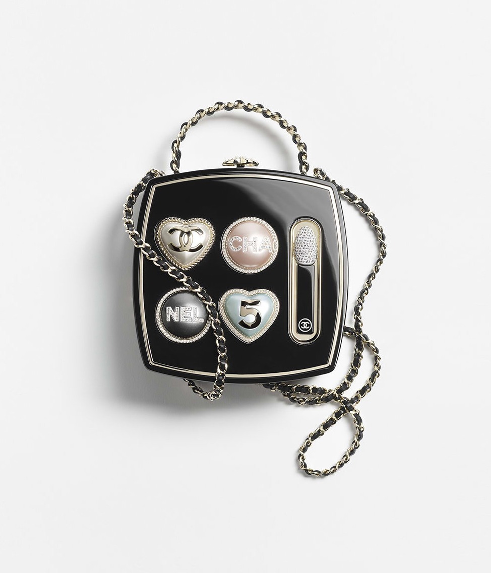 CHANEL Makeup Palette 彩妆盘晚宴包生动还原品牌四色眼影盘设计,包包采用黑色树脂玻璃搭配金色边框,4色眼影区域采用立体弧面设计并融入俏皮的心形图案,右侧还配有专属的水晶眼影棒,拎在手里就像是芭比娃娃的精致配件。闪耀水钻和树脂珍珠勾勒 CHANEL 字母、双C包扣、数字5等品牌标志性符号,背面还有水钻镶嵌的超大双C徽标。包包配有皮穿链拱形手柄和可内外翻转的长链条,可以手拎、肩背或者斜挎,内部配有小巧补妆镜,无论派对、晚宴都能成为引人注目的焦点,展现优雅与玩味兼具的风格。