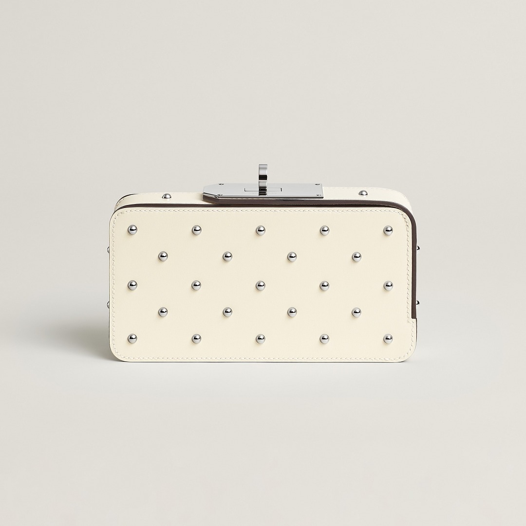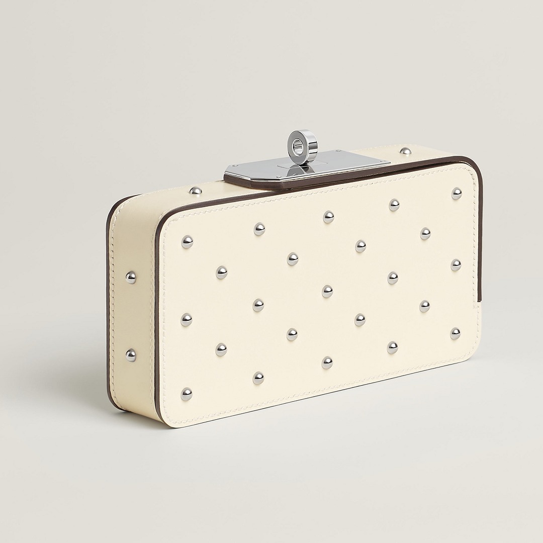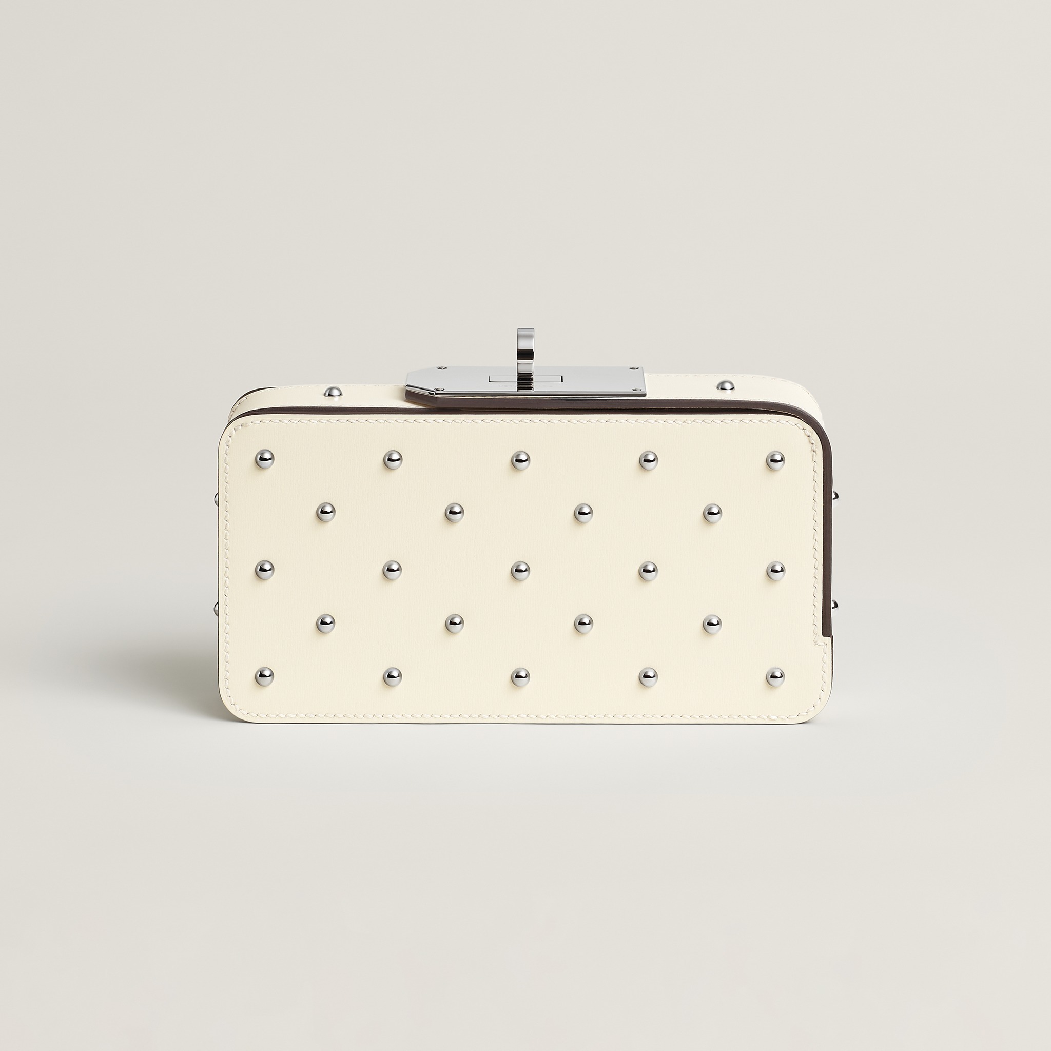 Hermès 2025秋冬系列推出 Sanglons Cloutée 晚宴包,采用奶油色小牛皮塑造小巧洗练的盒型轮廓,经典 Kelly 旋转锁扣幻化为包包侧面的超大金属扣,抛光钯金铆钉镶饰包身,呈现既精致又前卫的风格。