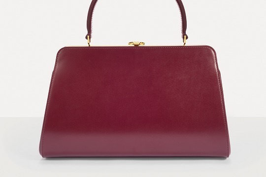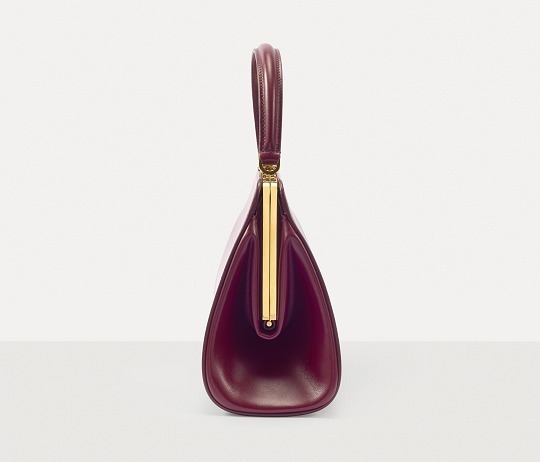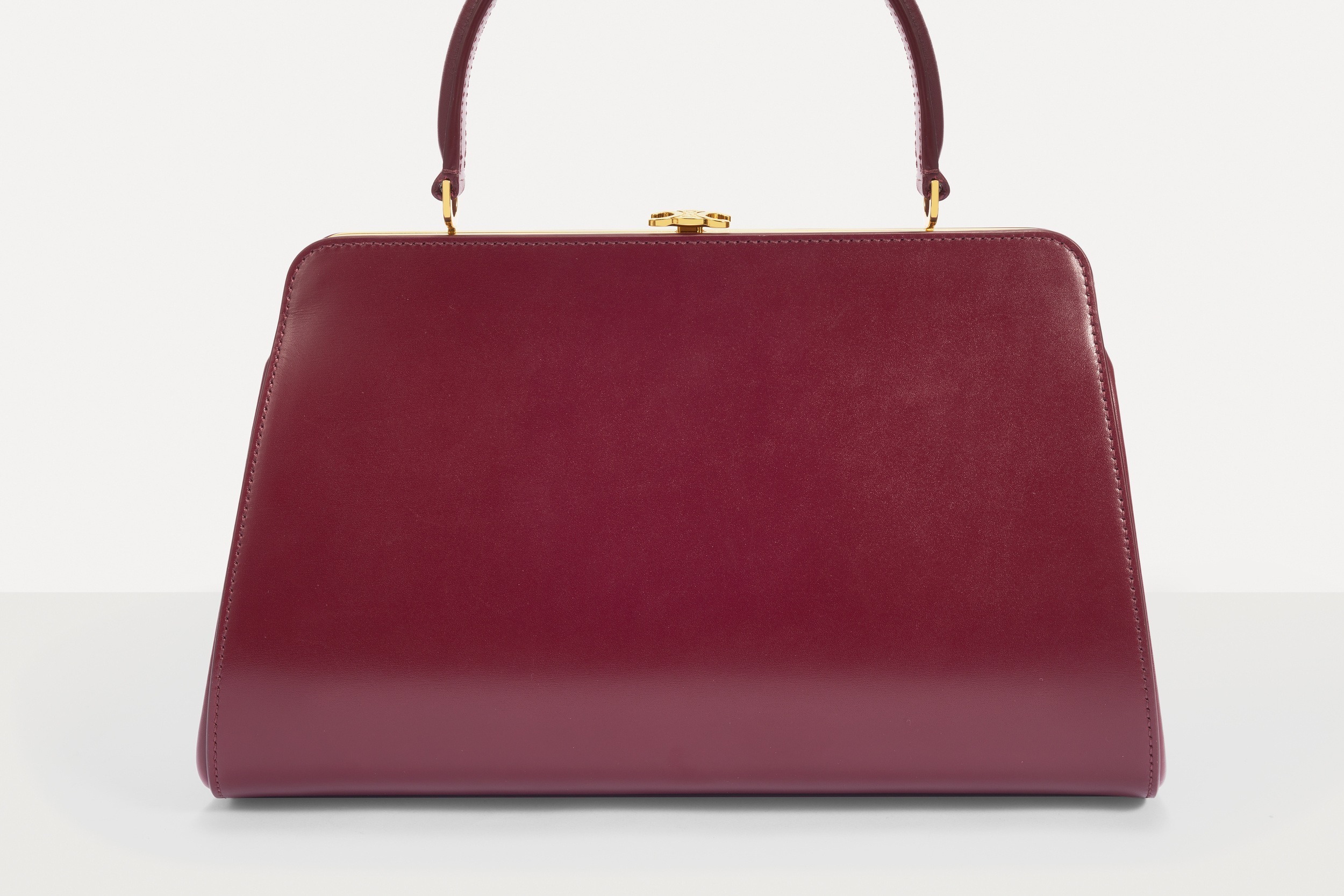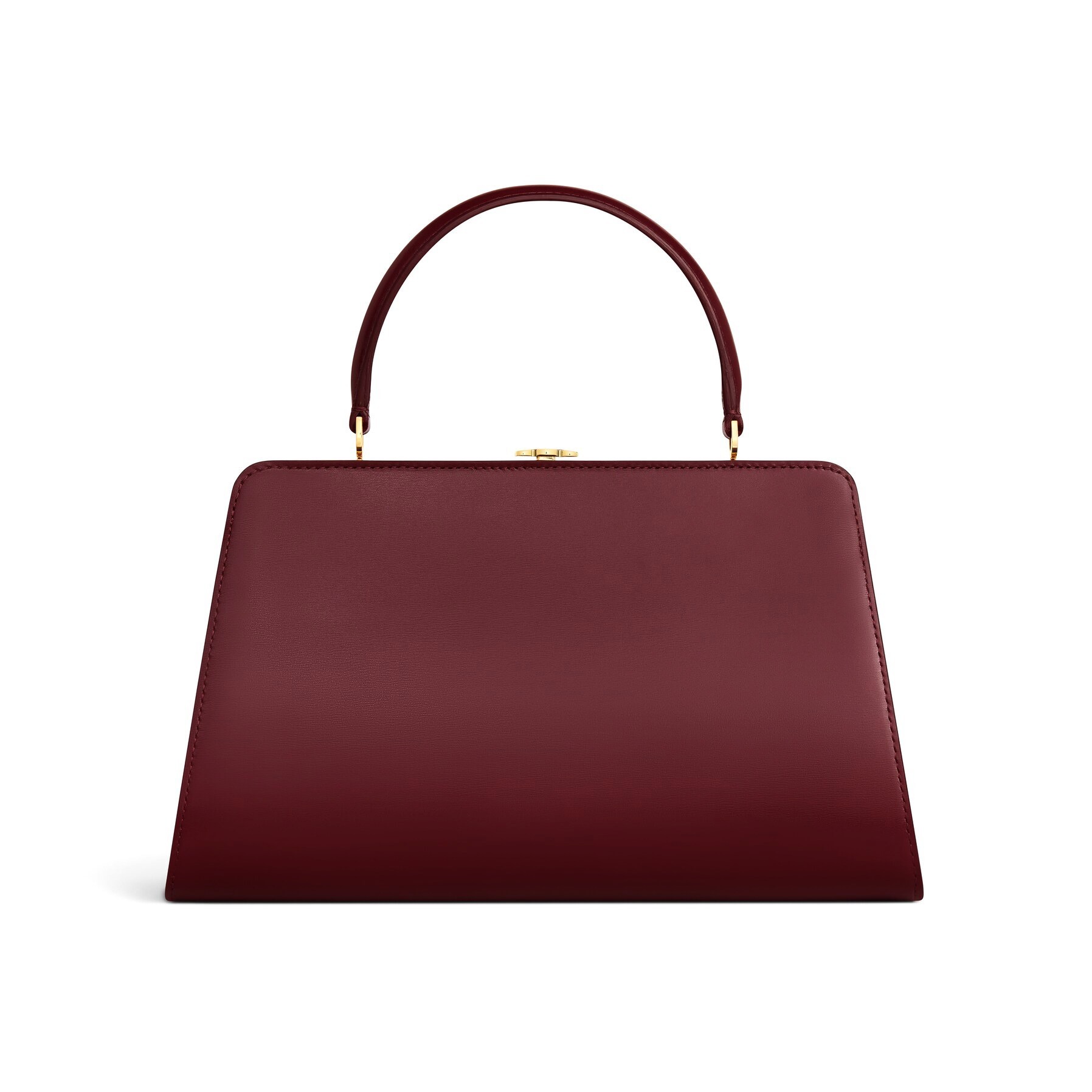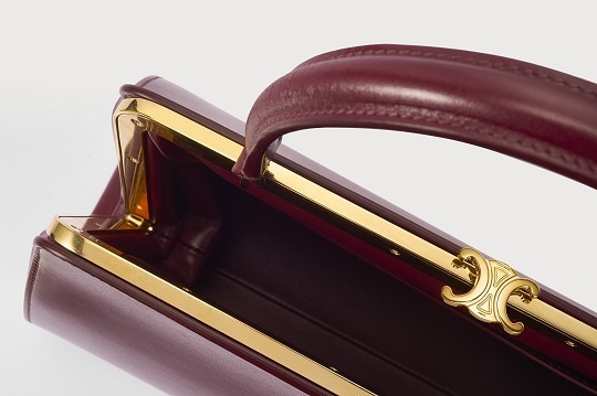 顶部包扣融入新 CELINE 最具辨识度的 Triomphe 凯旋徽标设计,灵感来自巴黎凯旋门广场前的锁链,由创始人 Céline Vipiana 女士于1972年设计构思。缎面小牛皮包身渲染波尔多酒红色,撷取自法国波尔多地区红葡萄酒的颜色,介于红色和紫色之间的深红色调宛如一杯馥郁香醇的红酒,优雅而迷人。