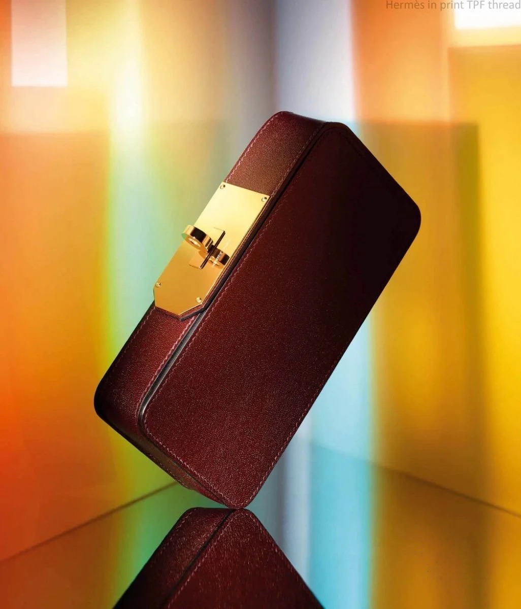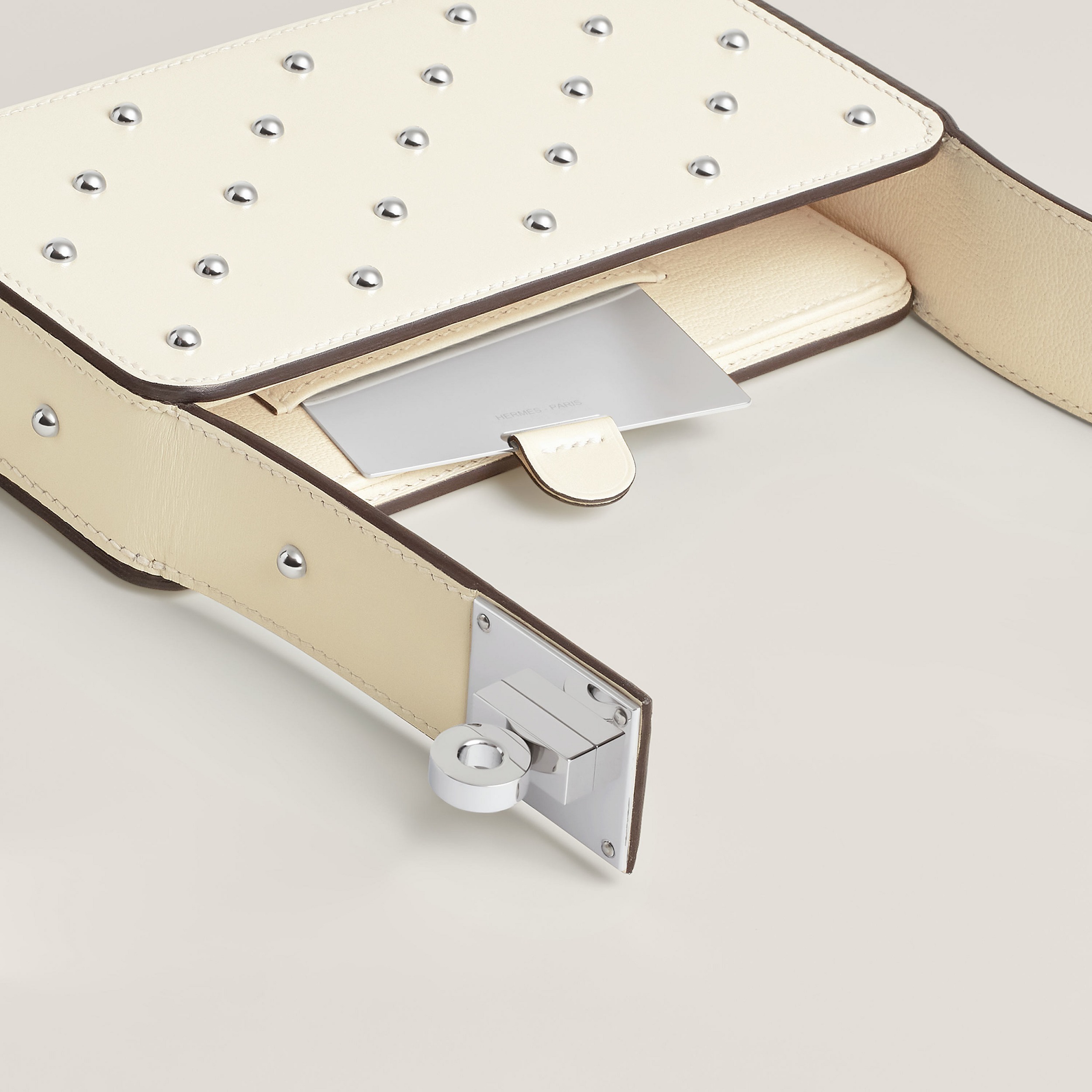 超大尺寸的 Kelly 轴扣成为这只包包上最具辨识度的设计元素,这一金属配件最早被运用在1930年代 Kelly 手袋上,中心镂空的圆形 Touret 旋转锁扣搭配镌刻 HERMES 徽标的方形锁孔,只需旋转轴扣便可开启包盖,灵巧又有仪式感。包包内部恰好可以放入手机,并贴心附有一面小镜子。