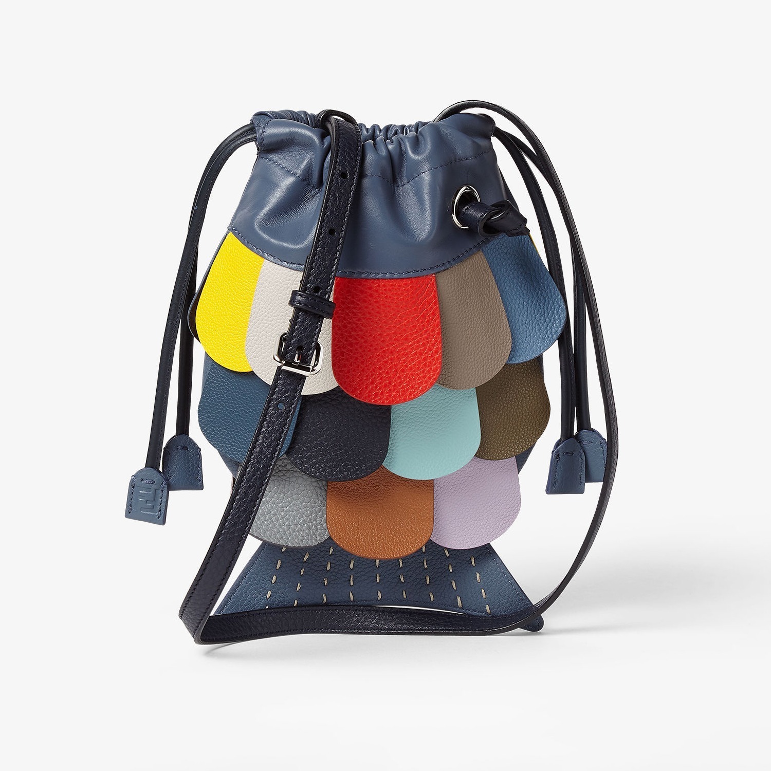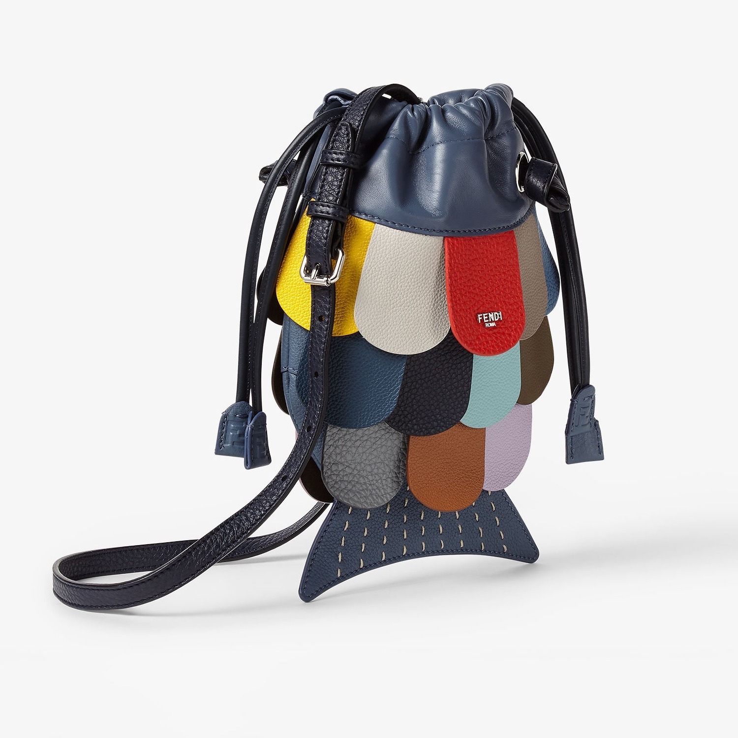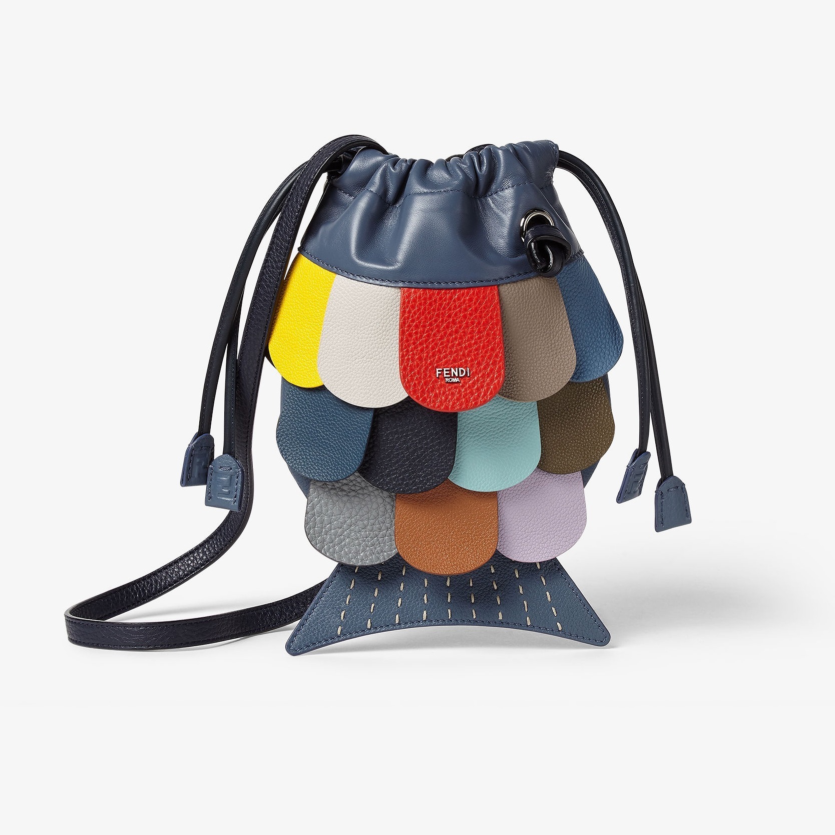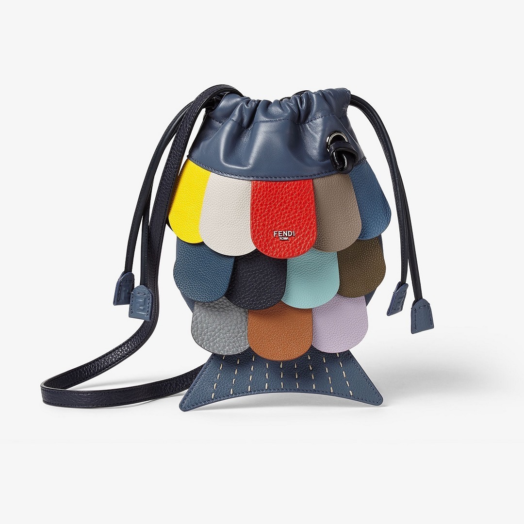 包包主体采用海军蓝色纳帕皮革和 Romano 粒面小牛皮拼缝而成,复古抽绳袋的结构恰好和游鱼的流线型轮廓契合,红色、白色、黄色、蓝色、灰色、紫色、绿色等不同色彩和纹理的皮边料被裁剪成鱼鳞形状,层叠拼缝于包身之上。尾鳍上饰有手工缝制的撞色 Selleria 车线,代表着源自1925年、由 FENDI 工匠世代传承的 Selleria 技艺。小巧精致的银色饰面 FENDI Roma 金属徽标镶嵌于正中间的红色鱼鳞之上,低调宣示品牌身份,可调节可拆卸肩带实现斜挎背法。