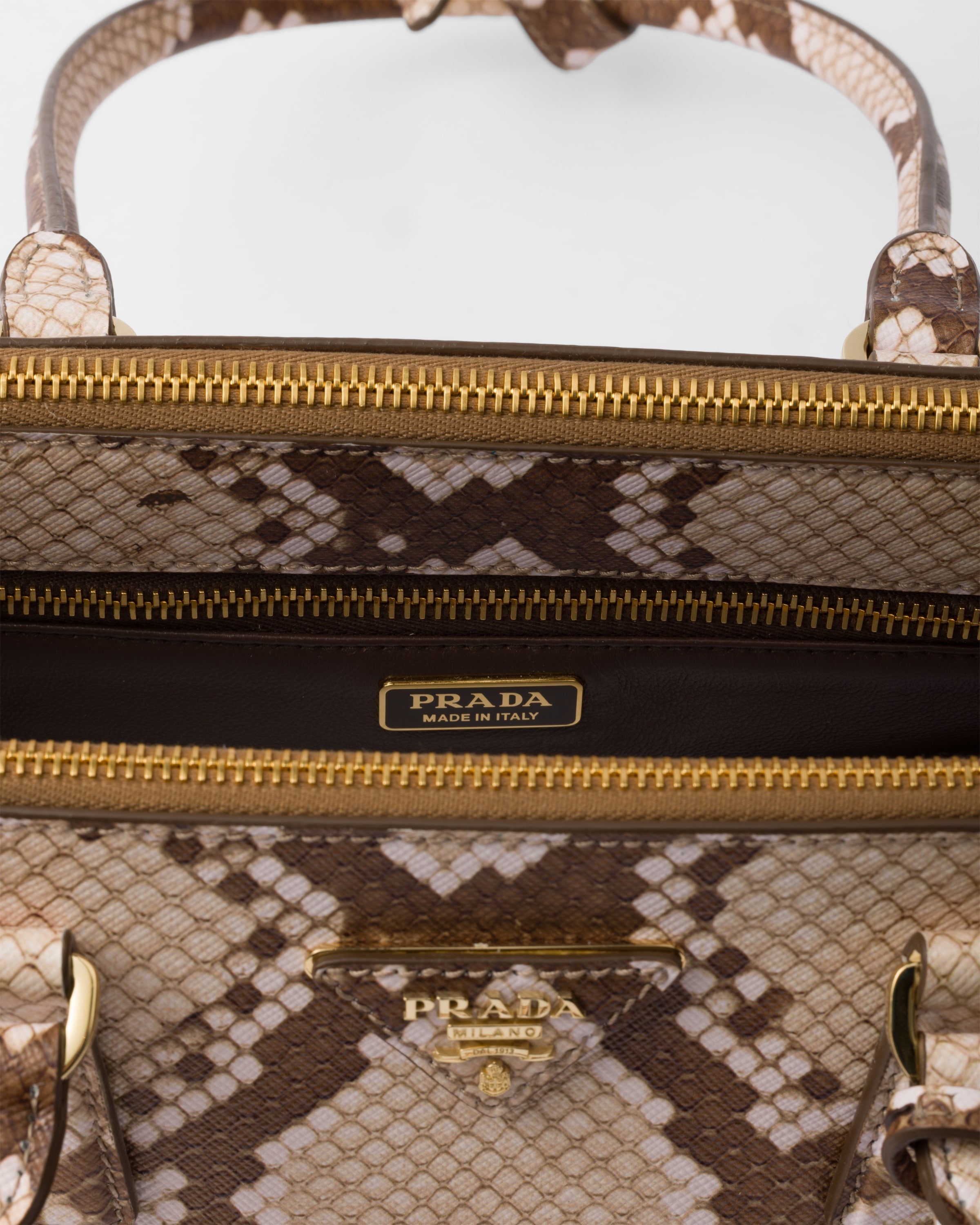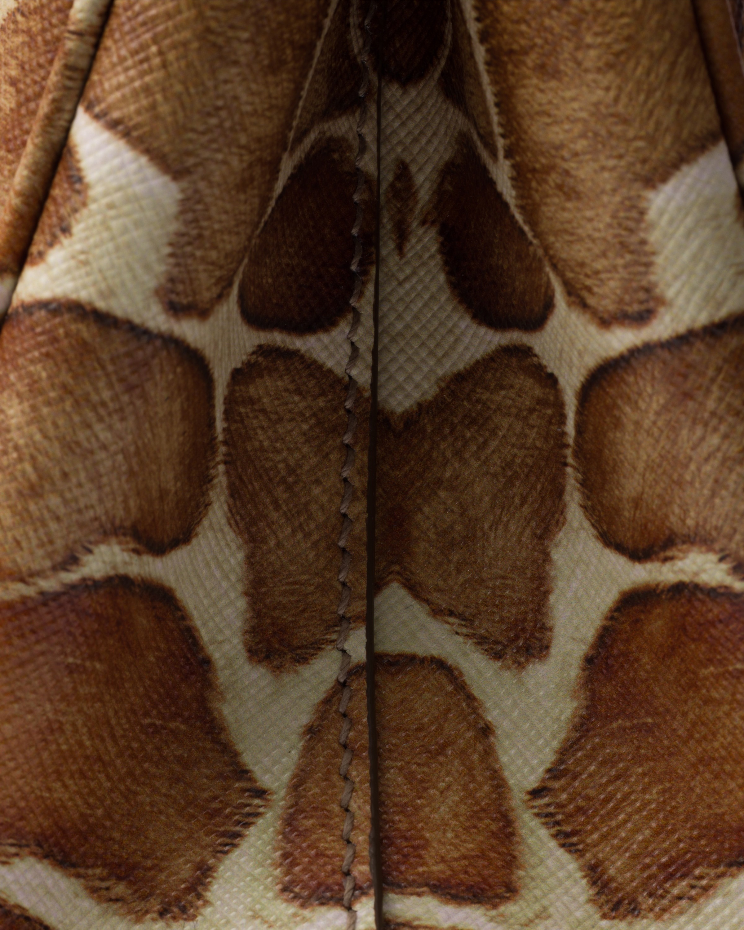 这款 Galleria 手袋采用品牌经典 Saffiano 十字纹皮革制作而成,包身巧妙融合两种动物纹印花,你可以看到蟒蛇和长颈鹿的斑纹被奇妙又和谐地拼接在一起,就像是动物园在开化装舞会。