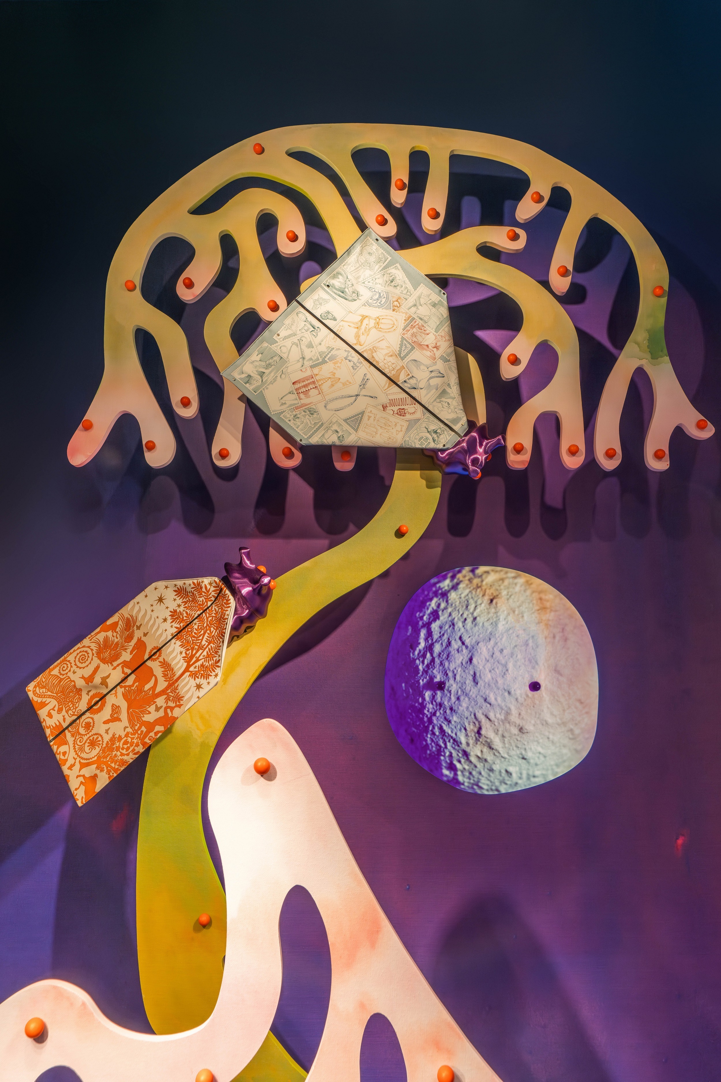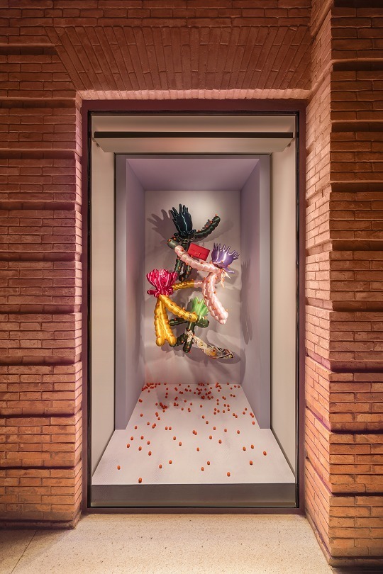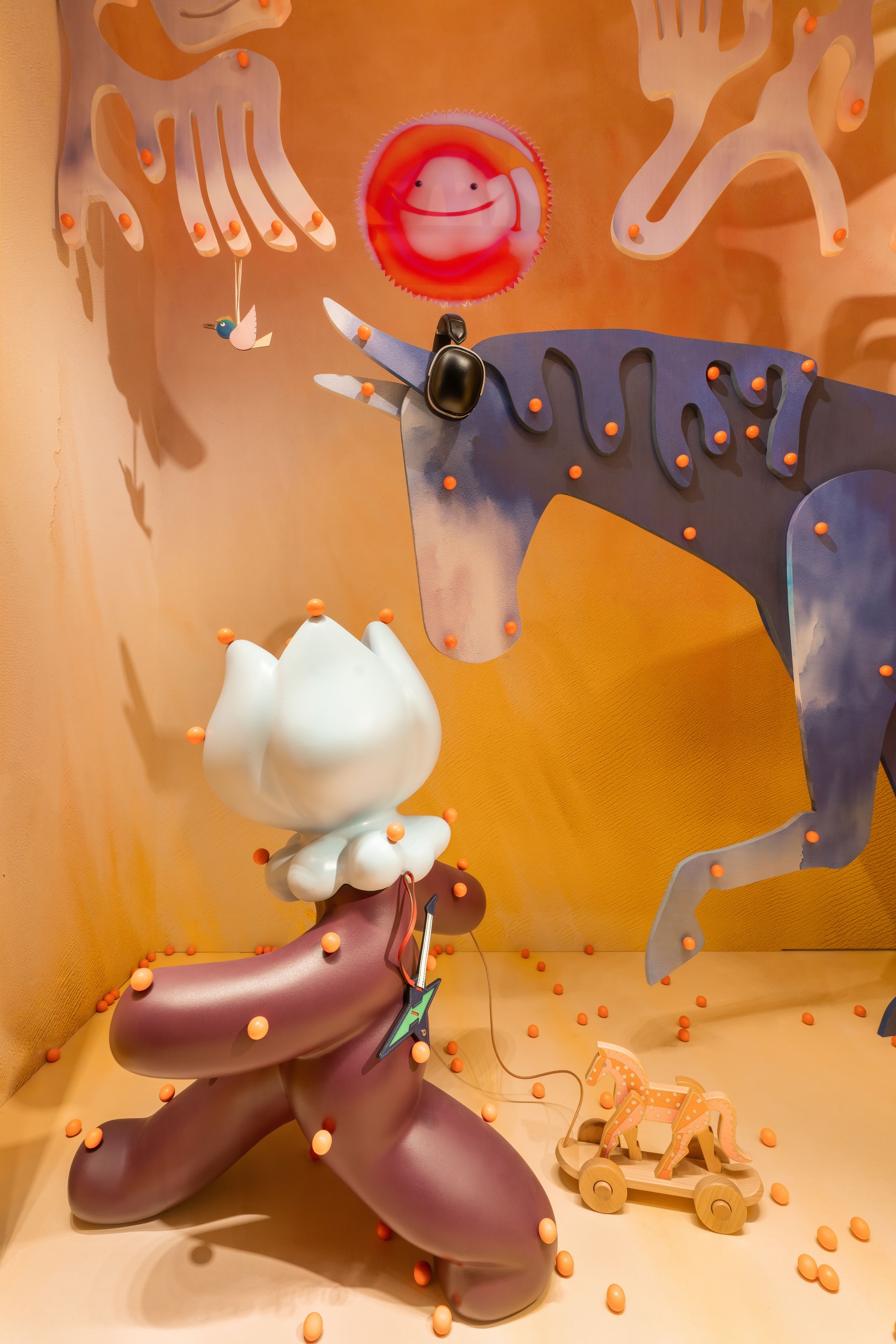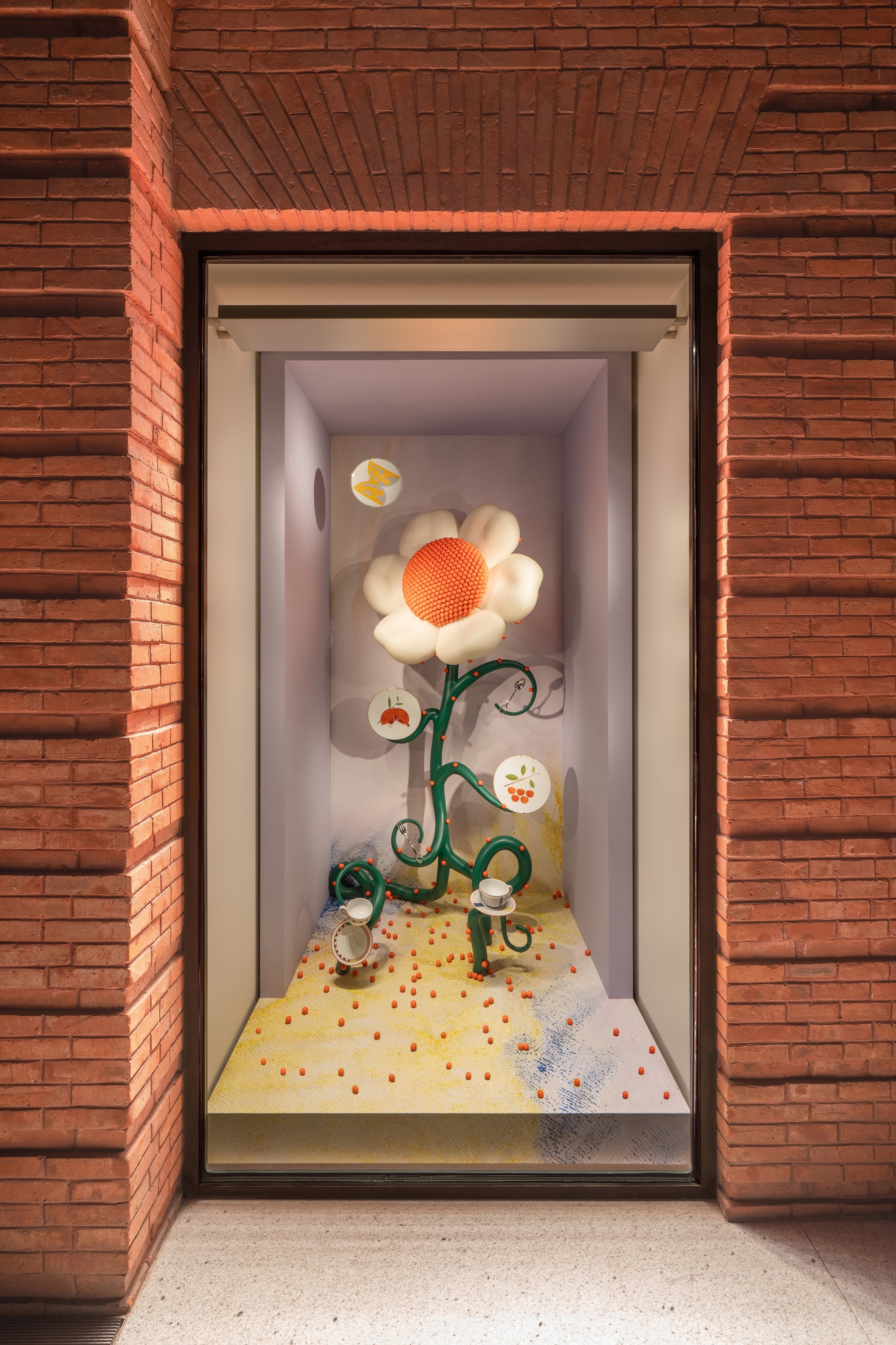 在整个橱窗装置中,真正的主角其实是那些圆圆的小小颗粒——那是盛开花朵的花粉。我们想以花粉为喻,提醒大家,我们皆是浩瀚天地的一部分。自然中那些环环相扣的联结,是支撑生命循环的关键,却常常被我们忽略。而在这件作品里,我们让花粉站到了C位,成为主角。