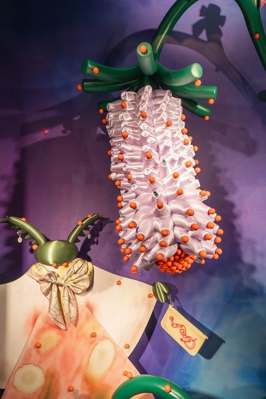女性世界橱窗定格于月光漫染的林地,树影或状若珊瑚,或形似菌丝;夜之华吐纳生机,橙色花粉浮游四散,唤醒以爱马仕丝巾为翼的飞蛾与昆虫。