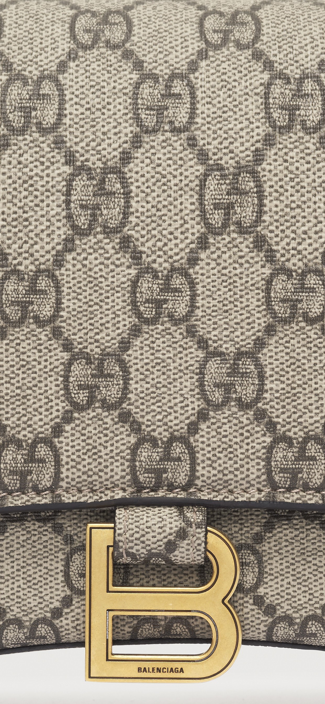 从外观来看,这只包包攫取了 Balenciaga 沙漏包的所有设计元素,从拱形提手到弧形底座,连B字母金属扣也照搬不误,但又让人一眼就觉得它是 Gucci 的包包,这必须归功于极具辨识度的 GG Supreme 老花帆布。