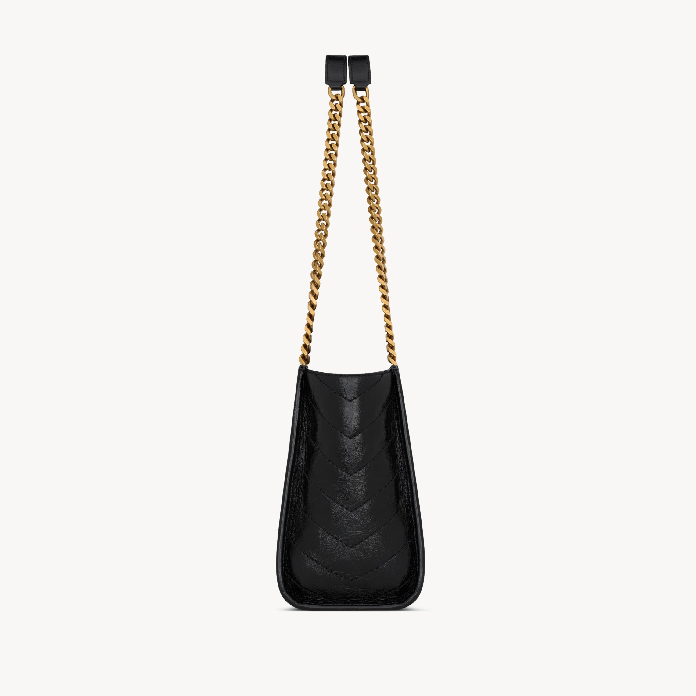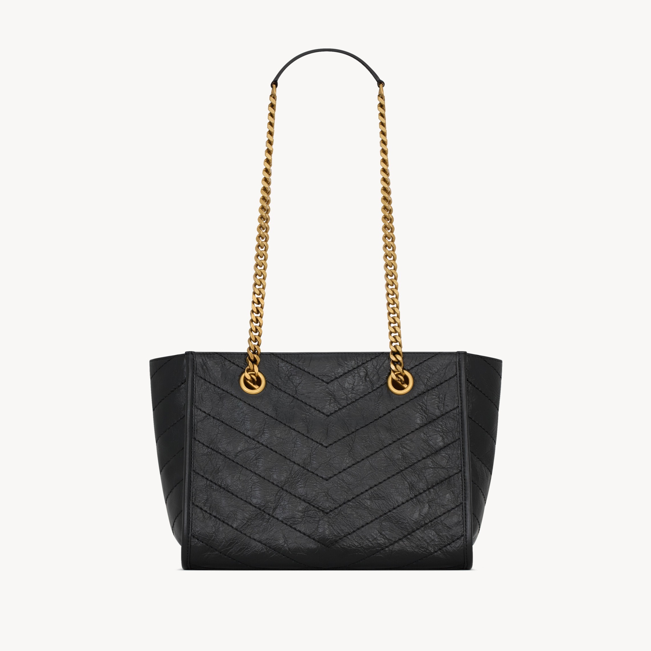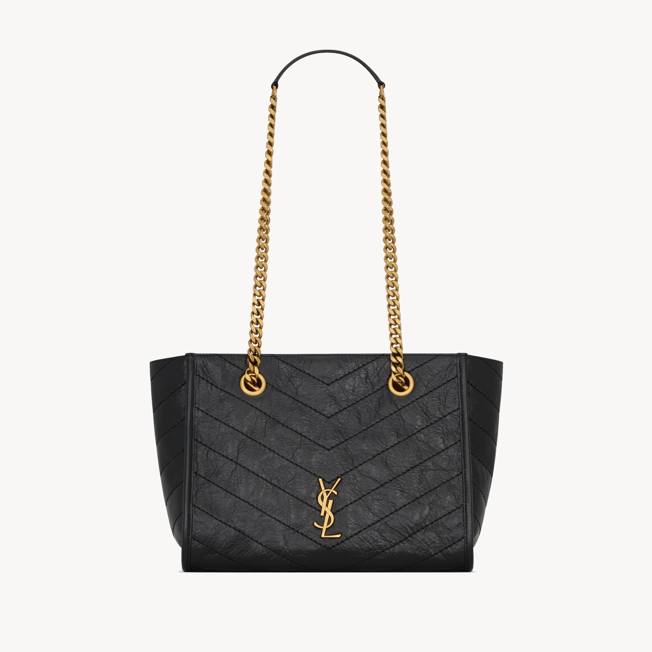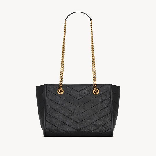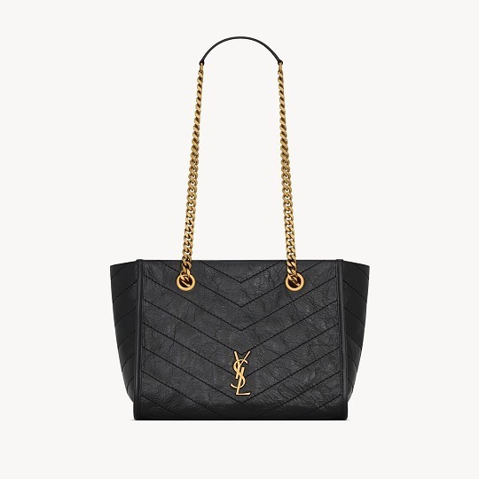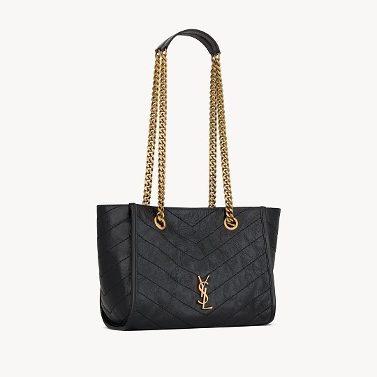 Saint Laurent Niki 系列推出新款小号 Shopper 购物袋,采用轻便宽敞的横款托特包型搭配链条肩带,复古牛皮革包身饰以古铜色 YSL Cassandre 徽标和V形明缝车线,经典黑金配色百搭且富有韵味。