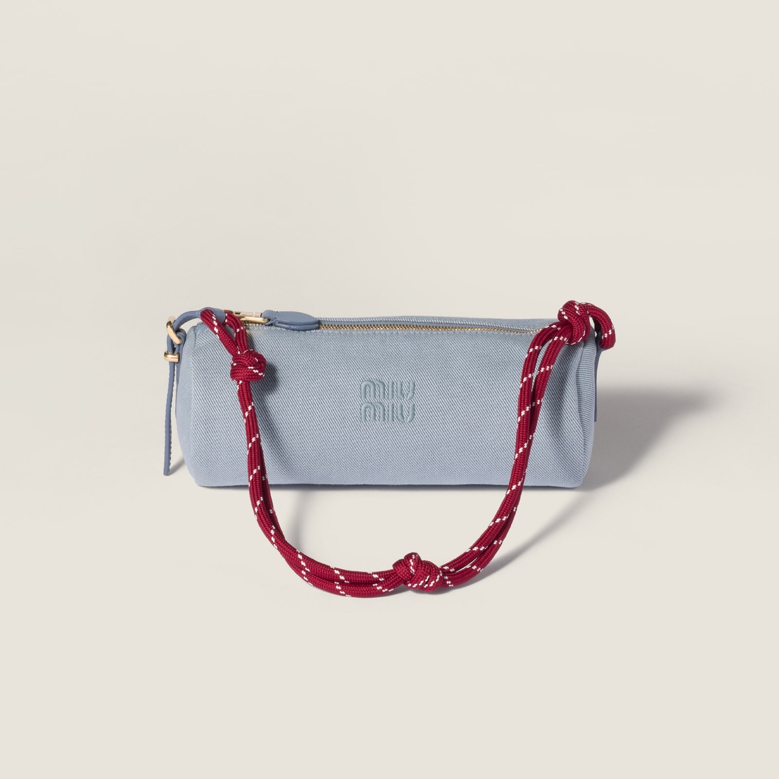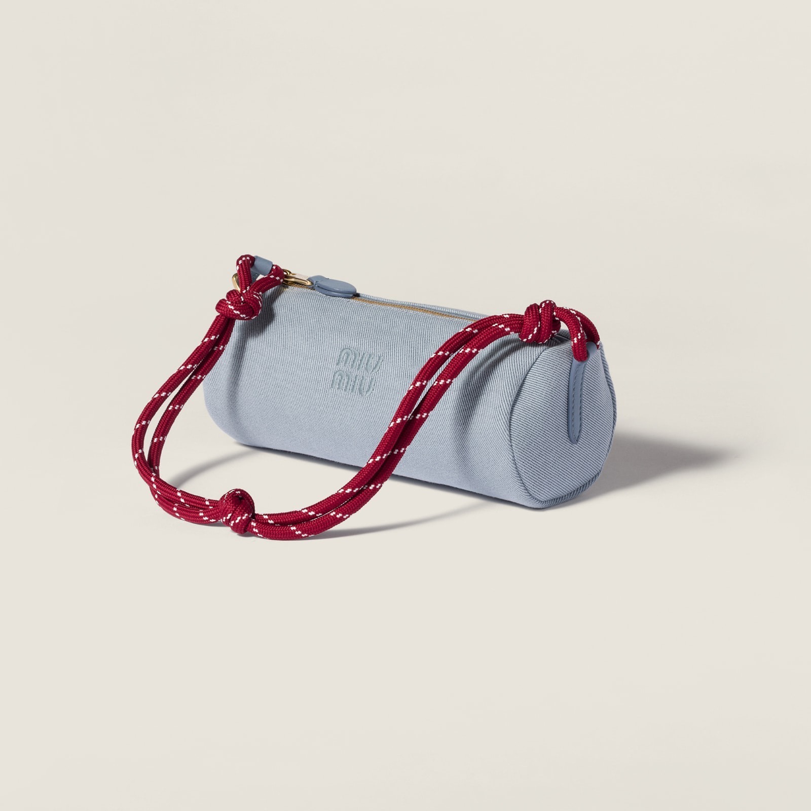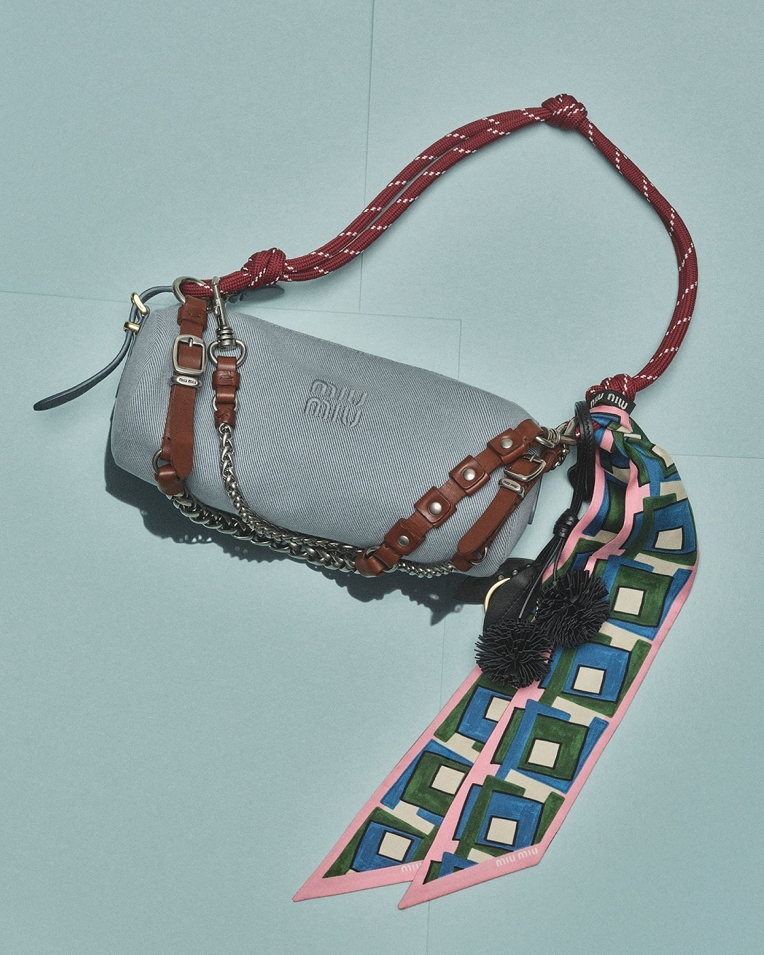 这只天蓝色笔筒包来自 Miu Miu 2026早春系列,采用轻便防水的华达呢(Gabardine)织物材质搭配同色系刺绣徽标,将实用功能融入时髦美学,紫红色/白色双色编织腕带为包包注入青春元气。