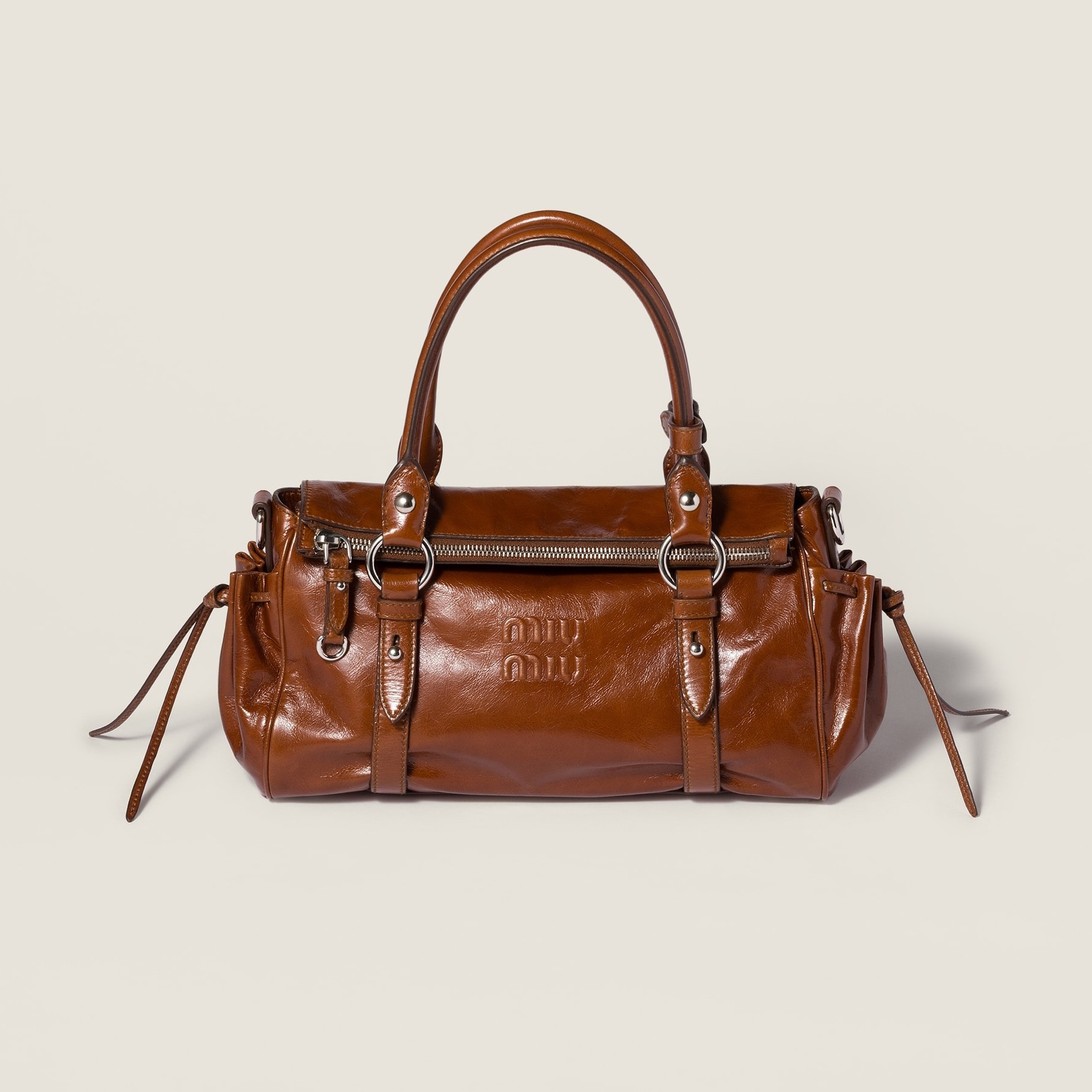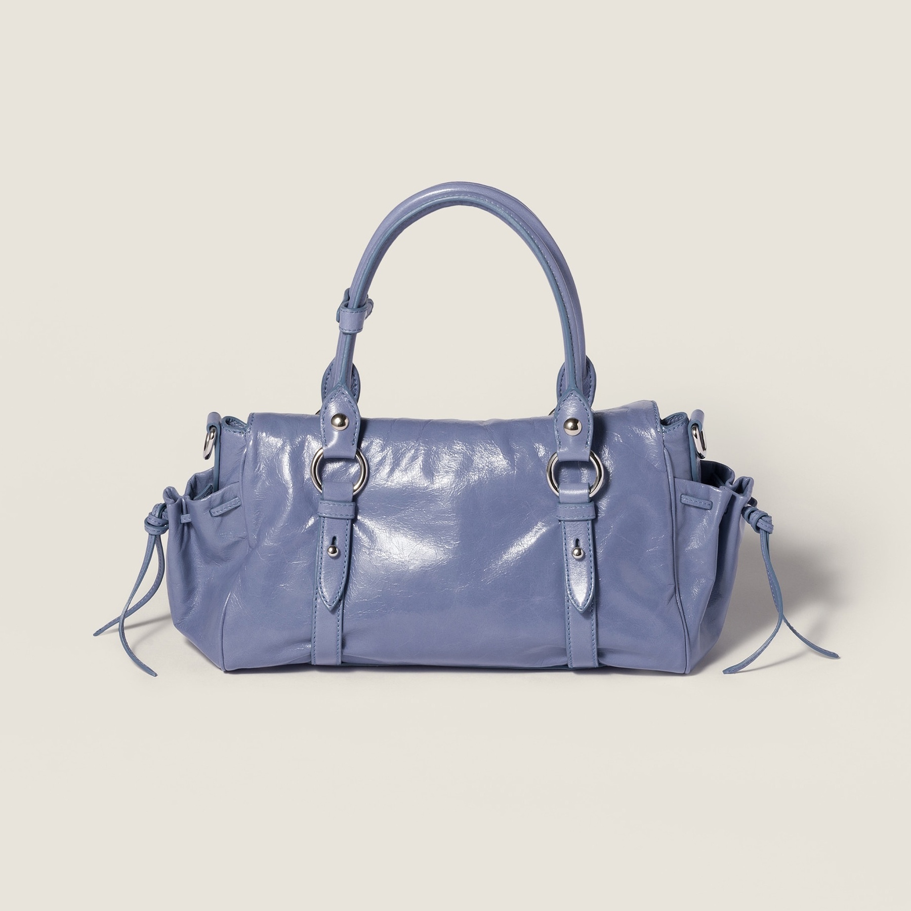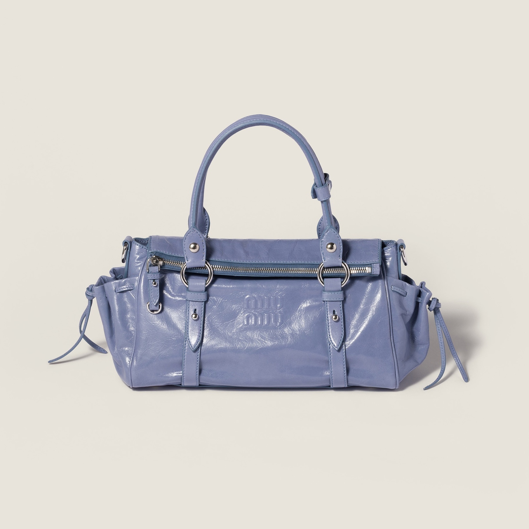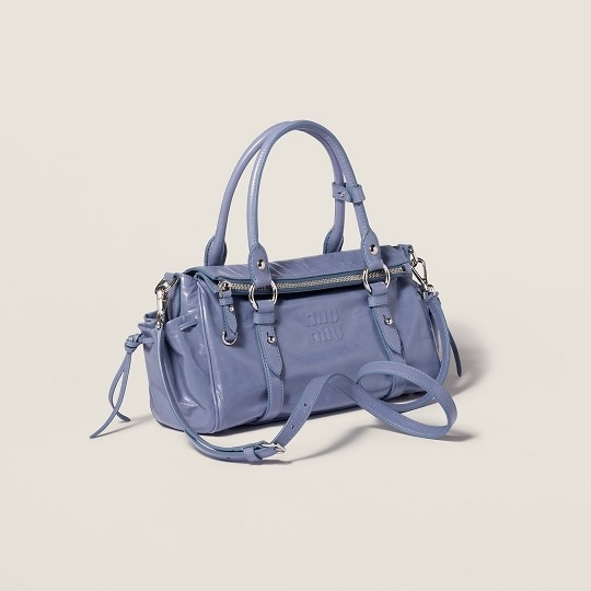 新季 Vitello Lux 手袋采用富有光泽感的漆面小牛皮制作而成,包型灵感来自2000年代复古廓形,采用经典手拎包廓形搭配顶部拉链和翻折设计,纵贯包身的皮革饰带、金属圆环和铆钉为包包增添千禧年极繁主义美学风格,侧面抽绳绑带为包包增添优雅少女感,本季推出航空蓝、紫檀色2种新配色。