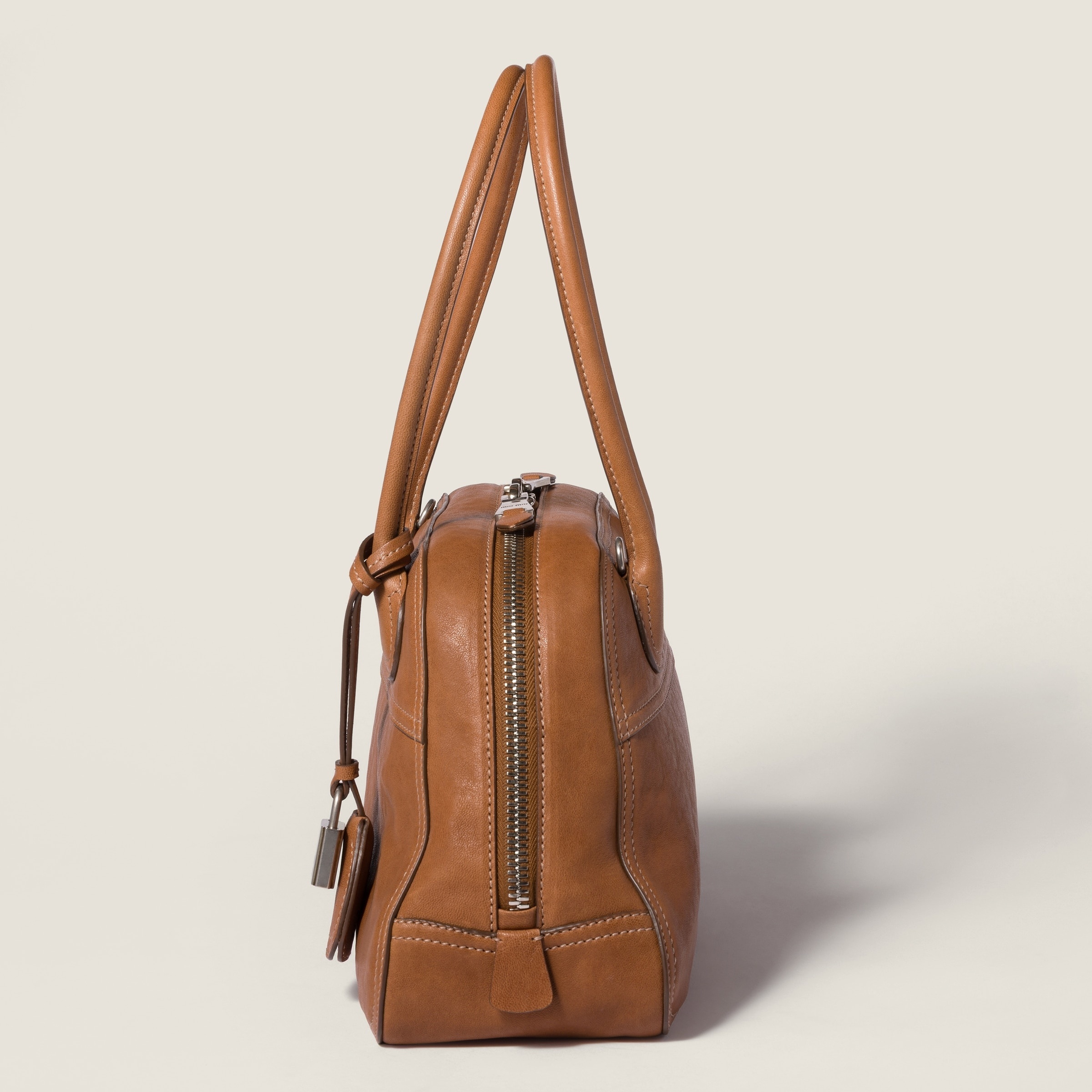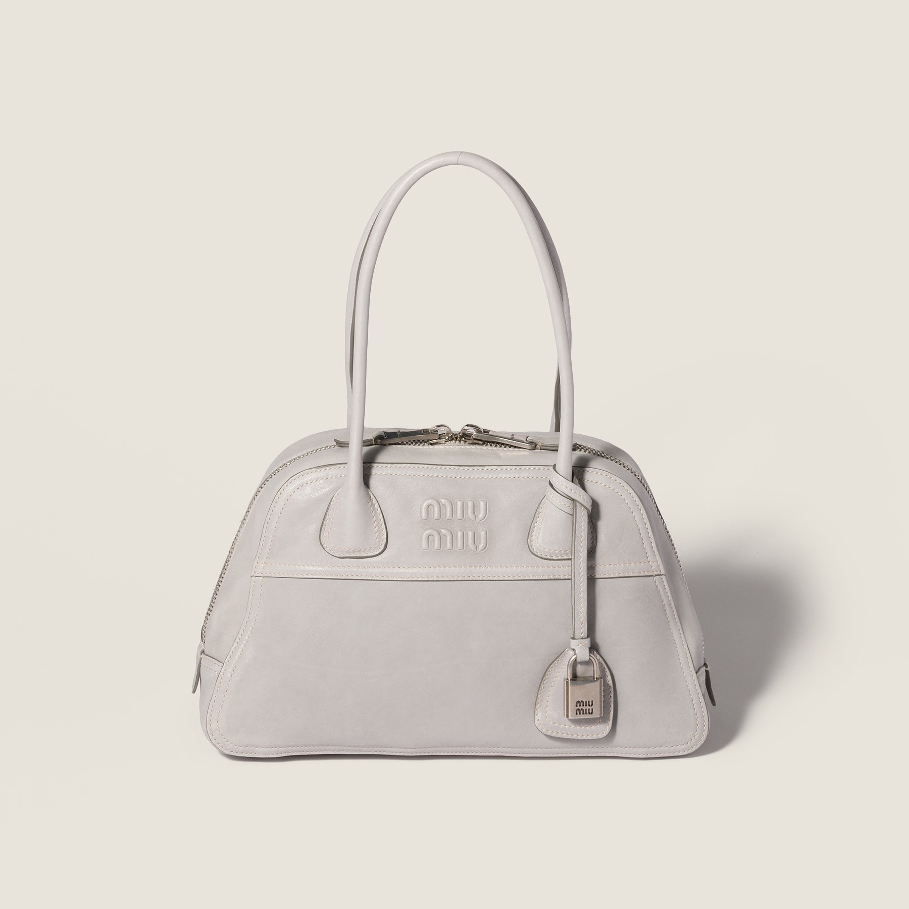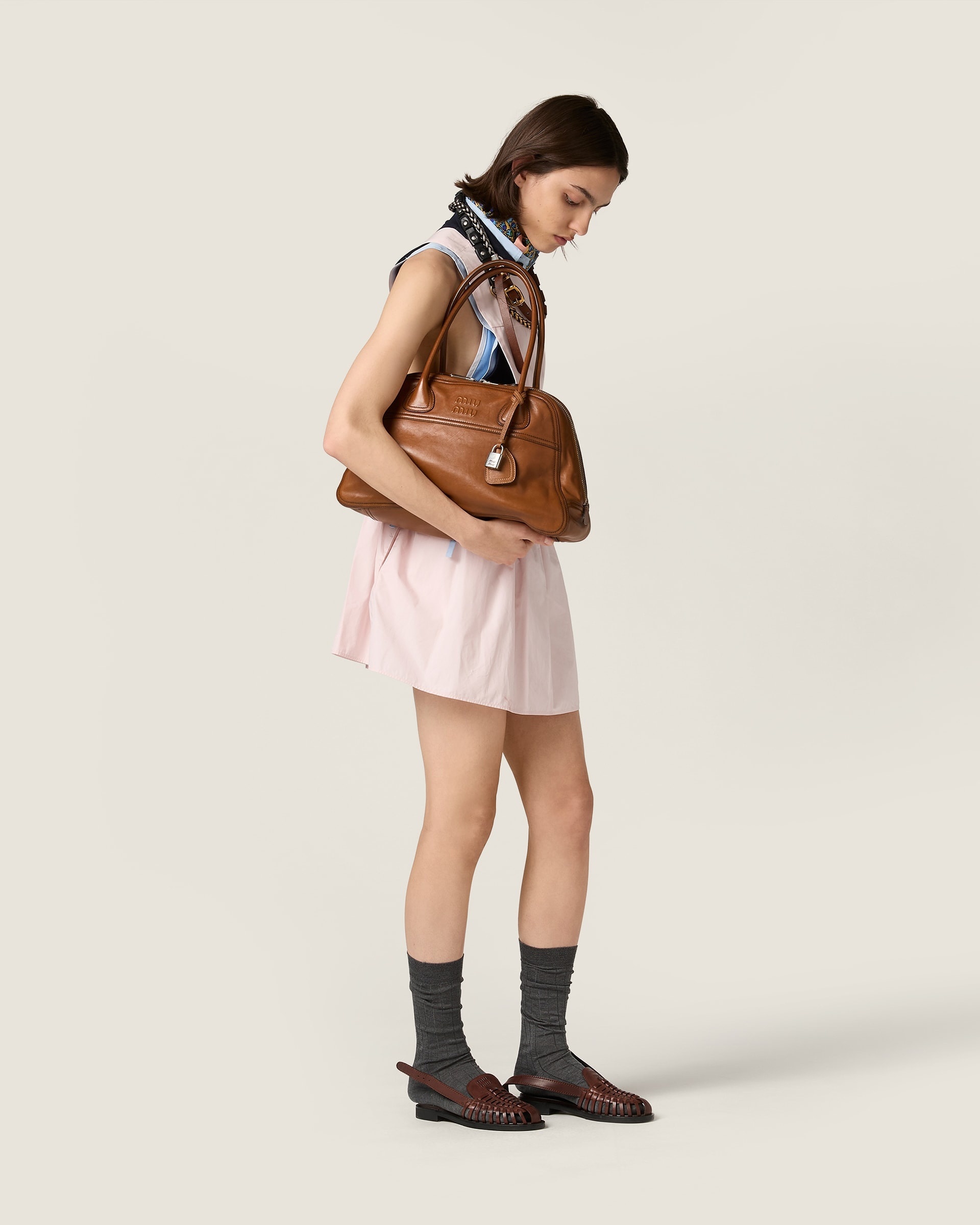 新季 Vitello Lux 手袋采用富有光泽感的漆面小牛皮制作而成,包型灵感来自2000年代复古廓形,采用经典手拎包廓形搭配顶部拉链和翻折设计,纵贯包身的皮革饰带、金属圆环和铆钉为包包增添千禧年极繁主义美学风格,侧面抽绳绑带为包包增添优雅少女感,本季推出航空蓝、紫檀色2种新配色。