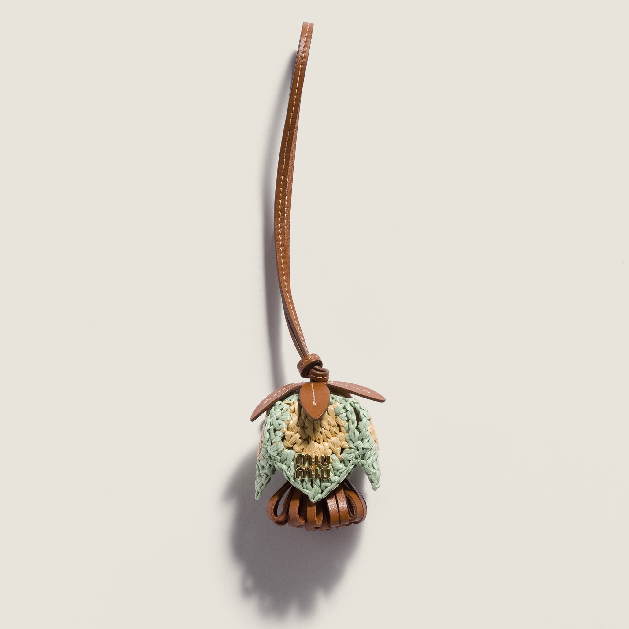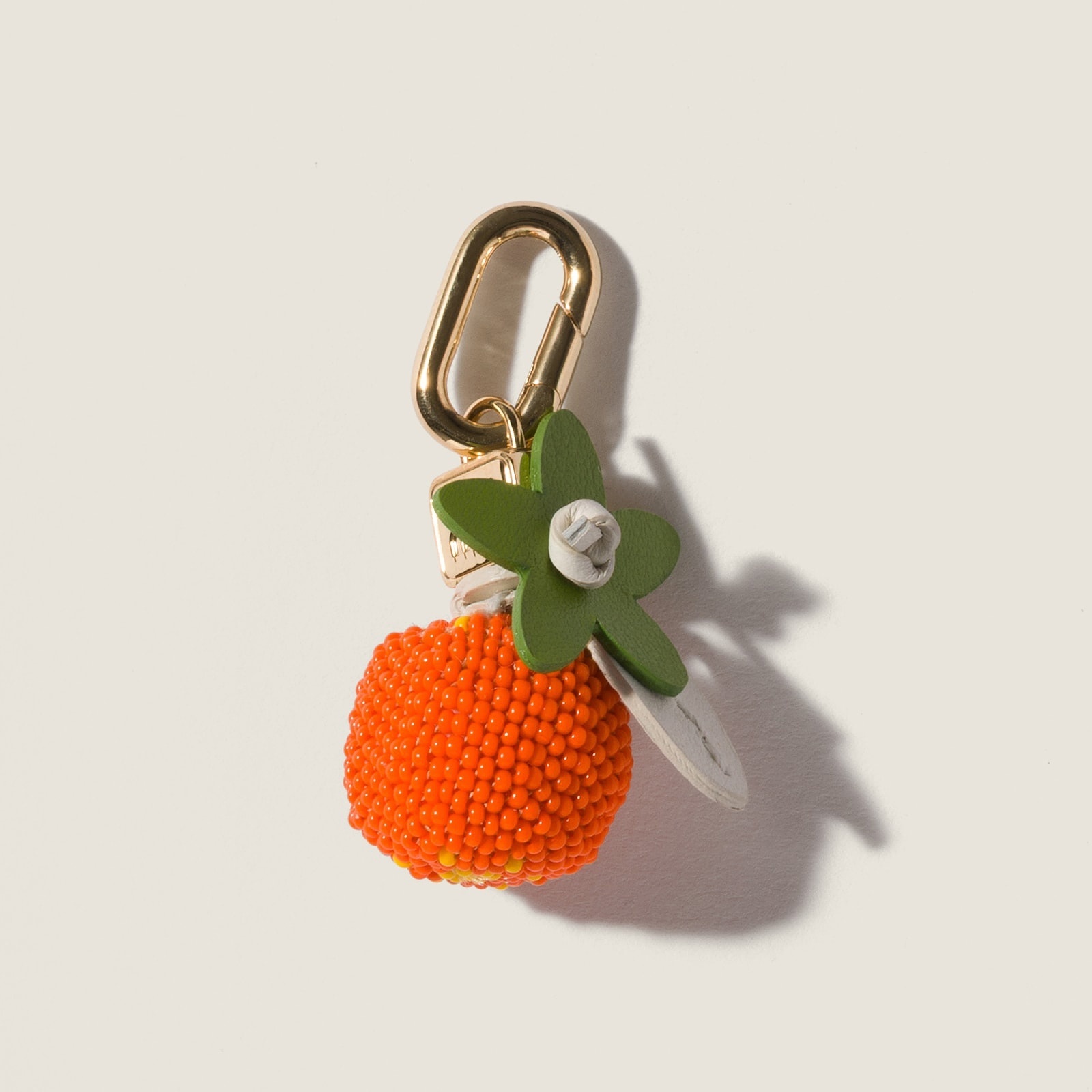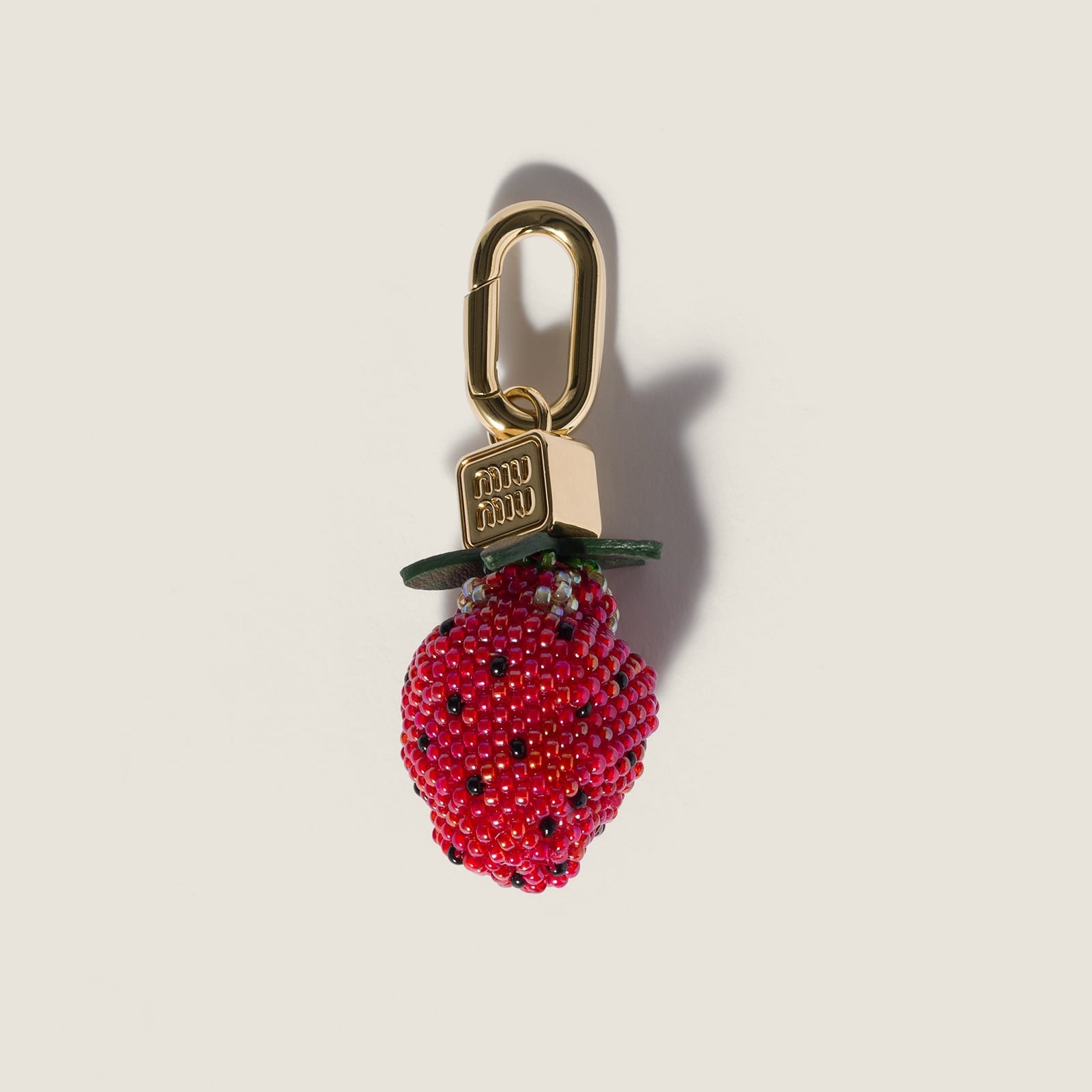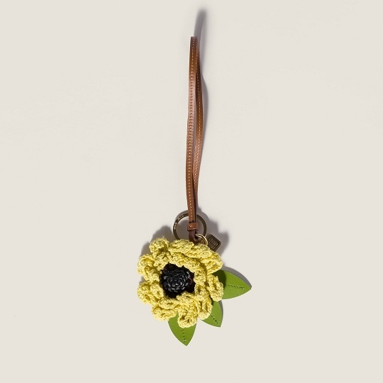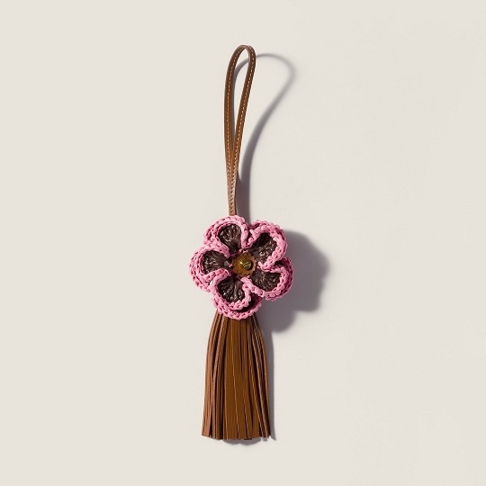 新款包包和鞋履挂饰以充满自然意趣的花卉、水果、瓢虫、折扇、草帽为主要设计元素,采用色彩缤纷的串珠、棉线或拉菲草钩针编织而成,点缀皮革流苏、金属字母徽标等装饰细节,可可爱爱少女心满满。