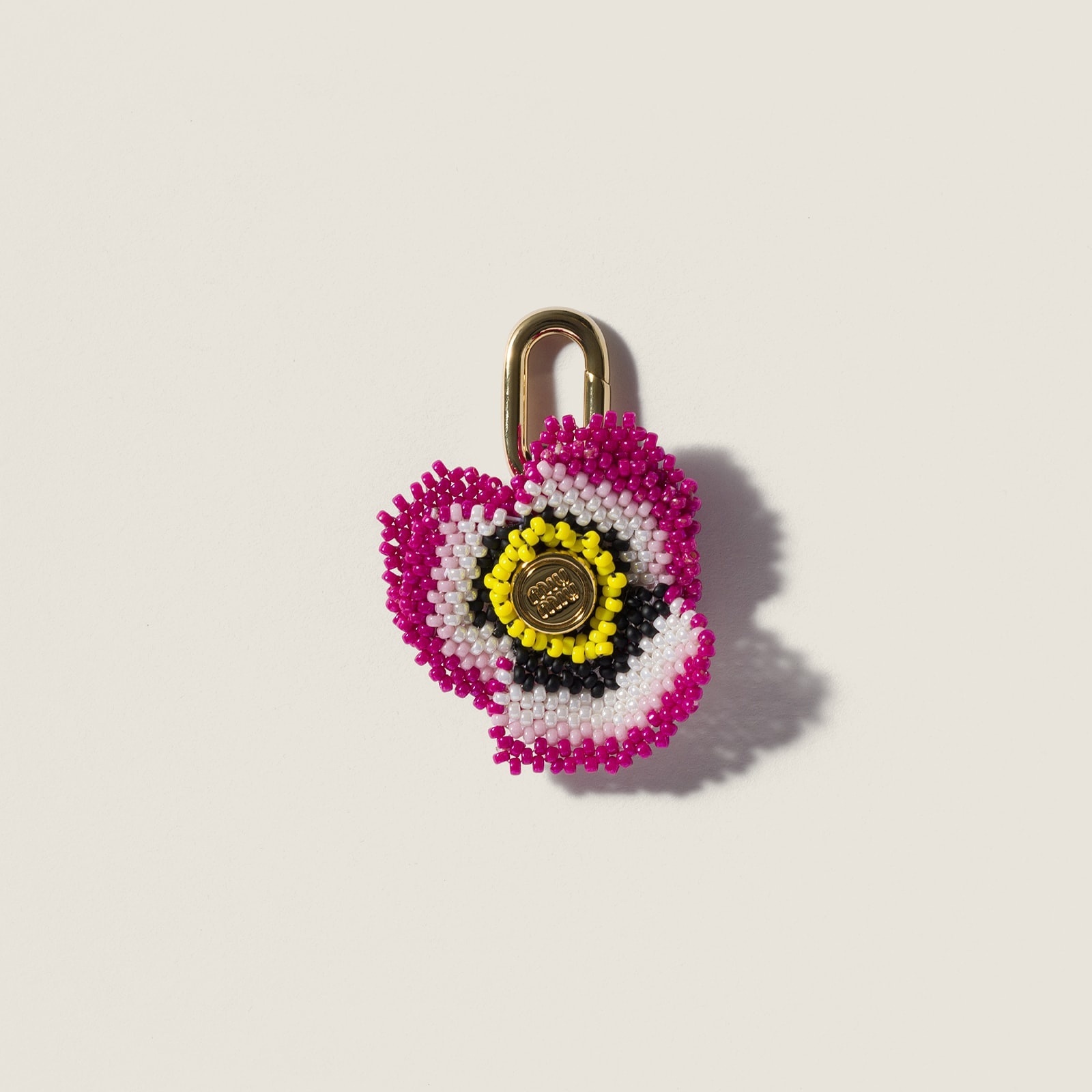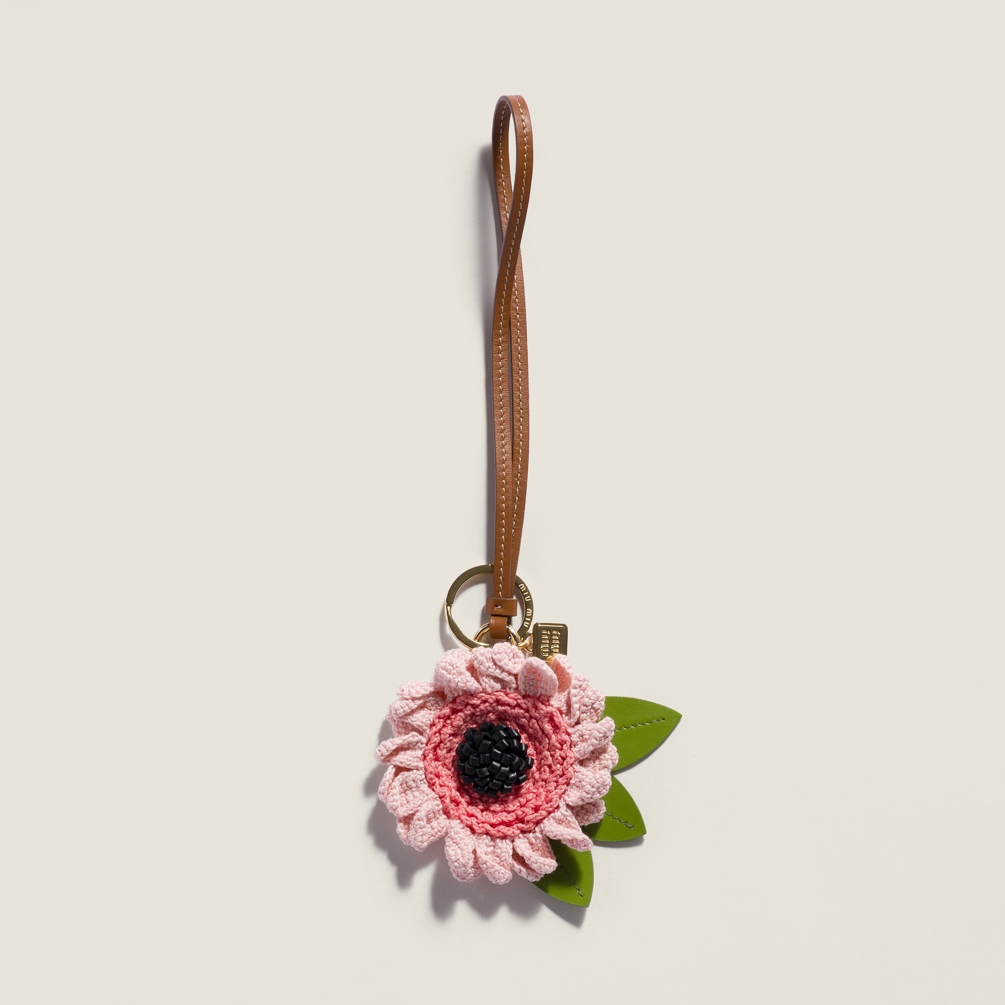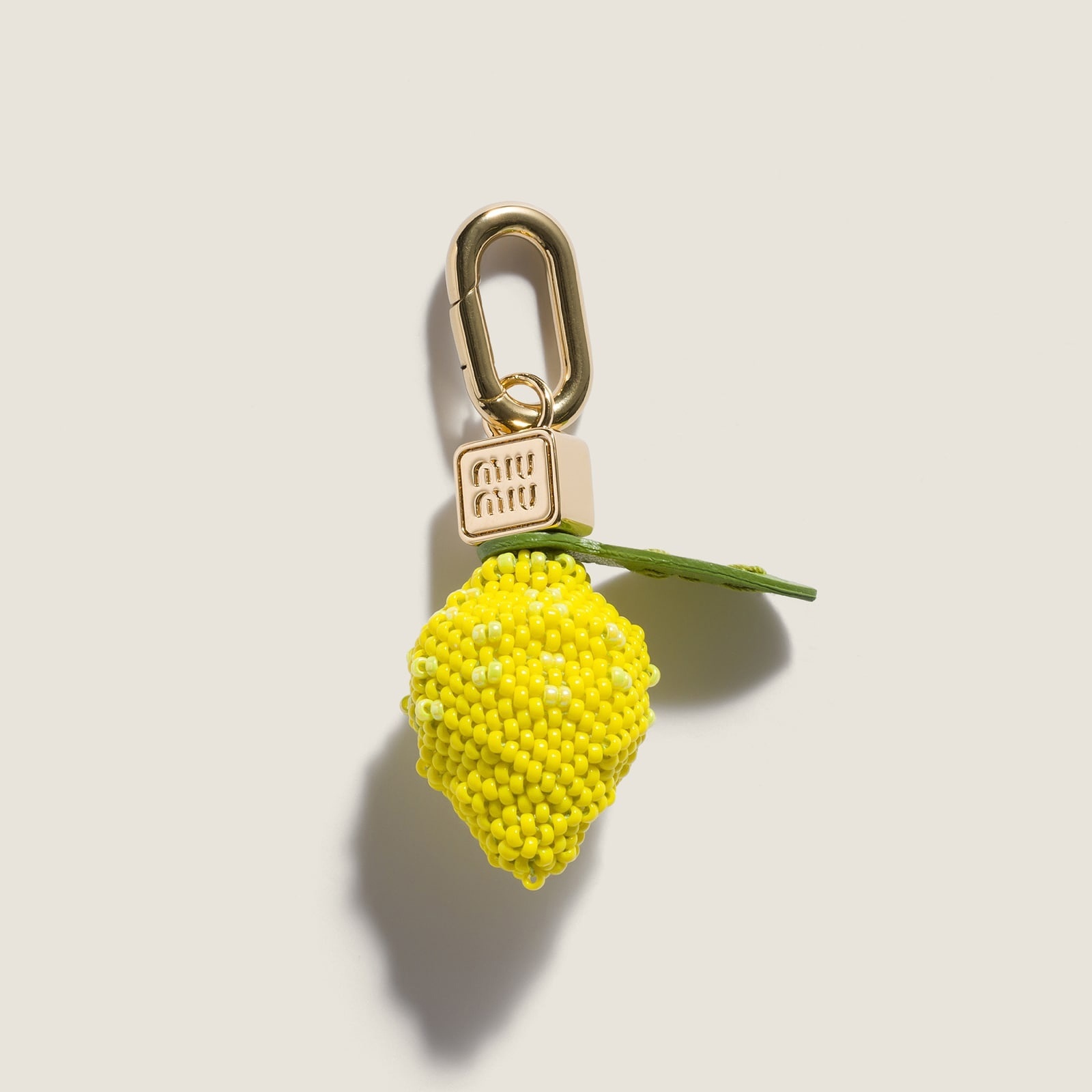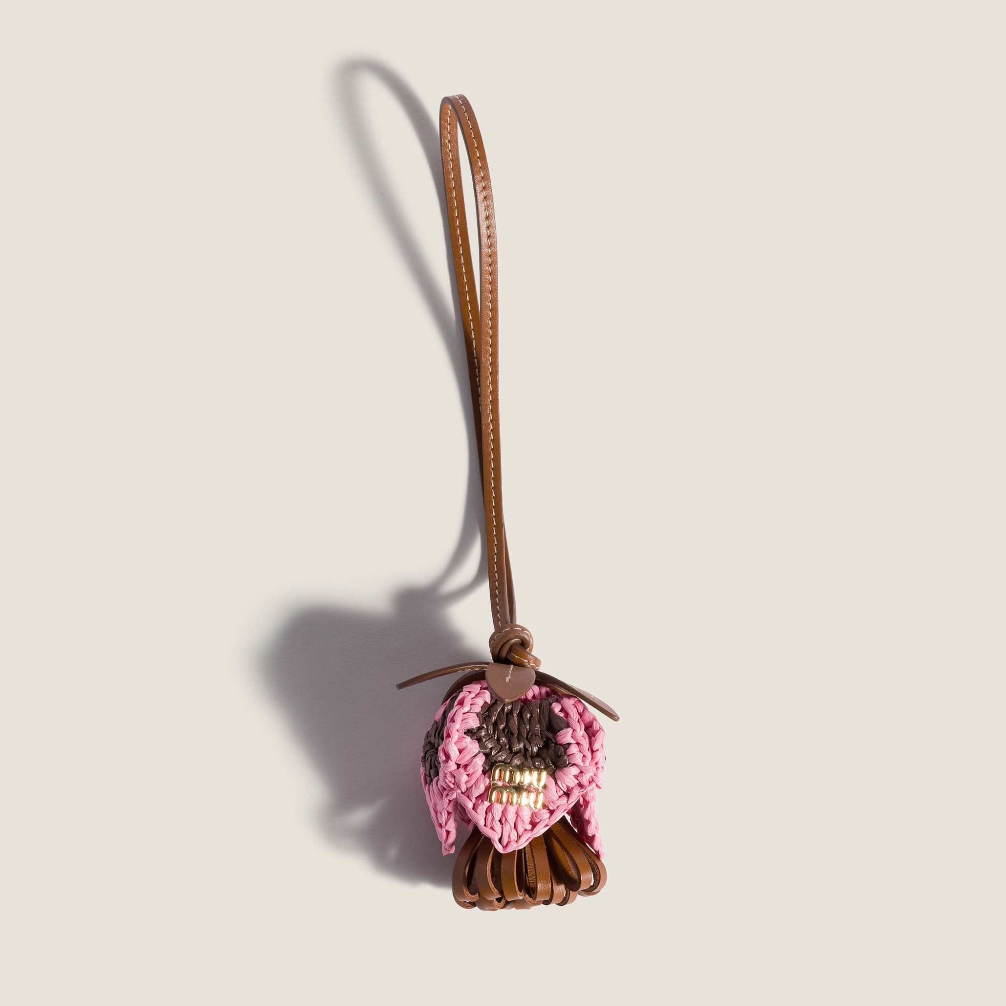 新款包包和鞋履挂饰以充满自然意趣的花卉、水果、瓢虫、折扇、草帽为主要设计元素,采用色彩缤纷的串珠、棉线或拉菲草钩针编织而成,点缀皮革流苏、金属字母徽标等装饰细节,可可爱爱少女心满满。