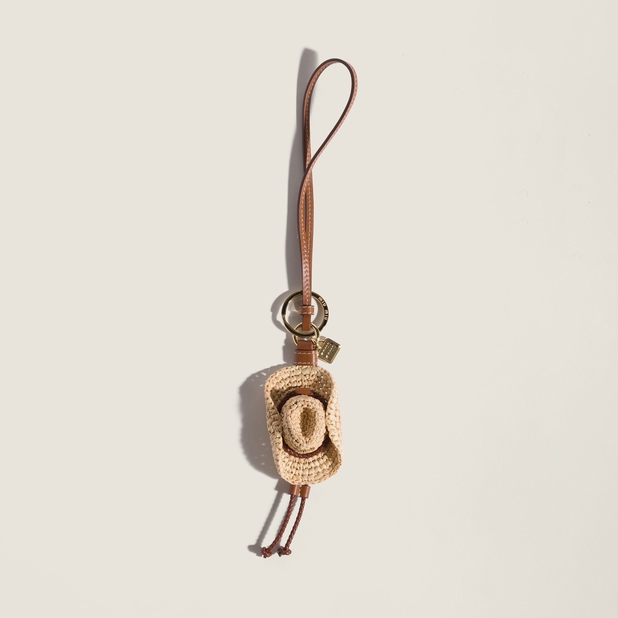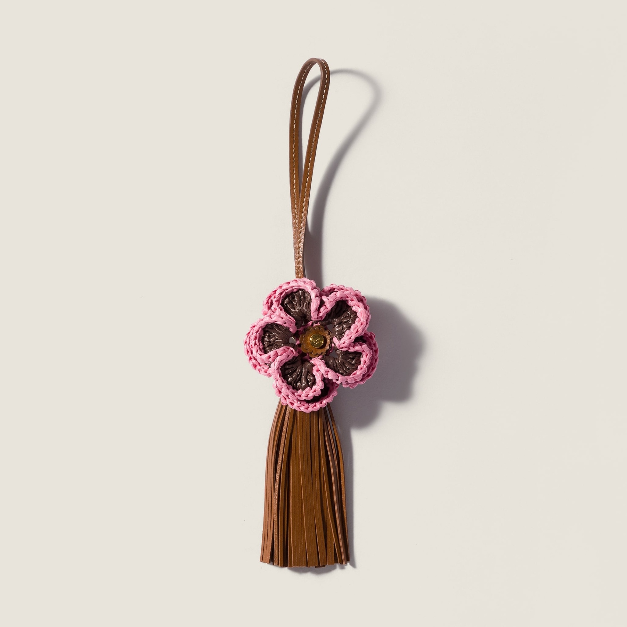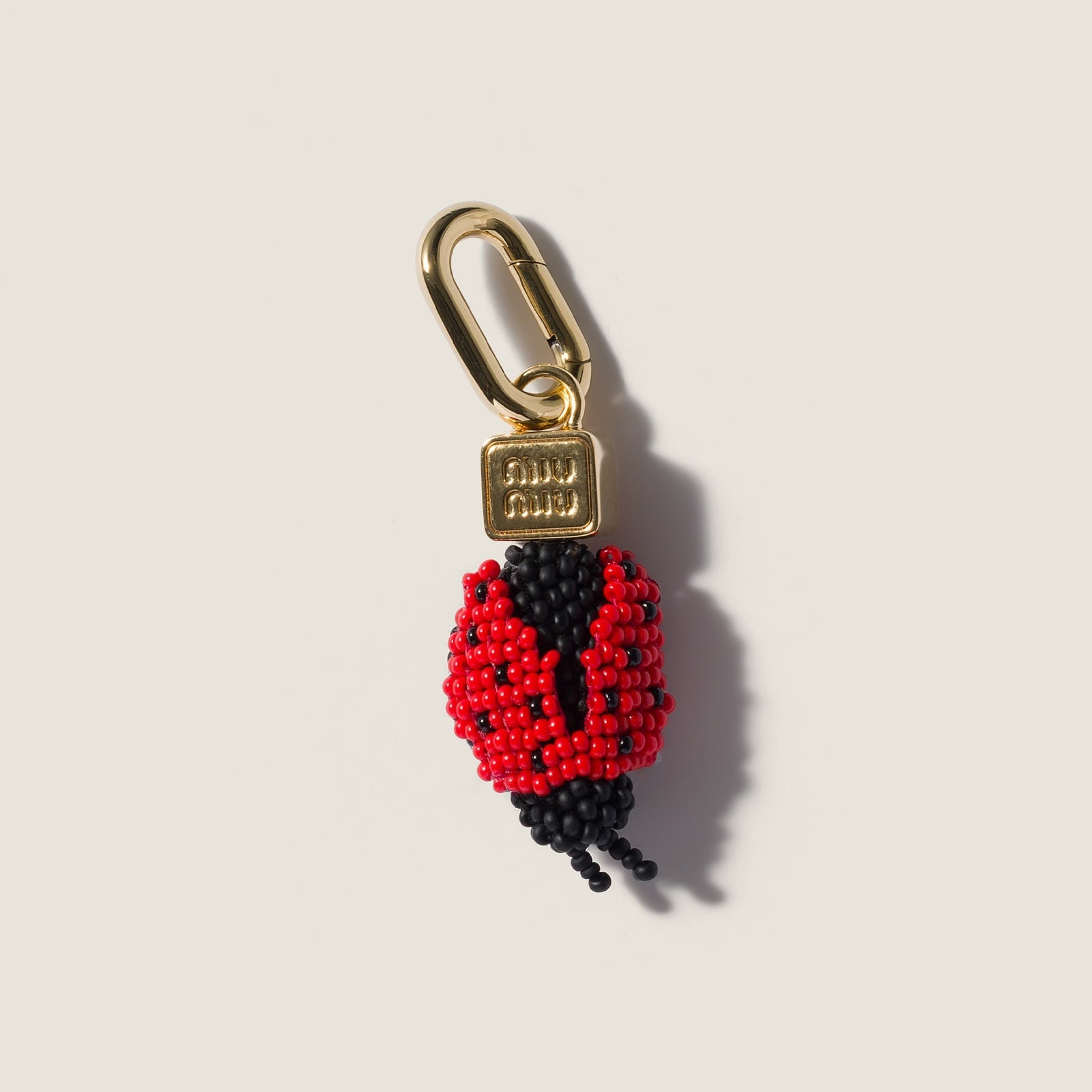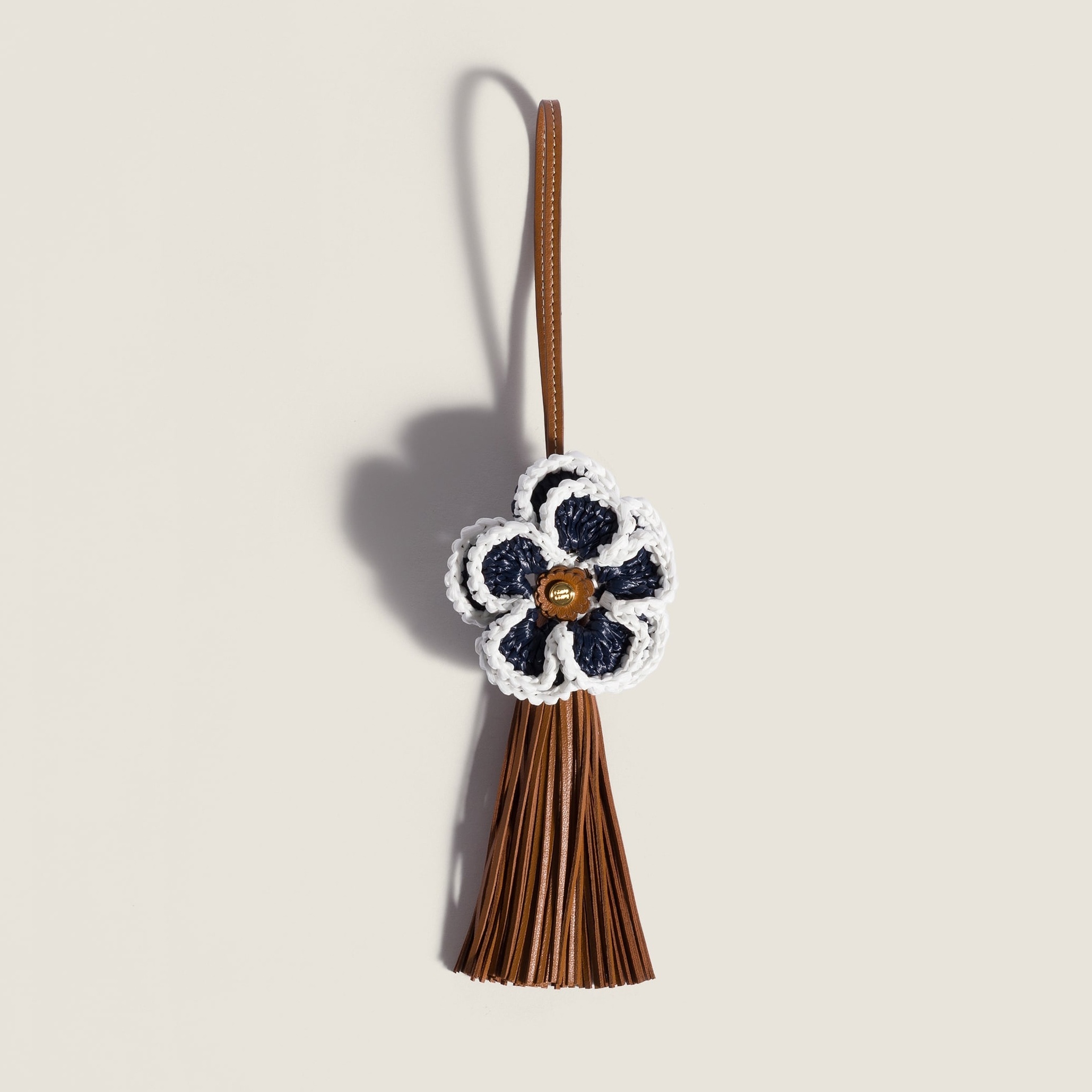 新款包包和鞋履挂饰以充满自然意趣的花卉、水果、瓢虫、折扇、草帽为主要设计元素,采用色彩缤纷的串珠、棉线或拉菲草钩针编织而成,点缀皮革流苏、金属字母徽标等装饰细节,可可爱爱少女心满满。