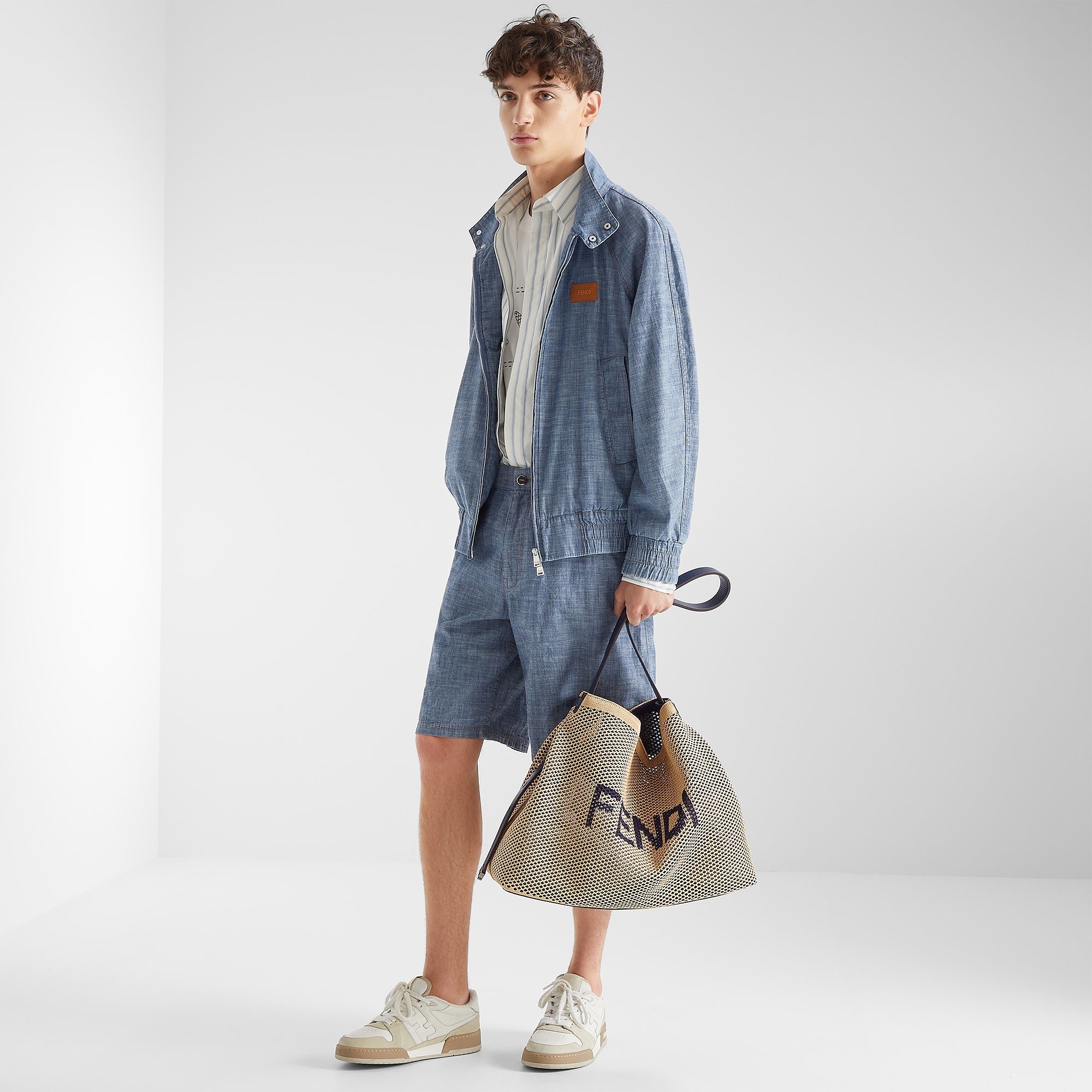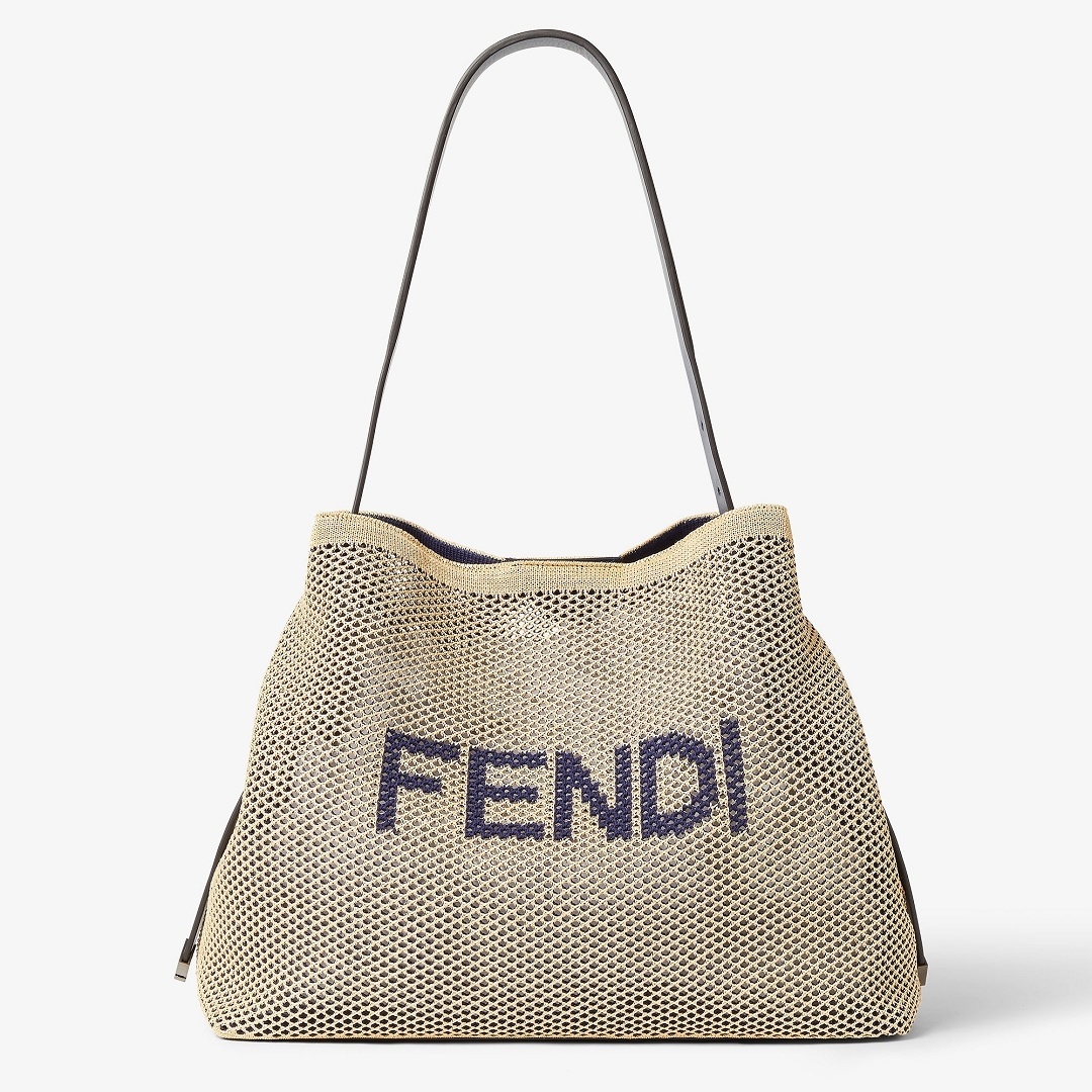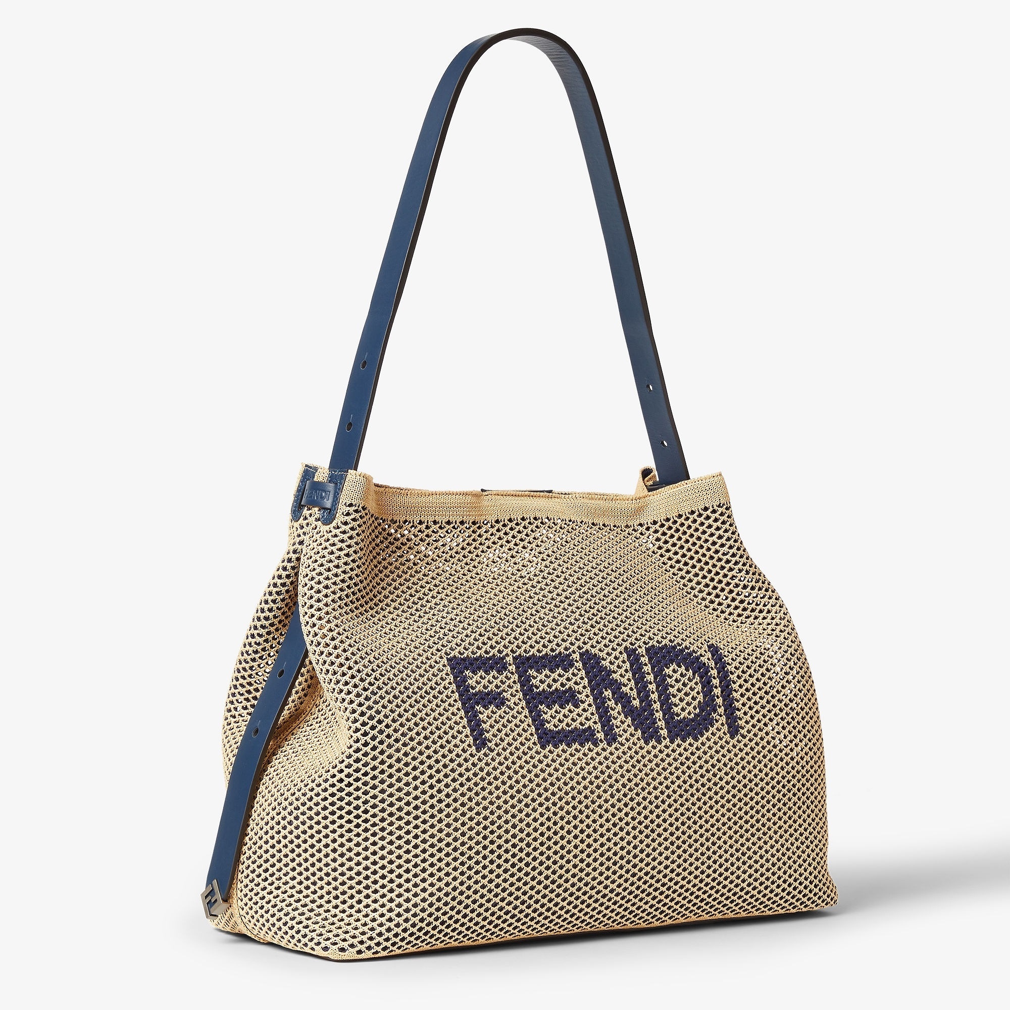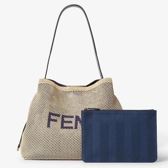 新款 Hobo Soft 大号手袋采用拉菲草编织材质构筑柔软镂空包身,内外为自然色和深蓝色撞色组合,无衬里设计营造出轻盈透气感,内部配有深蓝色小牛皮底座和可拆卸的 Peguin 条纹帆布拉链小袋,肩带尾部饰有银色 FF 金属贴花,可调节长短实现手拿、肩背或者斜挎背法。
