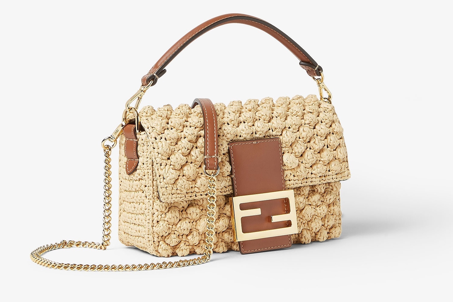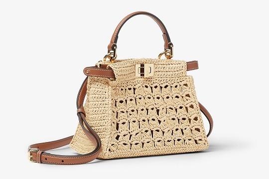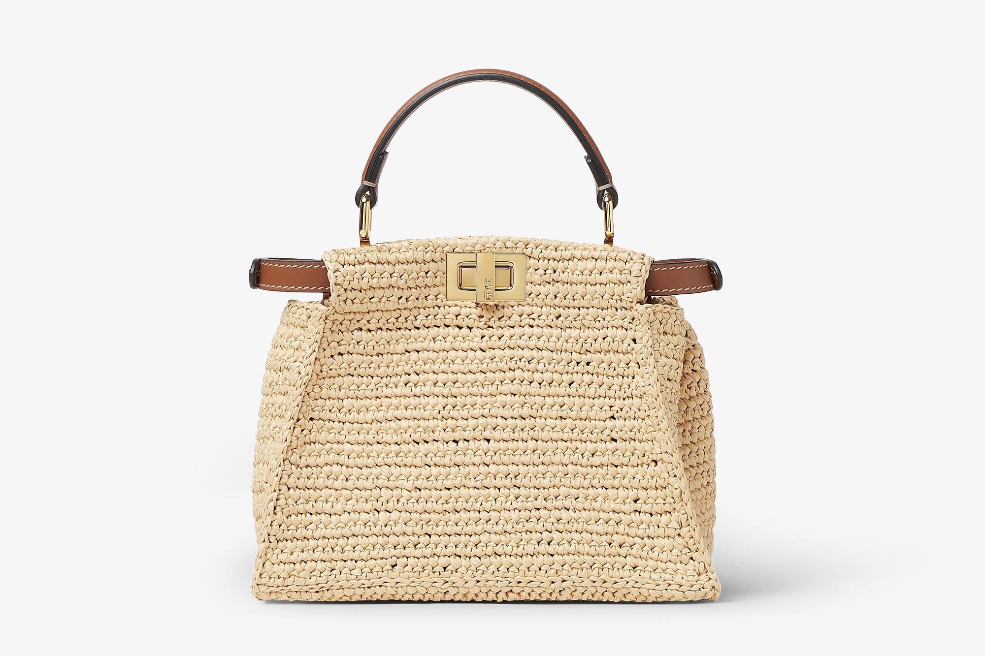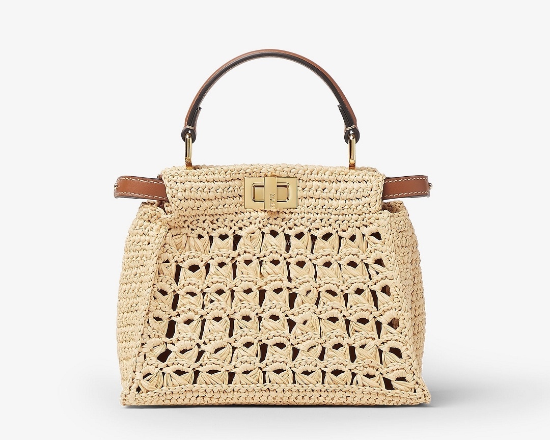 Peekaboo 小号手袋以原色拉菲草材质构筑轻盈透气的镂空图案,无里衬设计与镂空编织纹理巧妙契合,营造出轻松夏日氛围。FENDI Way 手袋内外分别采用拉菲草材质和马鞍棕色皮革,把精致感和假日感合二为一。