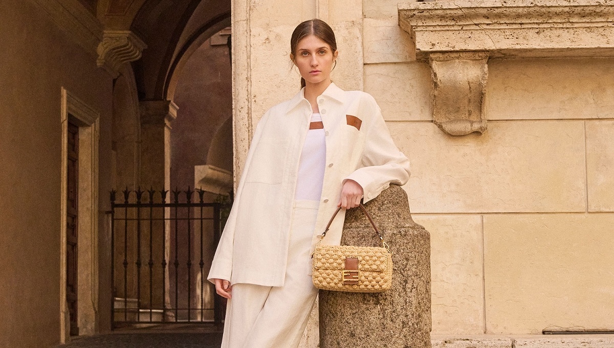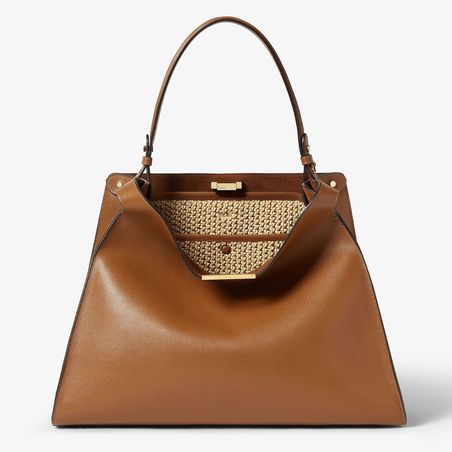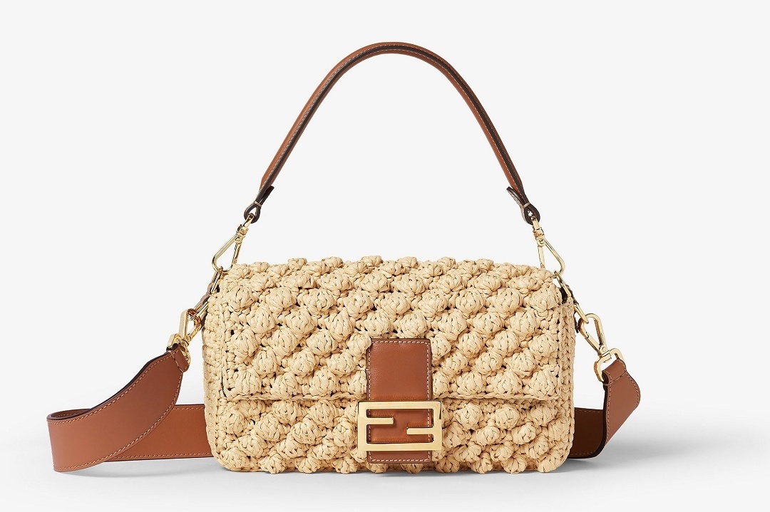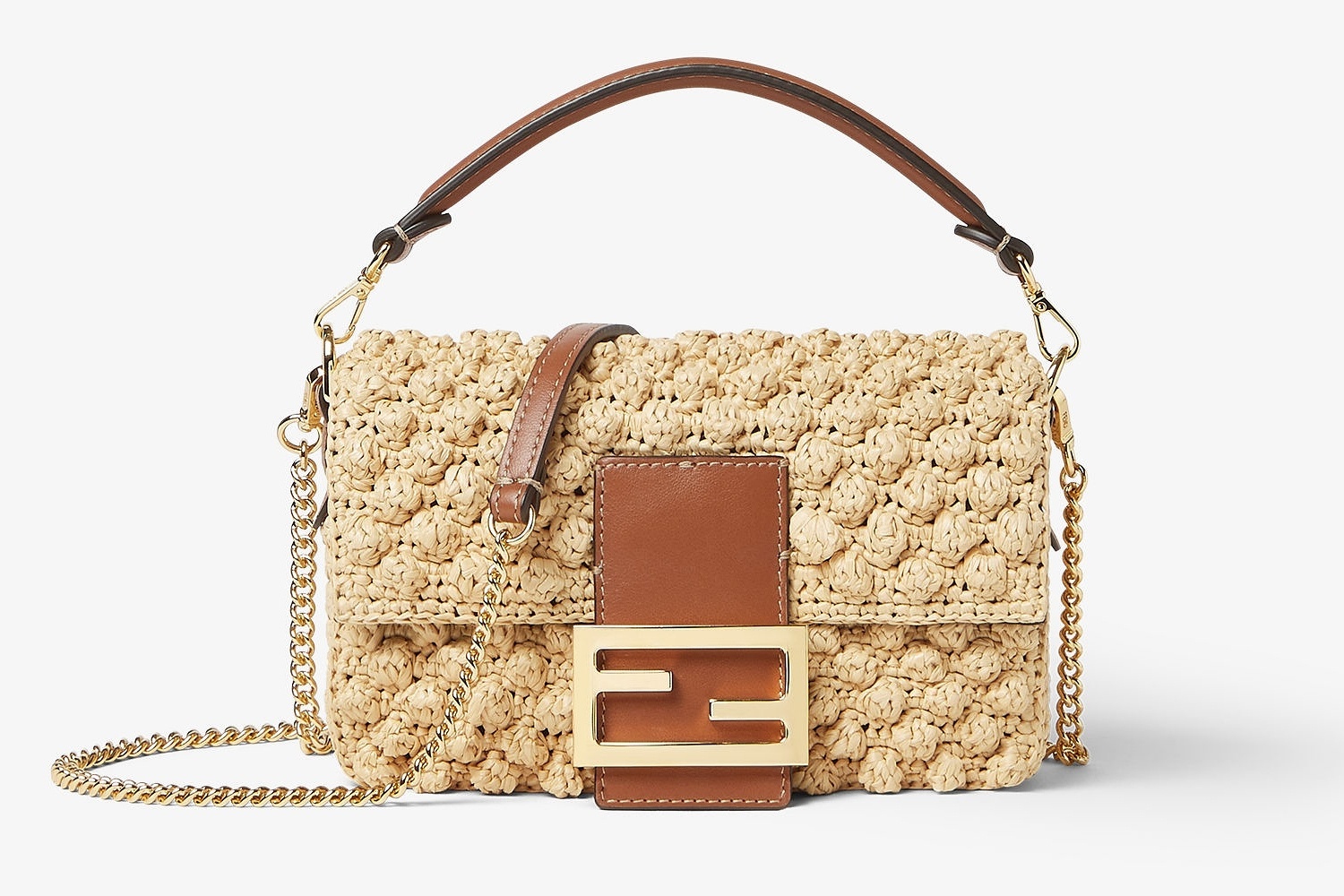 Peekaboo 小号手袋以原色拉菲草材质构筑轻盈透气的镂空图案,无里衬设计与镂空编织纹理巧妙契合,营造出轻松夏日氛围。FENDI Way 手袋内外分别采用拉菲草材质和马鞍棕色皮革,把精致感和假日感合二为一。