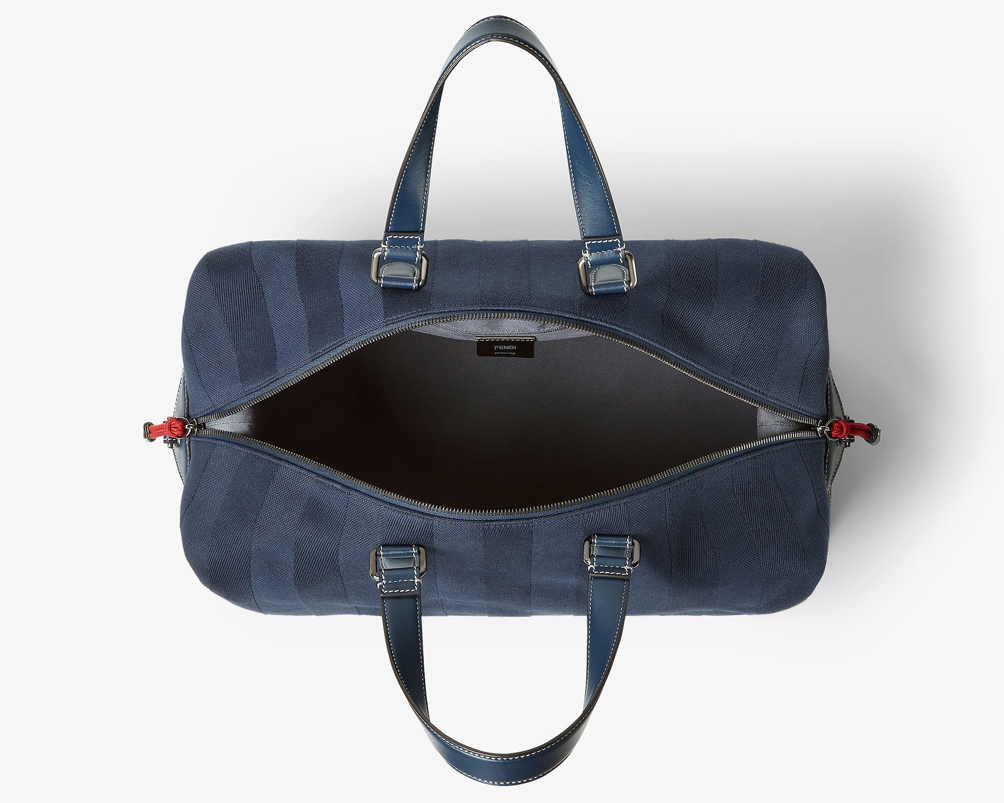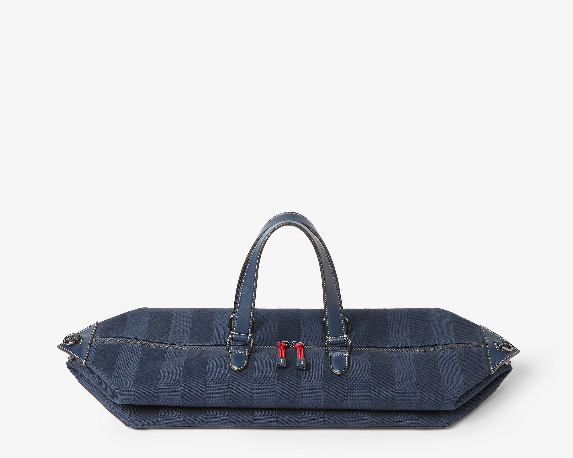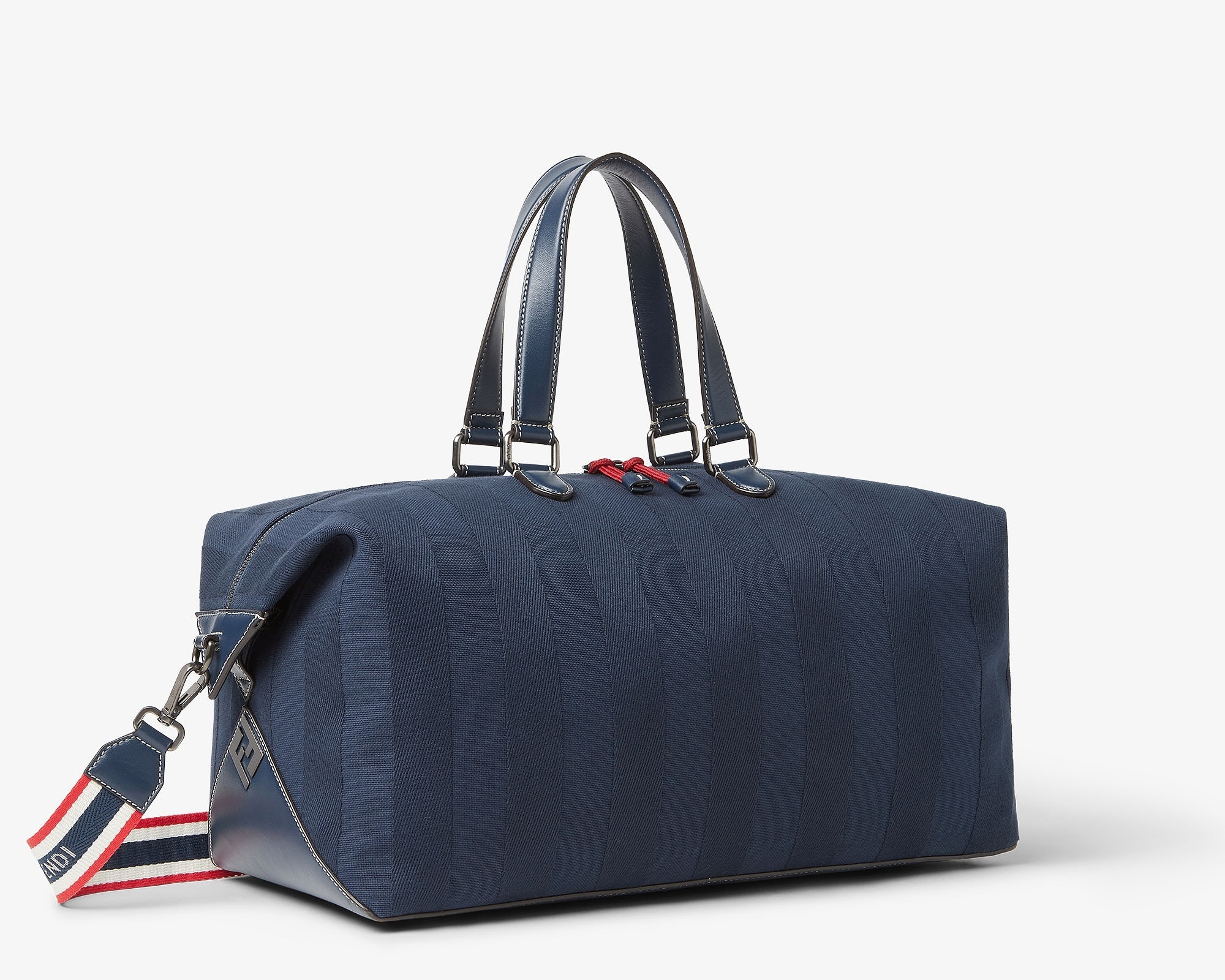 男士系列依然以轻便实用的 Lui 行李袋为主角,采用海军蓝色 Pequin 条纹帆布搭配同色系皮革饰边,金属 FF 贴花作为点睛。包包采用双滑扣长拉链开合设计,侧面按扣可调整形状和容量,便于旅途收纳携带。内部为高科技布料里衬并配有防水尼龙防尘袋,带弹簧钩的皮革肩带可将悬挂在滚轮行李箱上。同系列还推出一只 Lui 化妆包,侧面皮革提手和红色拉链头增添精致感细节。