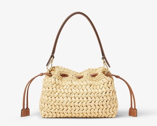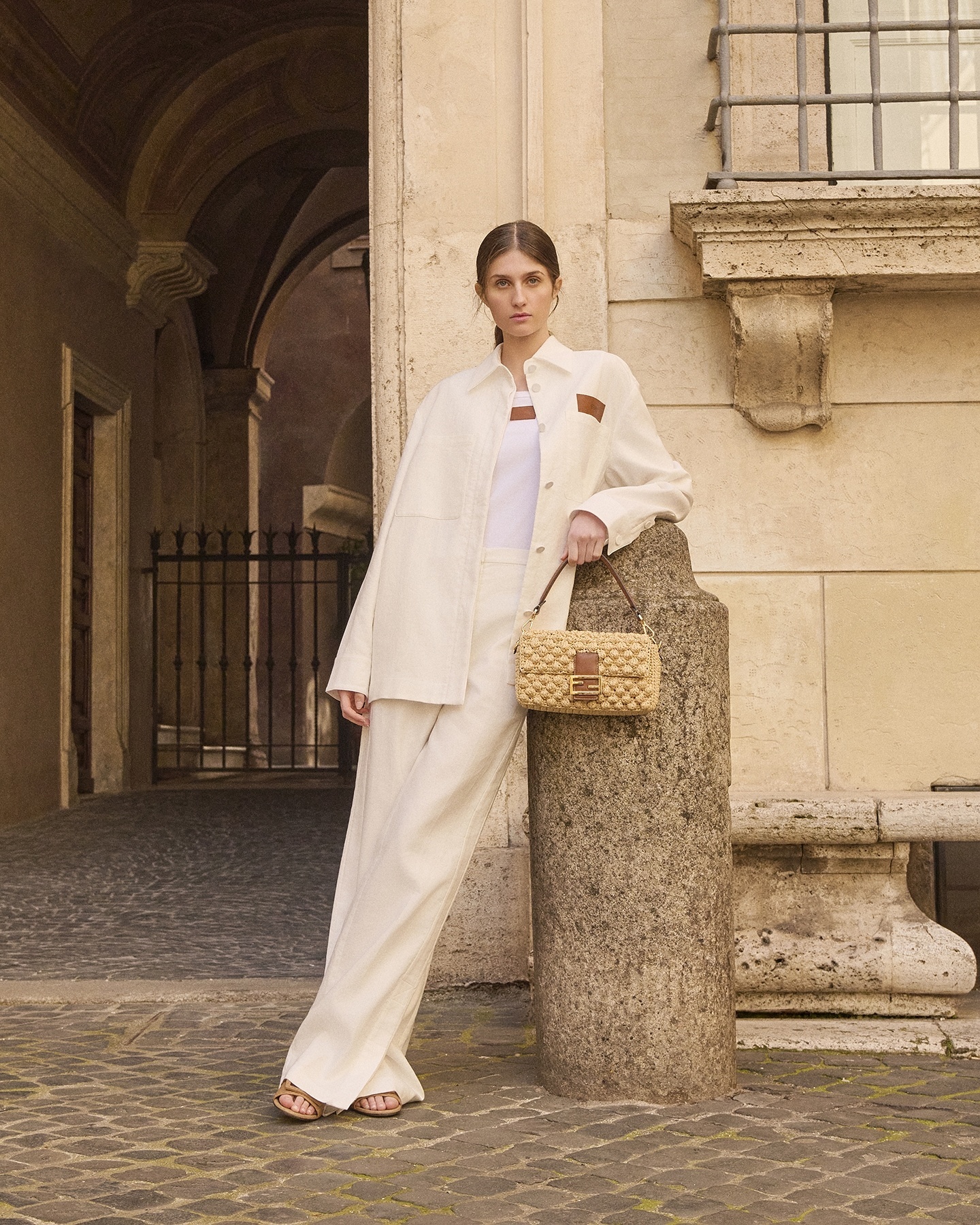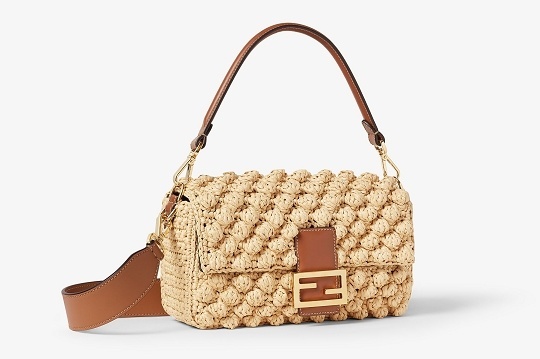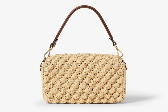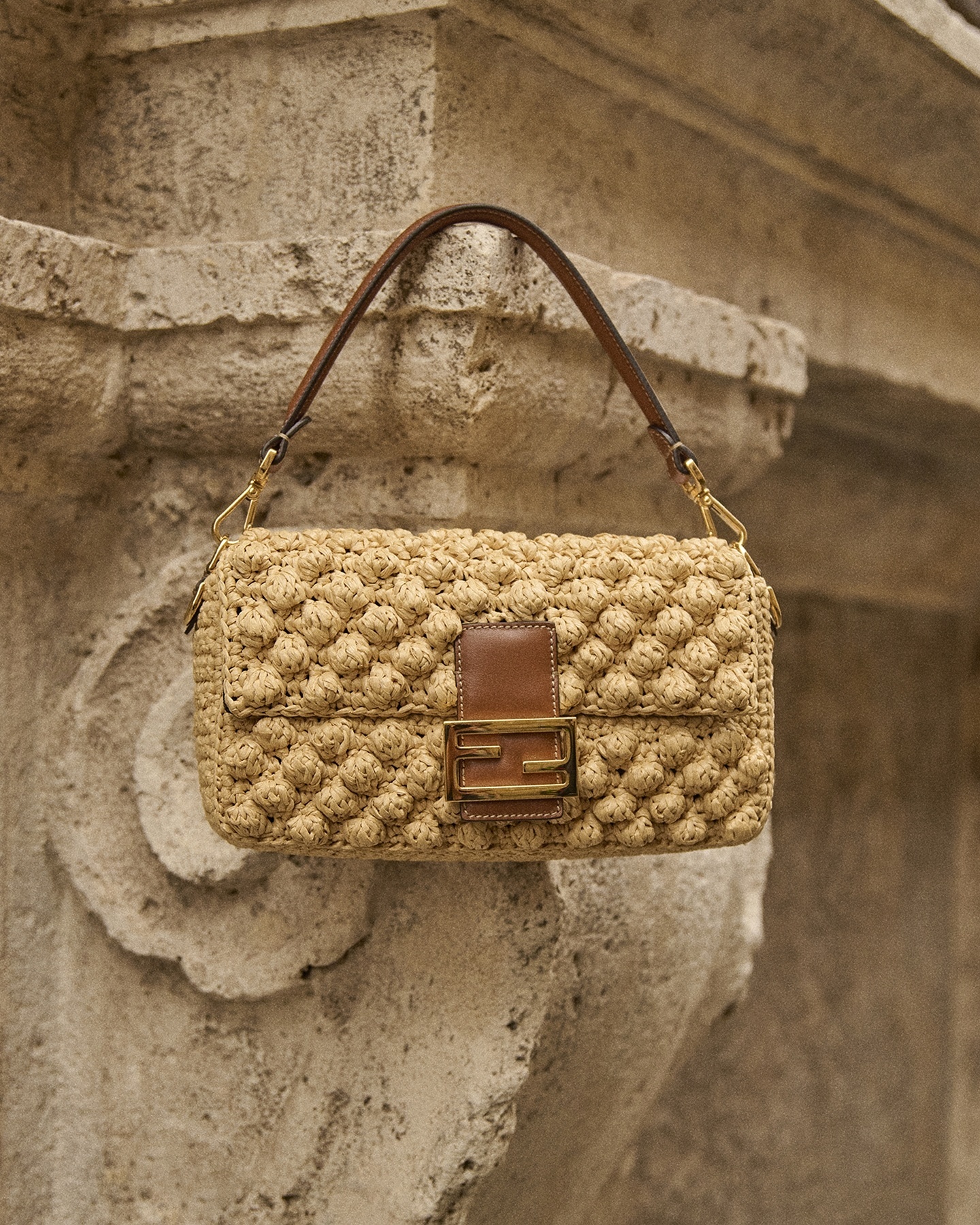 新季 Baguette 手袋采用天然色拉菲草编制包身搭配马鞍棕色皮革细节,通过钩针编织工艺在包包上呈现立体菠萝纹装饰,推出中号、迷你和 Nano 吊饰包3种尺寸。Mamma Baguette 手袋采用手工钩织技法打造人字纹编织结构,呈现轻盈又饱满的质感。