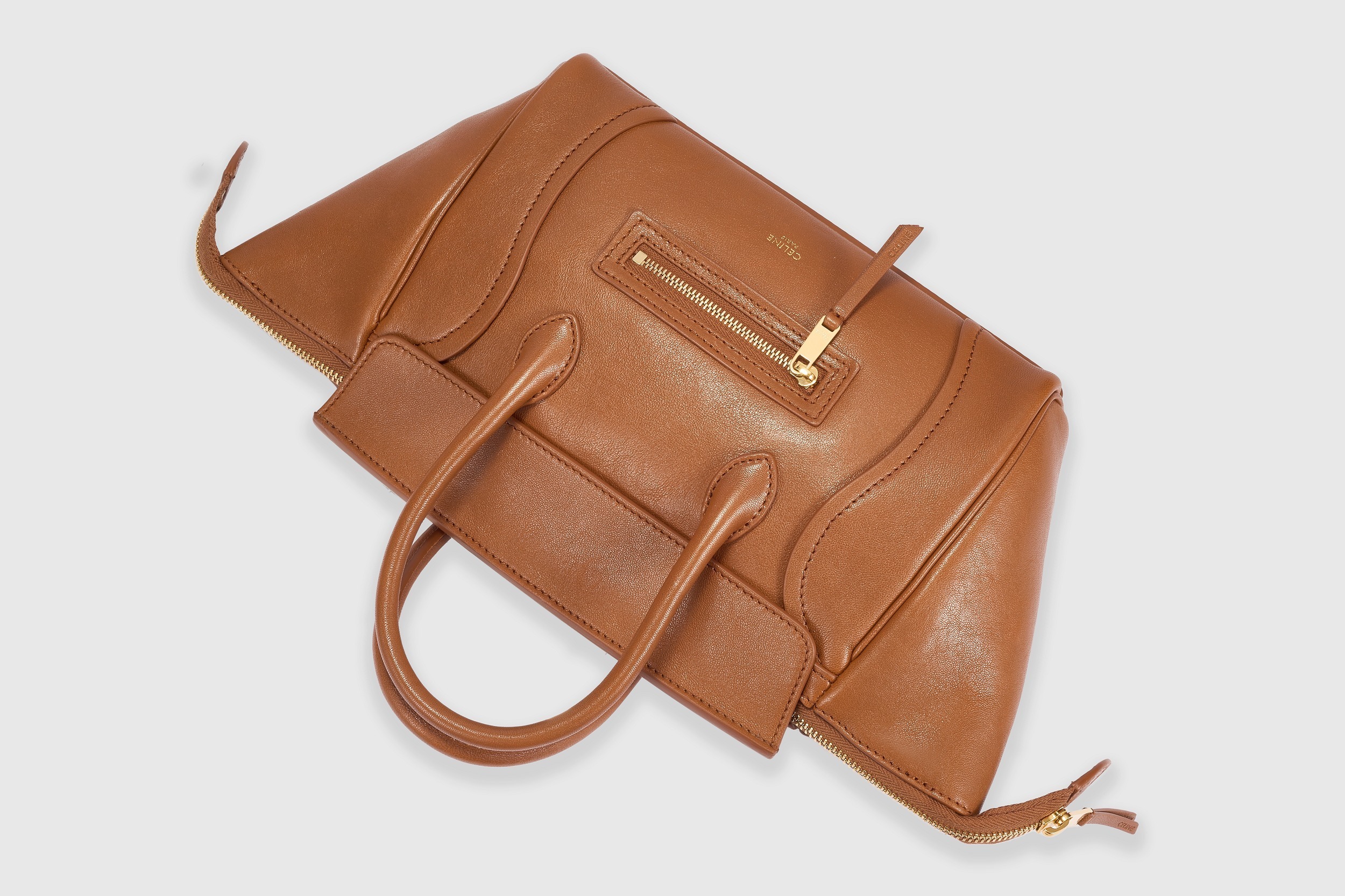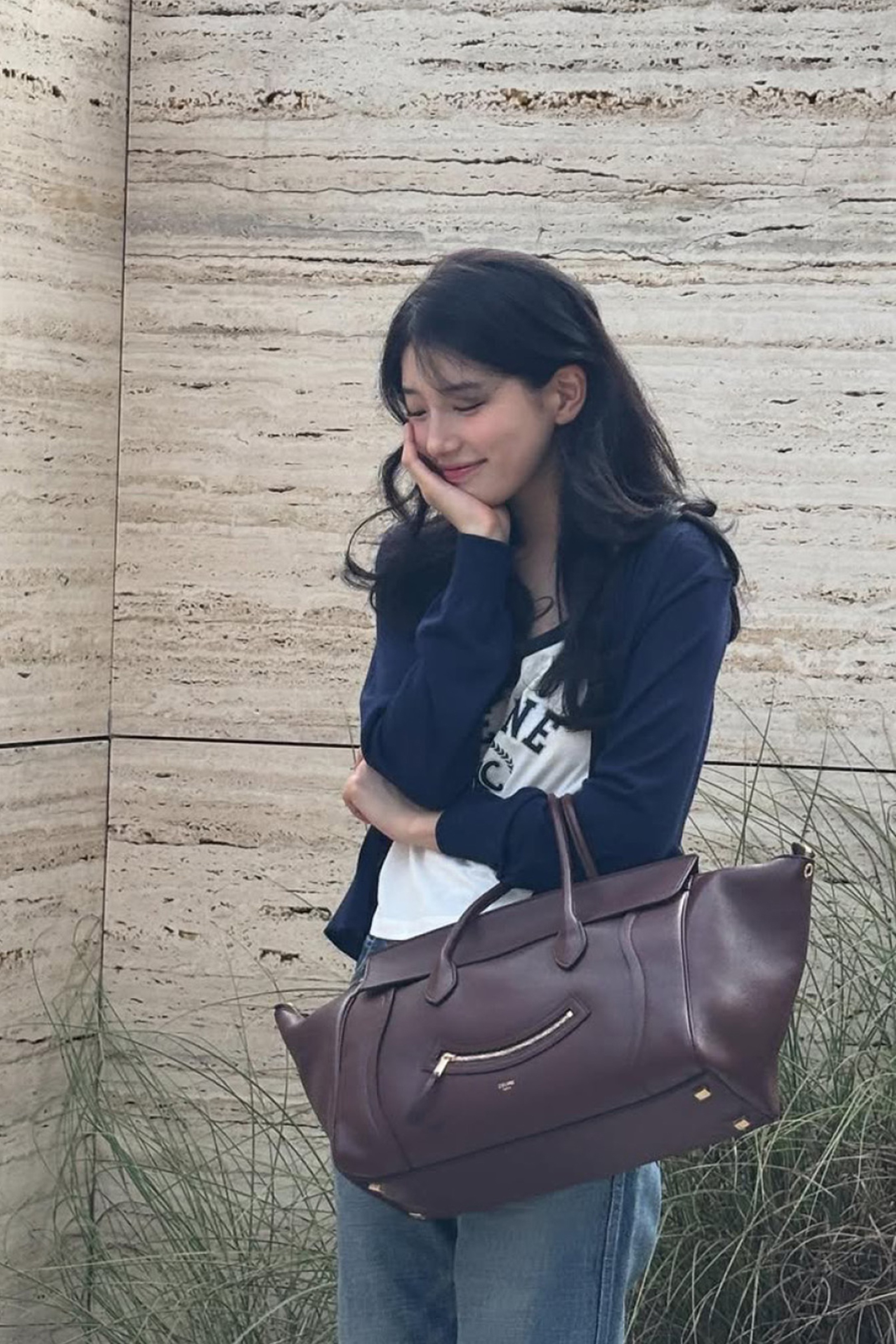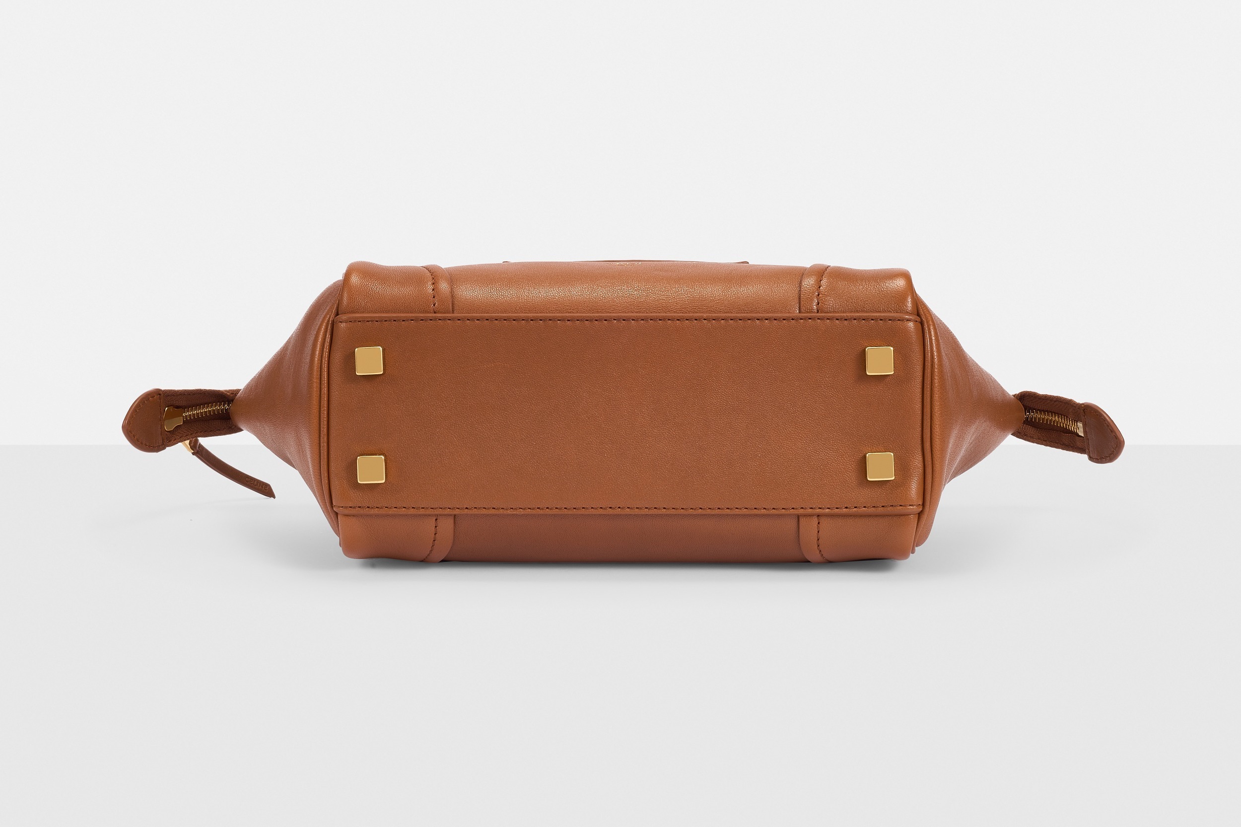 New Luggage 手袋和原版笑脸包的最大区别在于其加宽的 East-West 廓形轻质皮革的运用,包包变得柔软且具有空气感,从凌厉干练的 OL 风格切换到了松弛随性的法式情调,好像随时可以在路边的咖啡馆落座小憩,然后从包包里掏出一本书慢悠悠地放空。