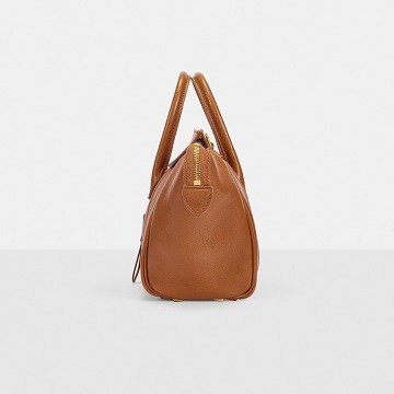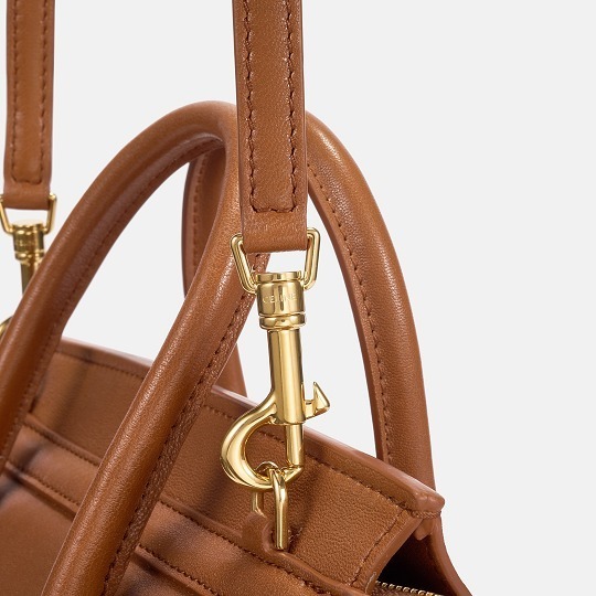 包包顶部采用拉链开合+短翻盖设计,就像是给笑脸剪了个眉上刘海,有点可爱又提升了安全指数。浅棕褐色皮革和金色五金的组合经典且耐看,无论是日常通勤或者休闲装束都能适配。底部金属脚钉让包包可以稳稳地直立放置,也能保护包底不被磨损。