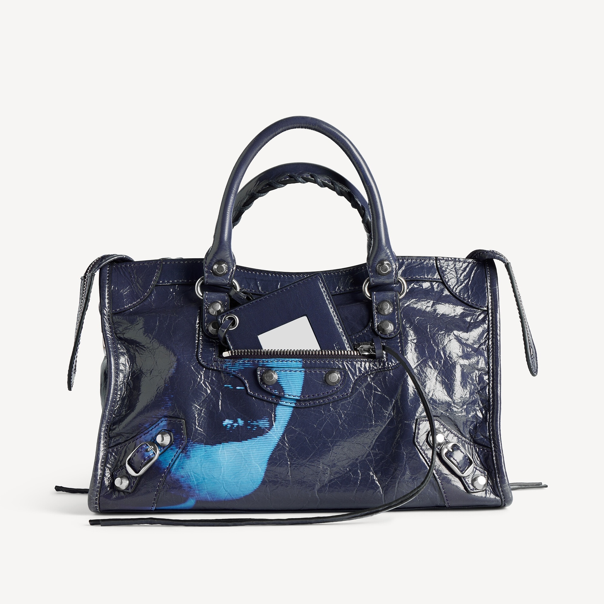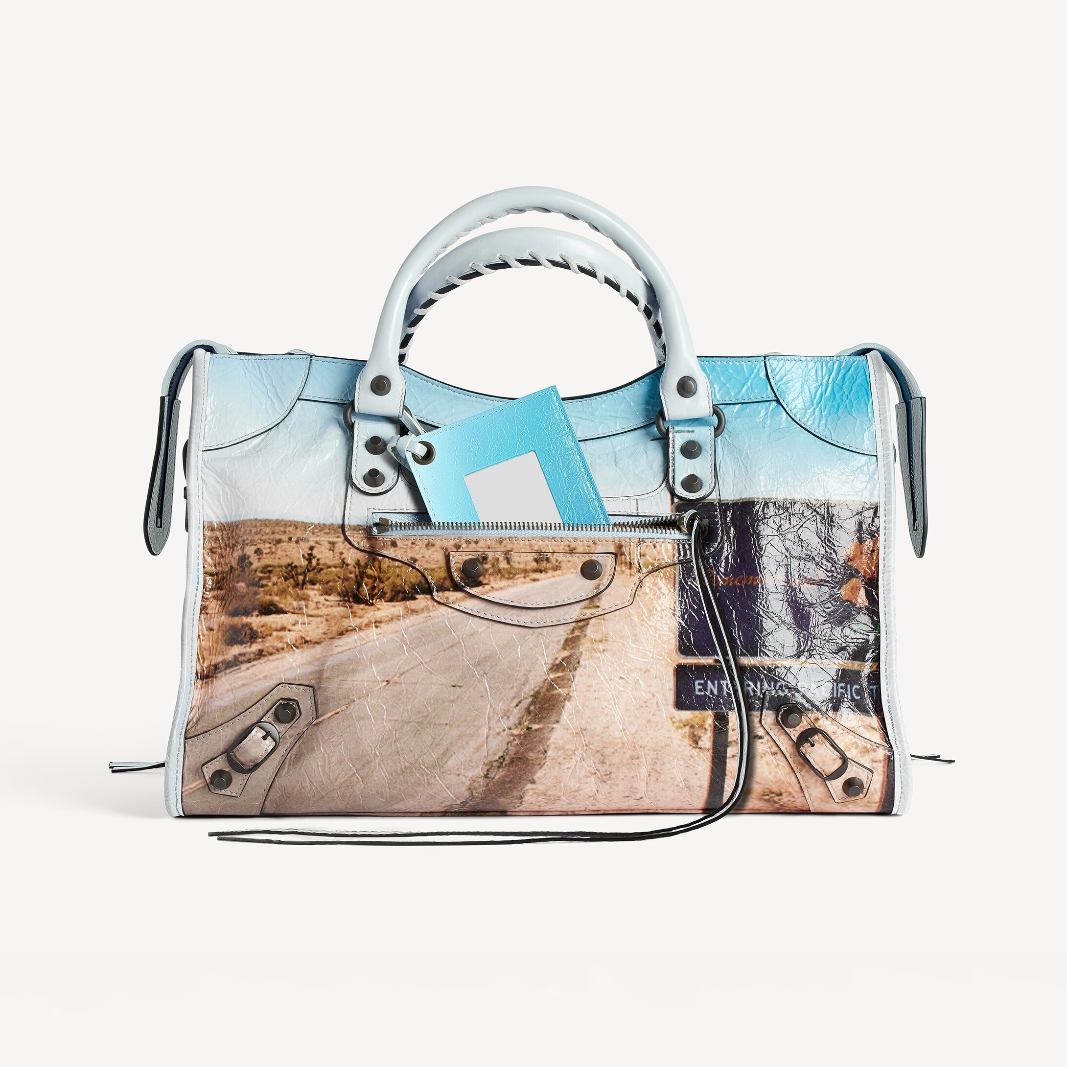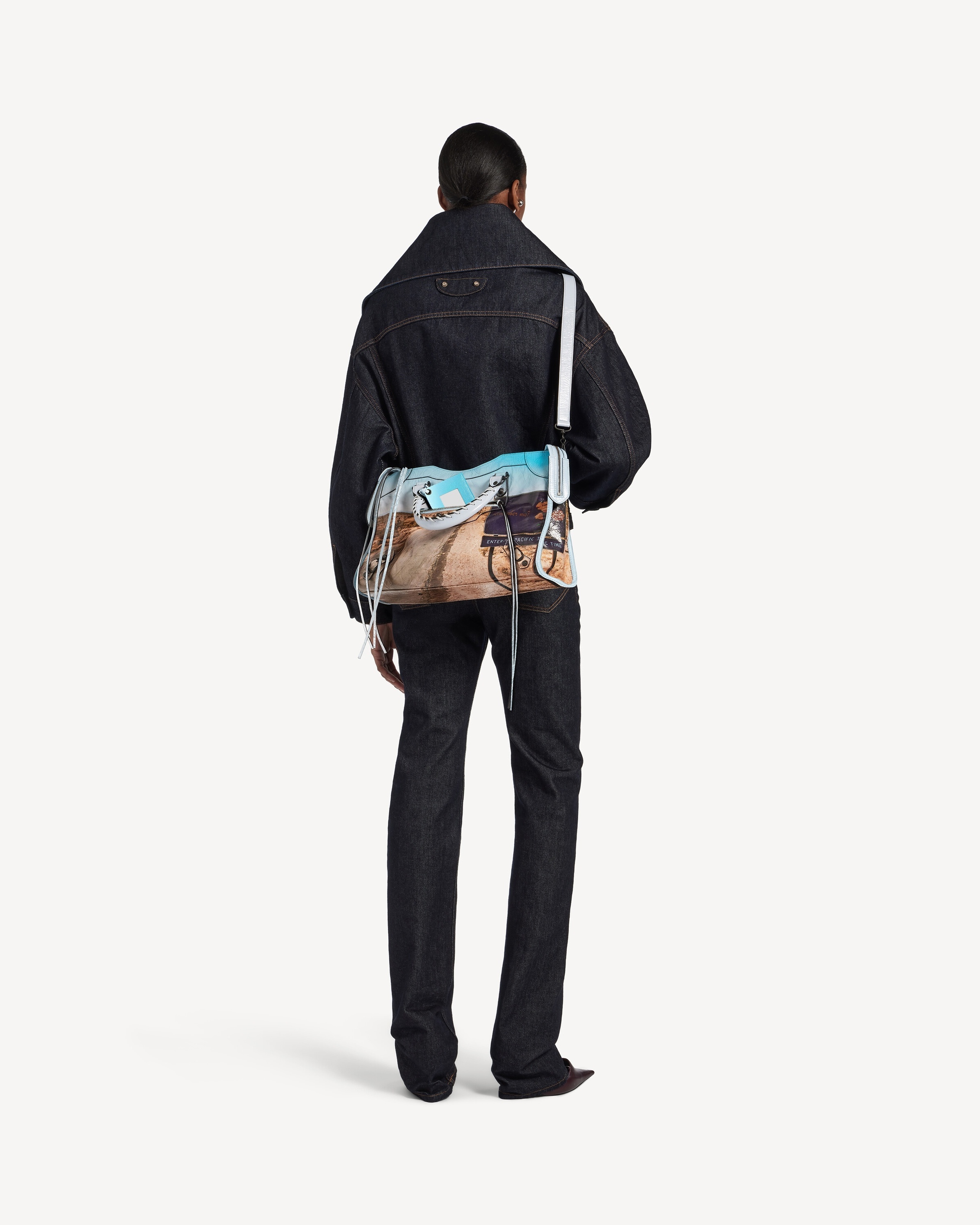 Balenciaga 新款限量版 Le City 机车包将自带褶皱纹理的细纹羊皮革作为「幕布」,通过精细丝印工艺将充满超现实主义色彩的摄影画面定格于包身之上,中号以浅蓝色背景烘托美国西部公路片风格画面,小号采用深邃的海军蓝色背景,呈现赛博朋克风格唇部特写图案。