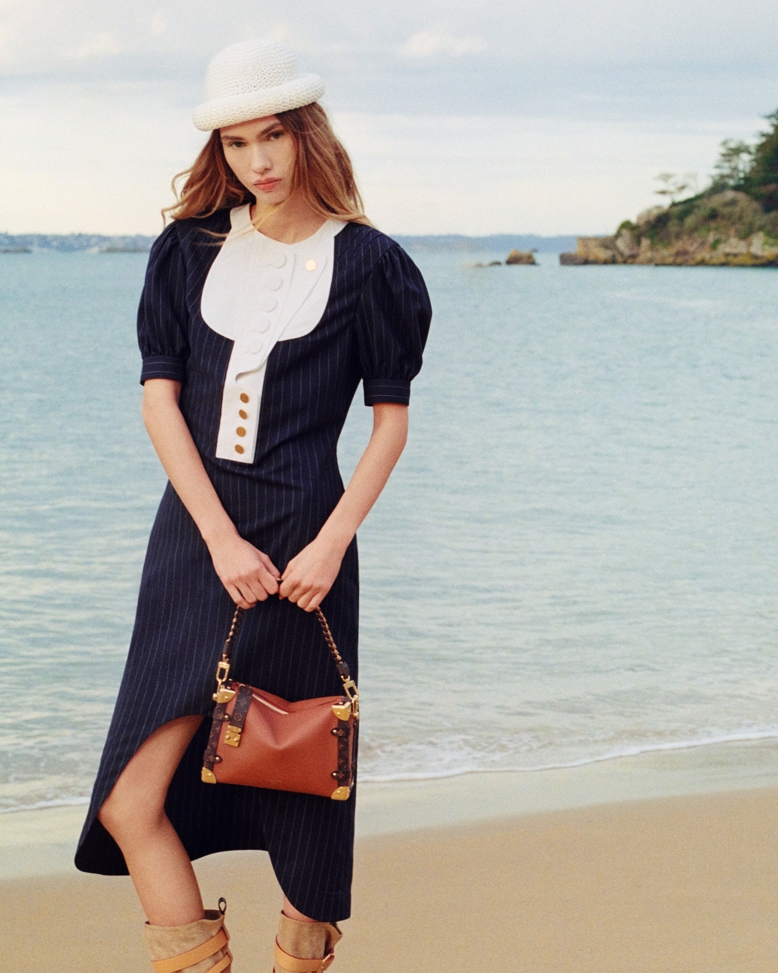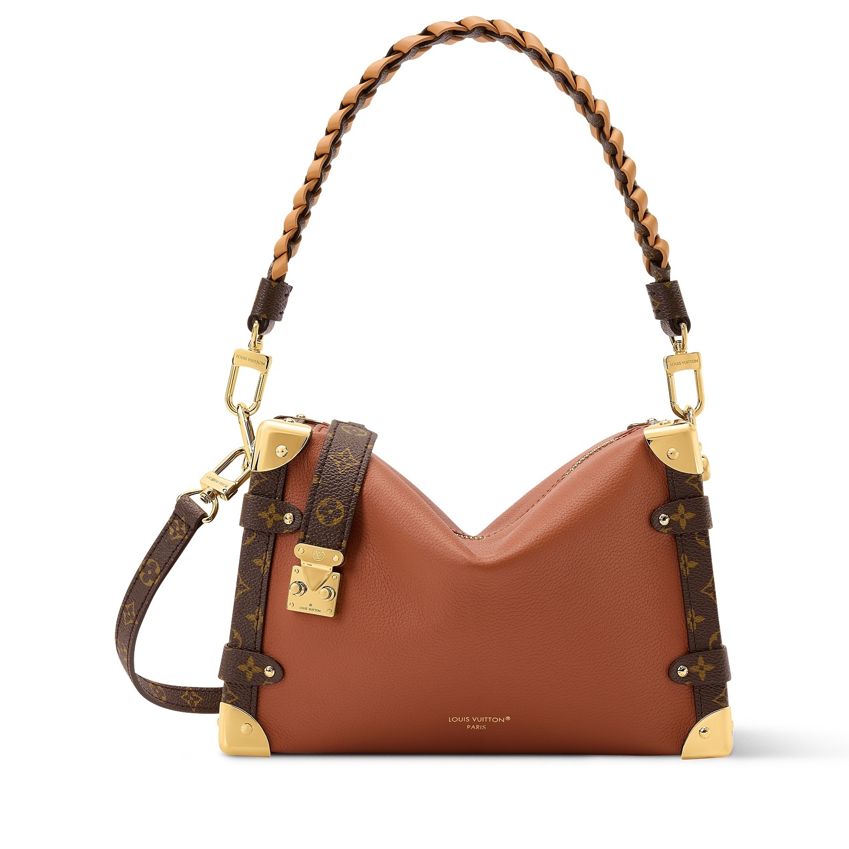 Louis Vuitton 本周上架新款 Side Trunk 手袋,最大亮点是手工编织的可拆卸肩带,采用包身同色系皮革条和 Monogram 帆布交错编织而成,为包包增添匠心细节。中号采用棕色皮革包身搭配棕褐色帆布饰边,小号渲染清爽蓝白色调,经典 S-lock 锁扣与灵感源自硬箱的包角相映成趣,致敬路易威登典藏制箱工艺。