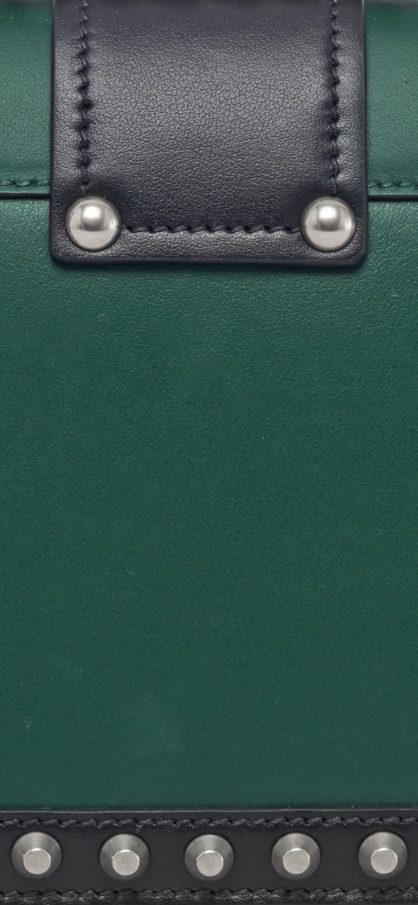 墨绿色小牛皮,黑色牛皮封边,上面是做旧的银色铆钉,古典中又有潇洒和英气。包包的边角由花边金属装饰,让人联想起硬装书的封角。