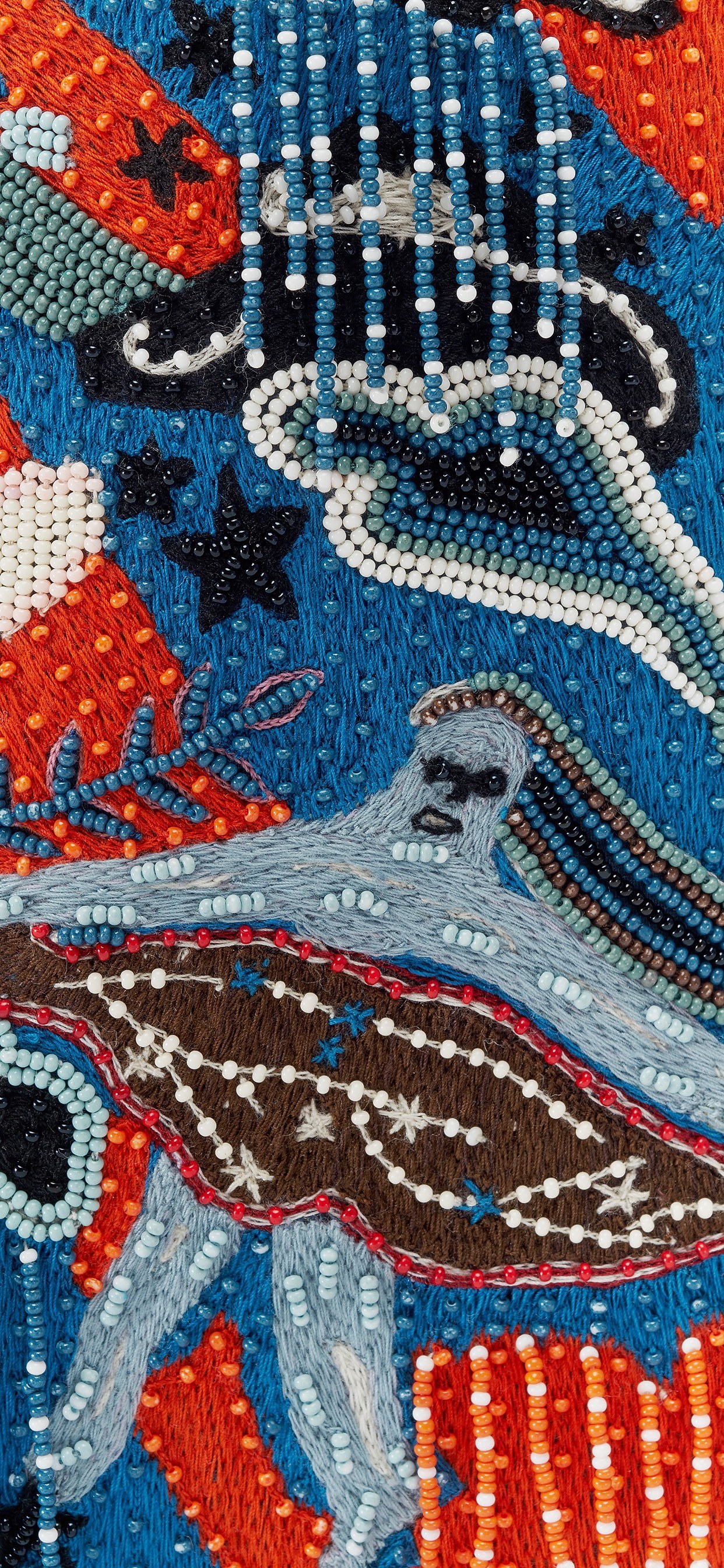 各色圆珠串联出奔跑跳跃的青年剪影、华丽裙摆的舞者、借风飞翔的鸟雀、头带光环的少女等形象,点缀流星、花卉、灵蛇、枝叶等图案。