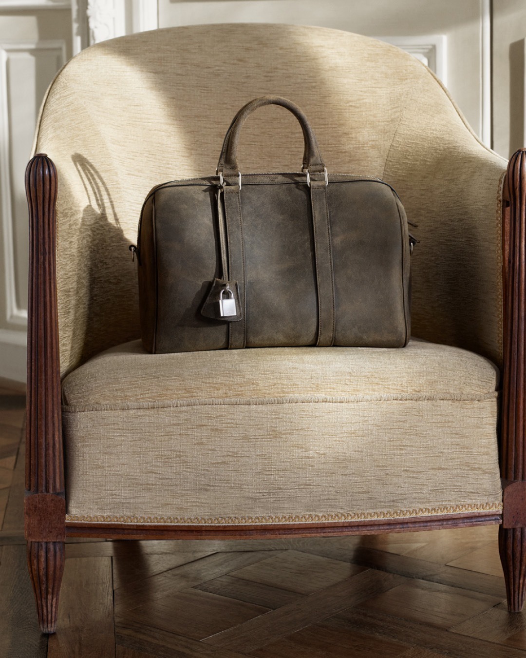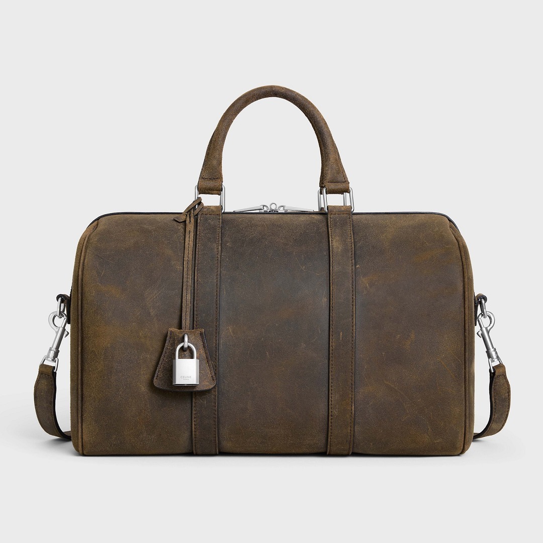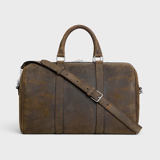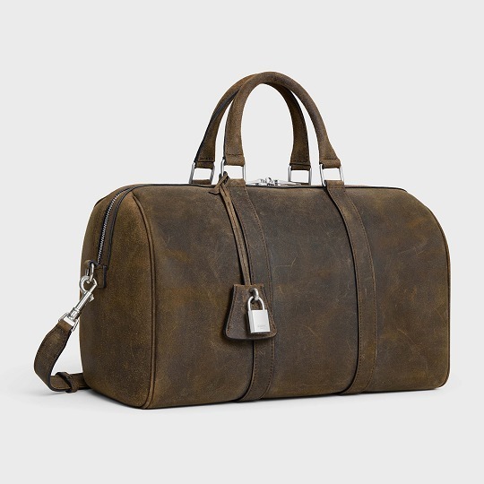新季包袋作品中最引人注意的是这只大号 Boston 手袋,采用棕色仿旧质感蜡染小牛皮塑造经典波士顿包型,斑驳褪色效果仿佛为包包蒙上一层复古胶片滤镜,颇有历经岁月沉淀的韵味。包包里衬为绒面牛皮革材质,搭配银色挂锁和五金配件。