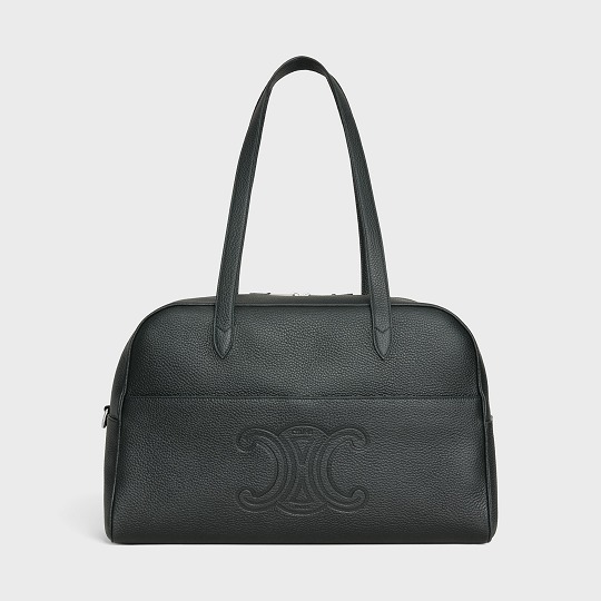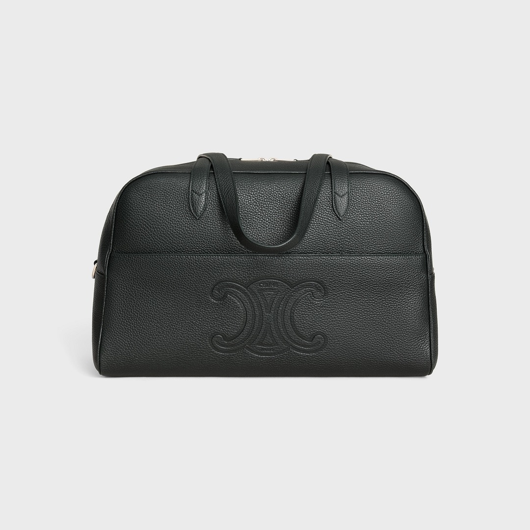 新款 Duffle 旅行包采用坚韧耐用的粒面牛皮革打造袋身,通体渲染深沉的暗绿色调,中央低调压印标志性 Triomphe 凯旋徽标。手袋采用「44x24x18cm」的大容量尺寸,30cm手柄适应手提和单肩2种背法,极简纯色设计无论是短途旅行、出差或是作为健身包都很有型。