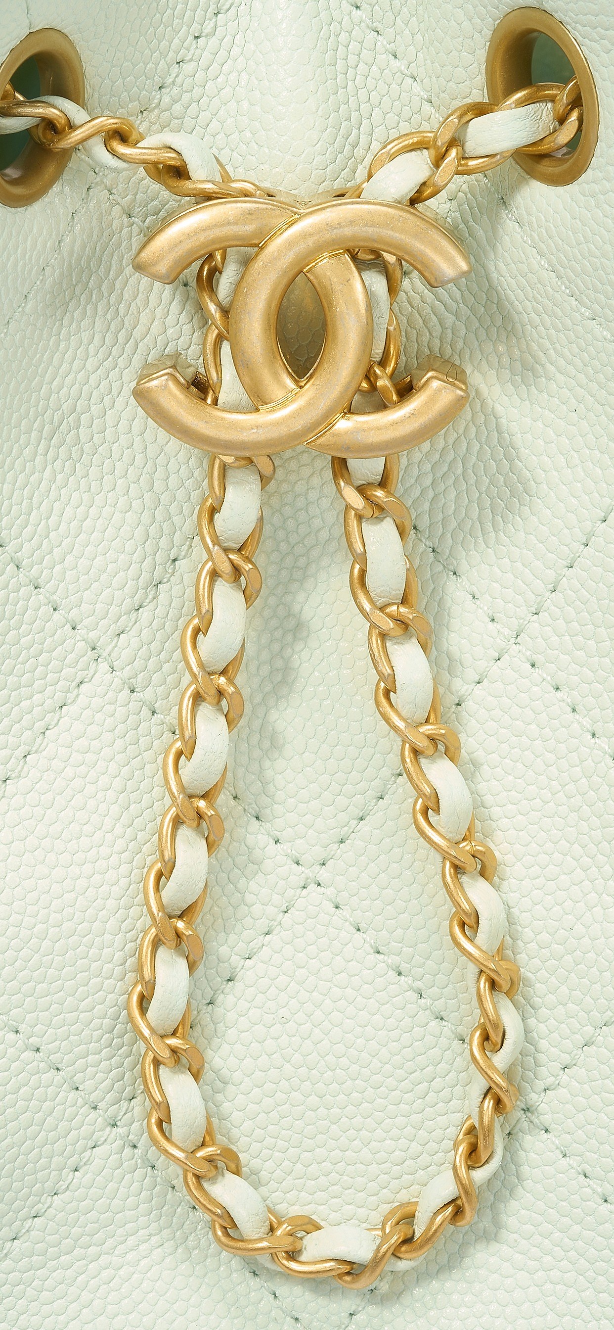包包采用淡绿色颗粒压花小牛皮制作而成,凸起的粒面纹理让包包具有更好的光泽度,弯折后也不易出现折痕或者被刮花磨损,同色车线装点菱格纹理。菱格纹是 Chanel 最经典的设计元素之一,灵感来自马术骑士的夹克,是 Coco Chanel 在观看赛马时萌发的创意。