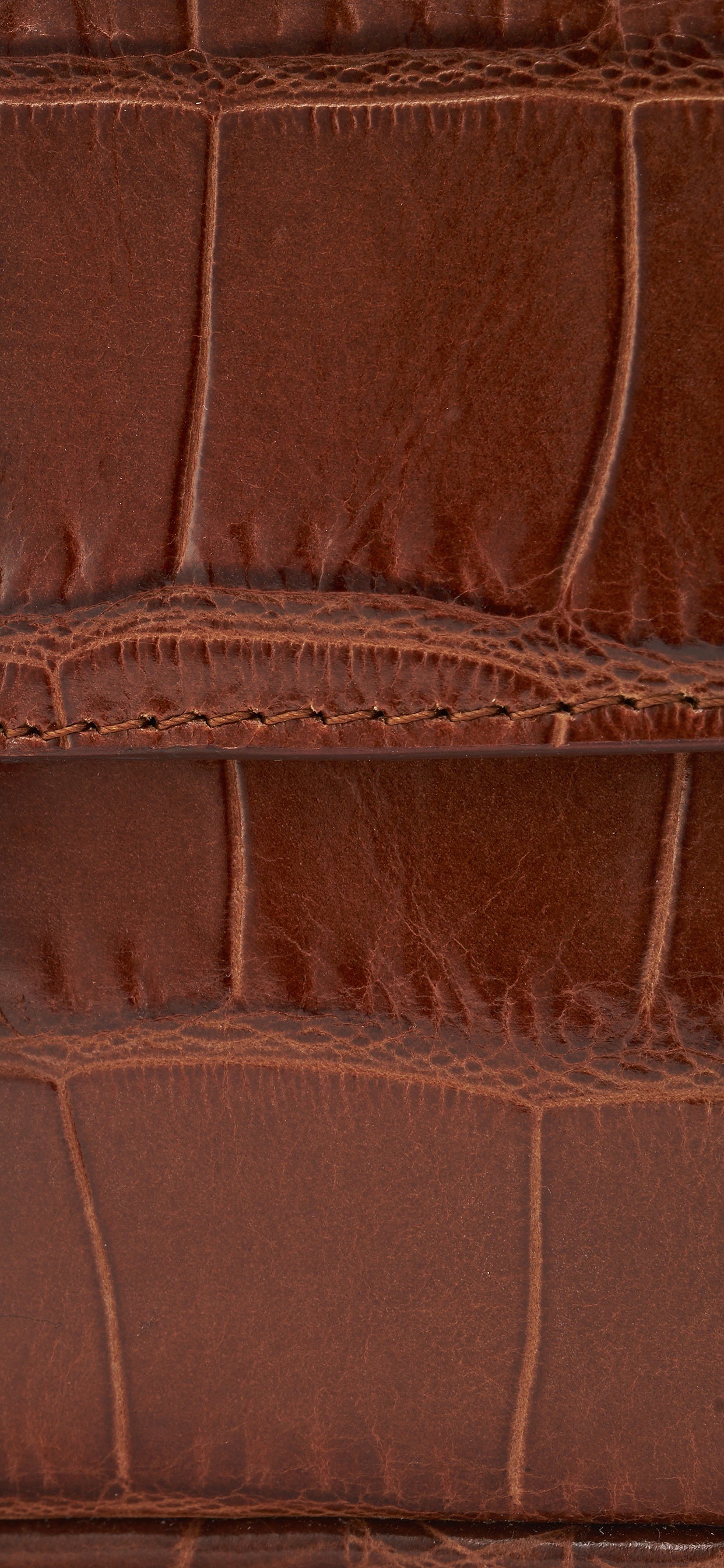 包包的外观是圆润的矩形轮廓,在小牛皮上压印鳄鱼皮纹理,不规则的竹节纹路看起来古朴自然,比规整的格纹更具年代感。