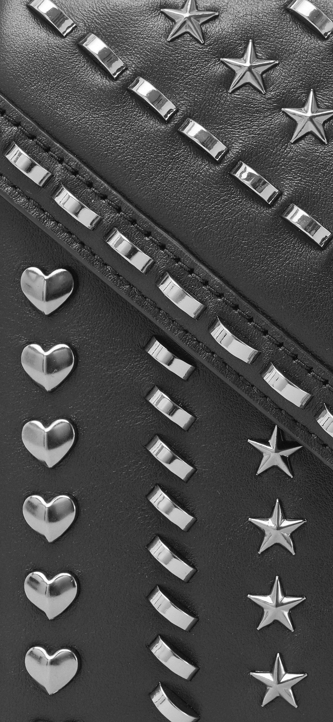 金属铆钉镶嵌在黑色牛皮上,打造出衍缝效果。心形铆钉有着「爱」的美好寓意,而星星铆钉是第一次出现在该系列中。