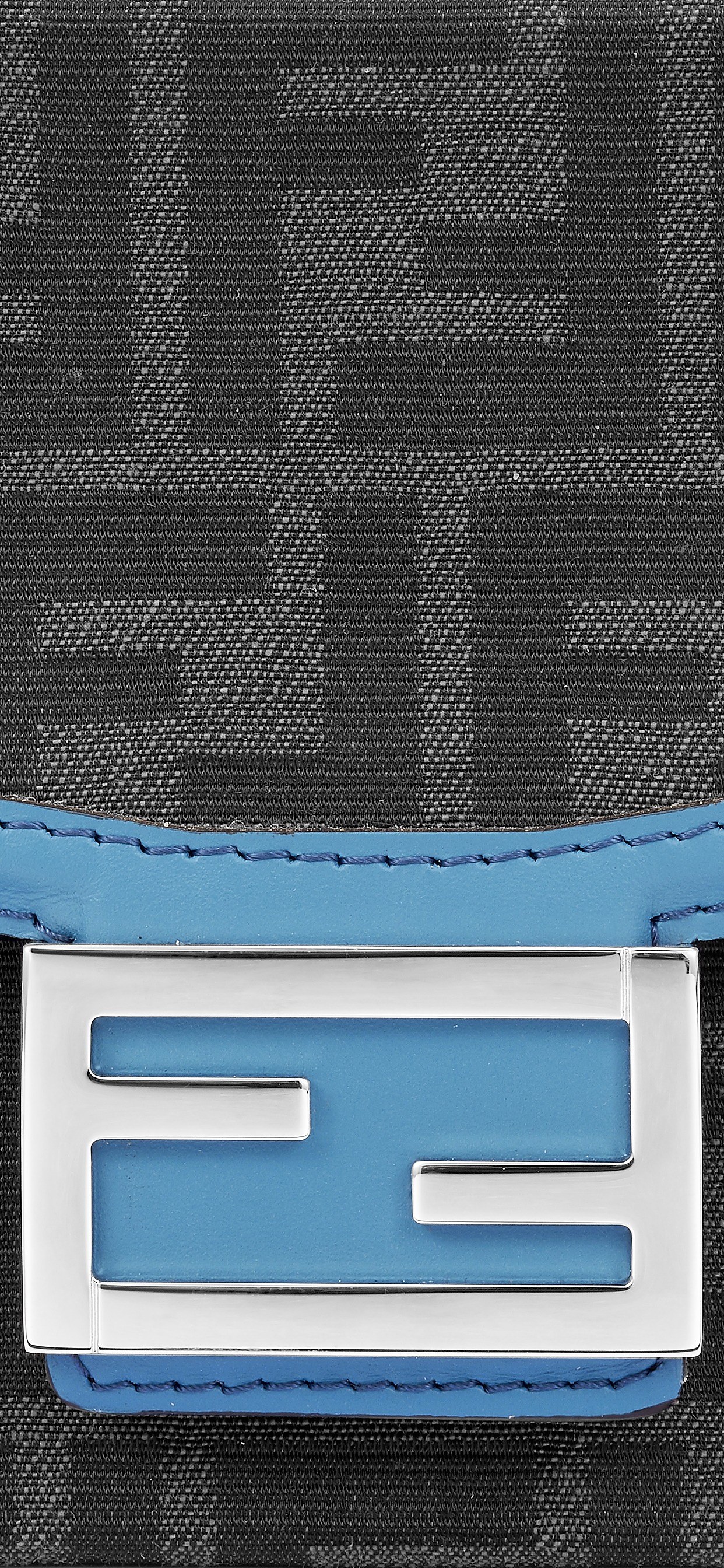 简洁洗练的 FF 磁扣是这只包包上最引人注意的细节,选用银色饰面钯金属材质打造,与蓝灰色包身相呼应。